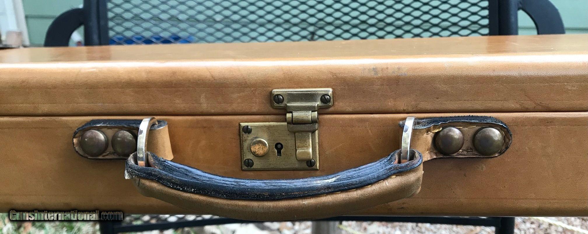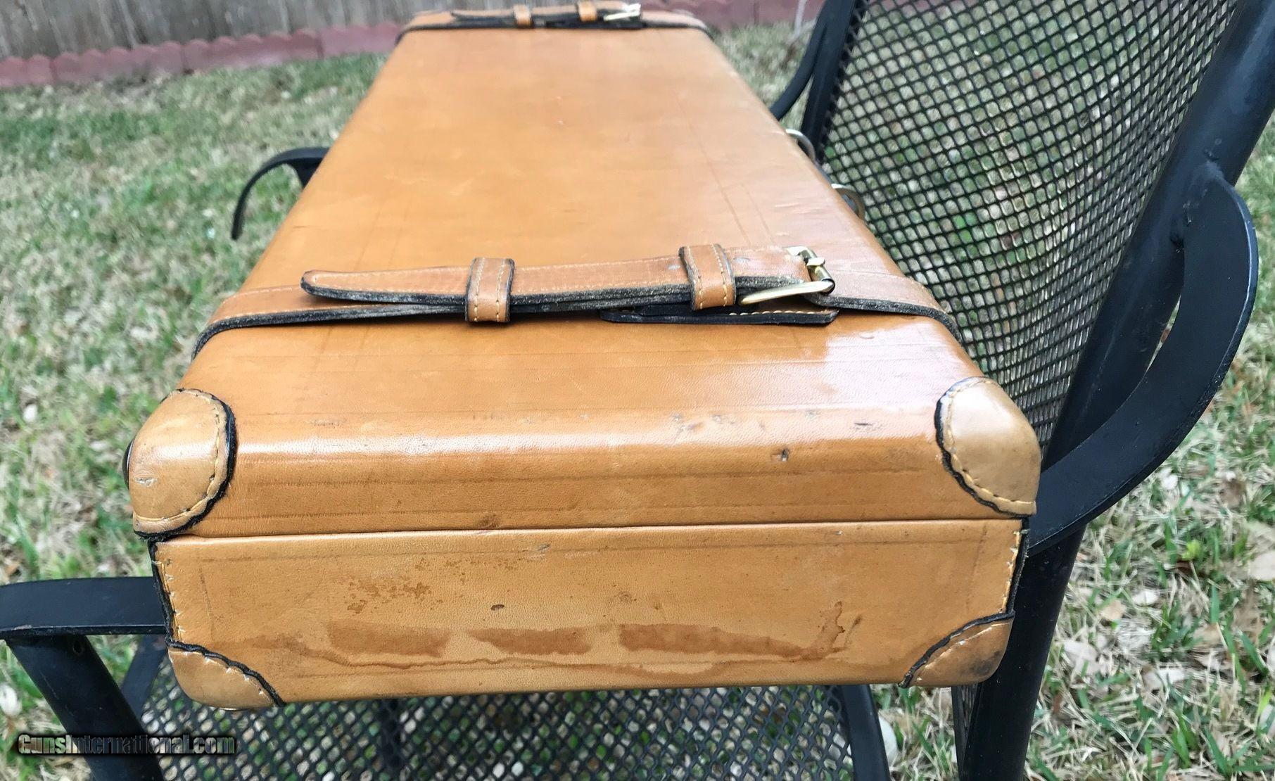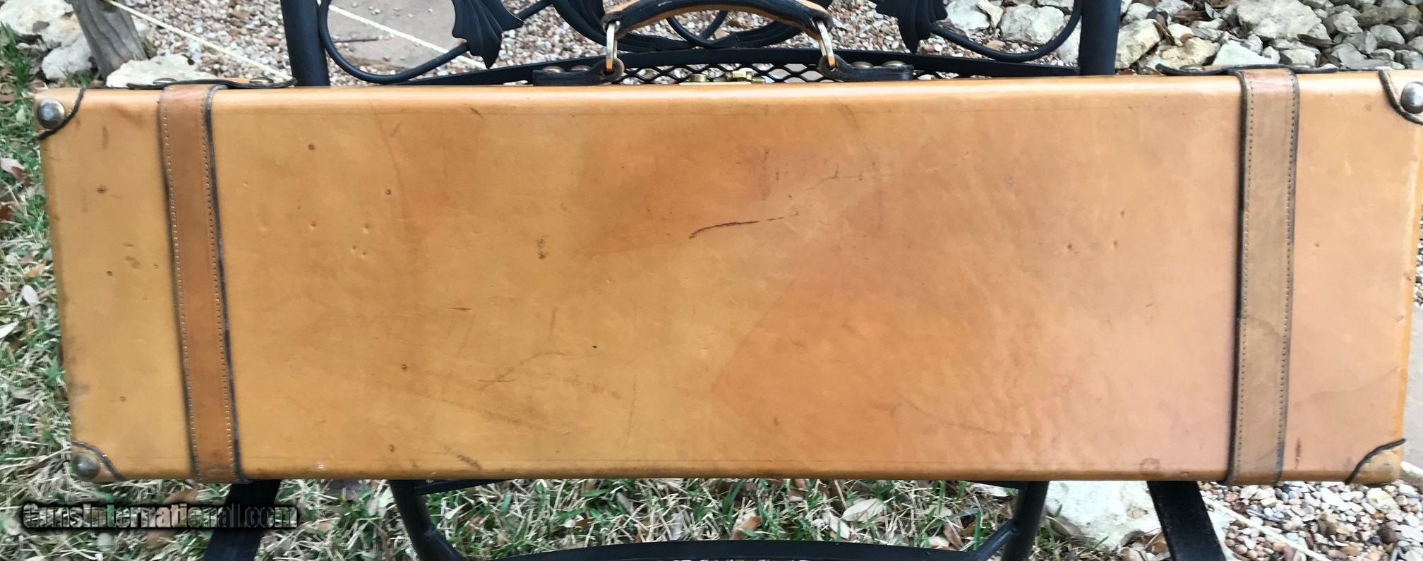 Description: Up for sale is a 1980's Nizzoli full leather case for a SxS shotgun. This case is in sound condition, the front clasp works, the straps are solid, the handle is secure, and the interior wrist strap works. There is no key. The interior is lined in a rich velour fabric. Accessories included are: 12 ga snap caps, round oil bottle, 3 piece rosewood cleaning rod with three 12-ga attachments. The leather label has been removed but can be re-glued or the trade label of your choice attached. The exterior leather contains several nicks, bruises, and scratches however nothing is deep. The stiching is in great condition. The interior is soiled in several places but there are no tears or fabic missing. This case is fit for a 12-ga or smaller SxS with barrels up to 29" in length. Exterior dimensions are 30-1/4" long, 9" wide, 3-1/4" high. Leather Nizzoli cases are only supplied with the finest guns and today run well north of $2000 new. SOLD |