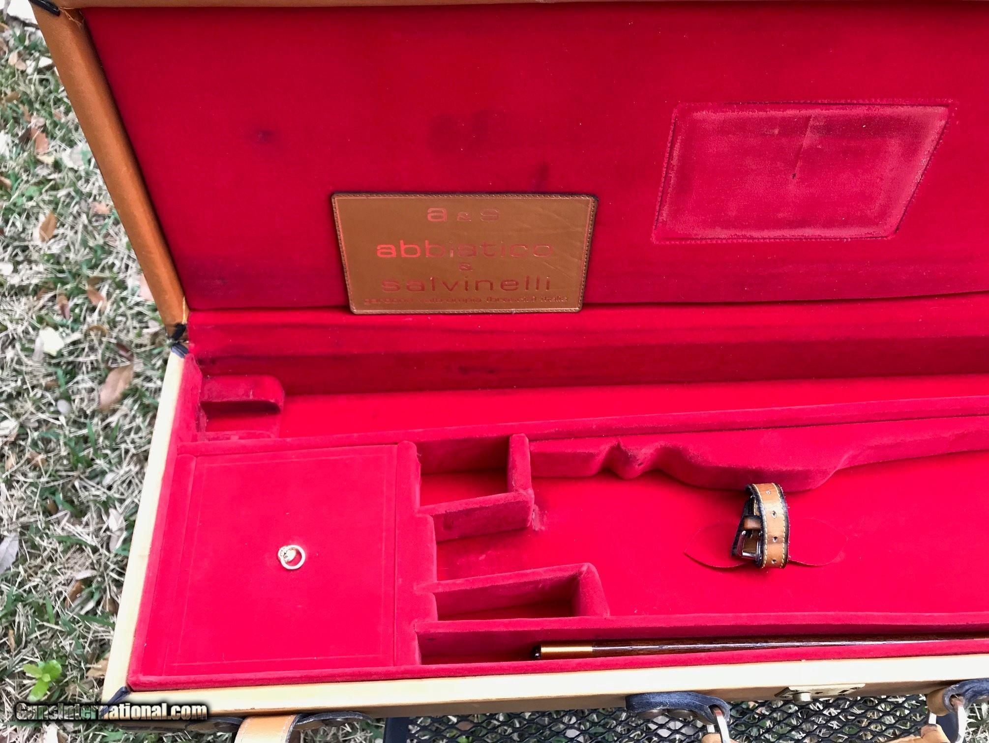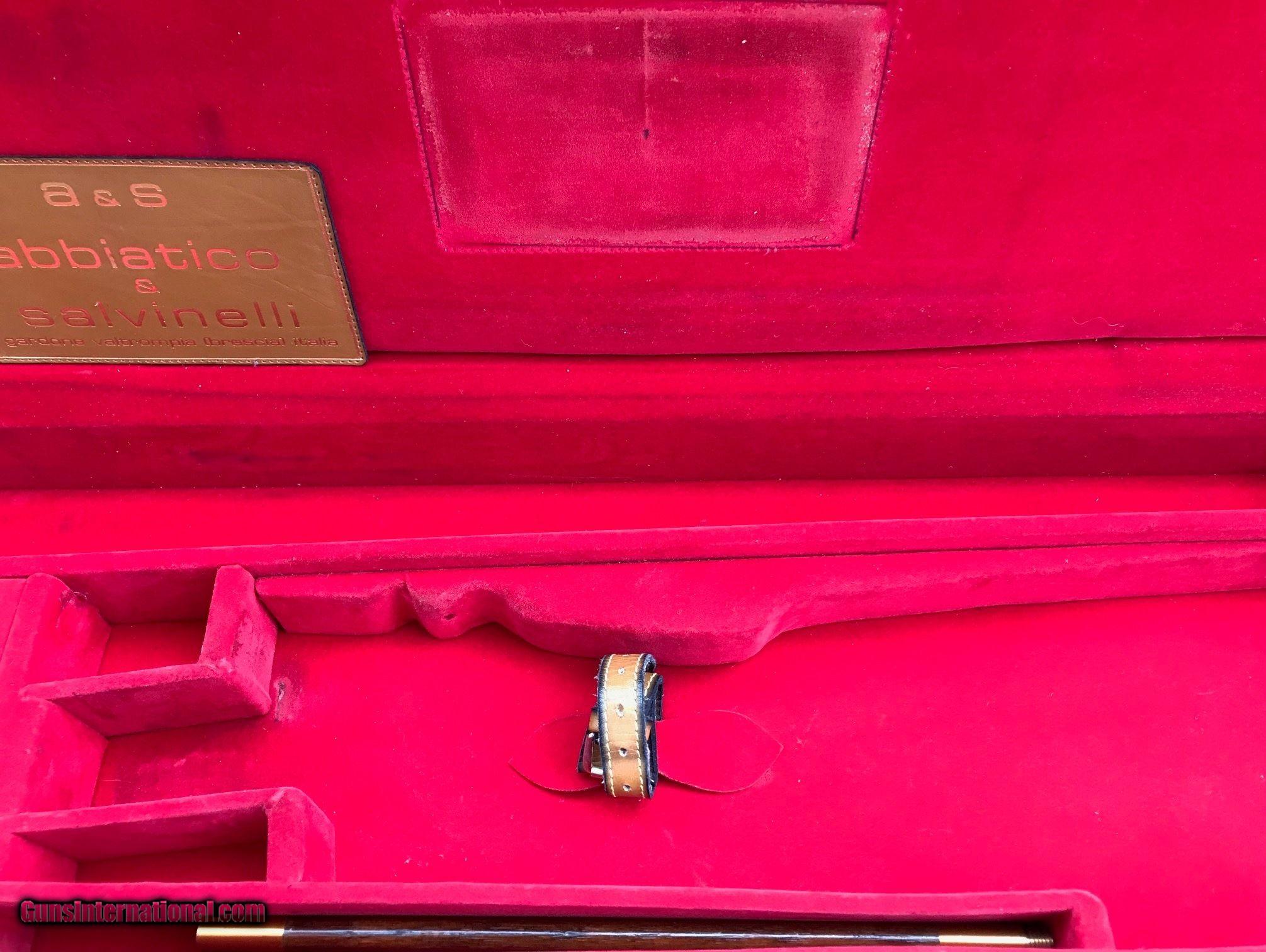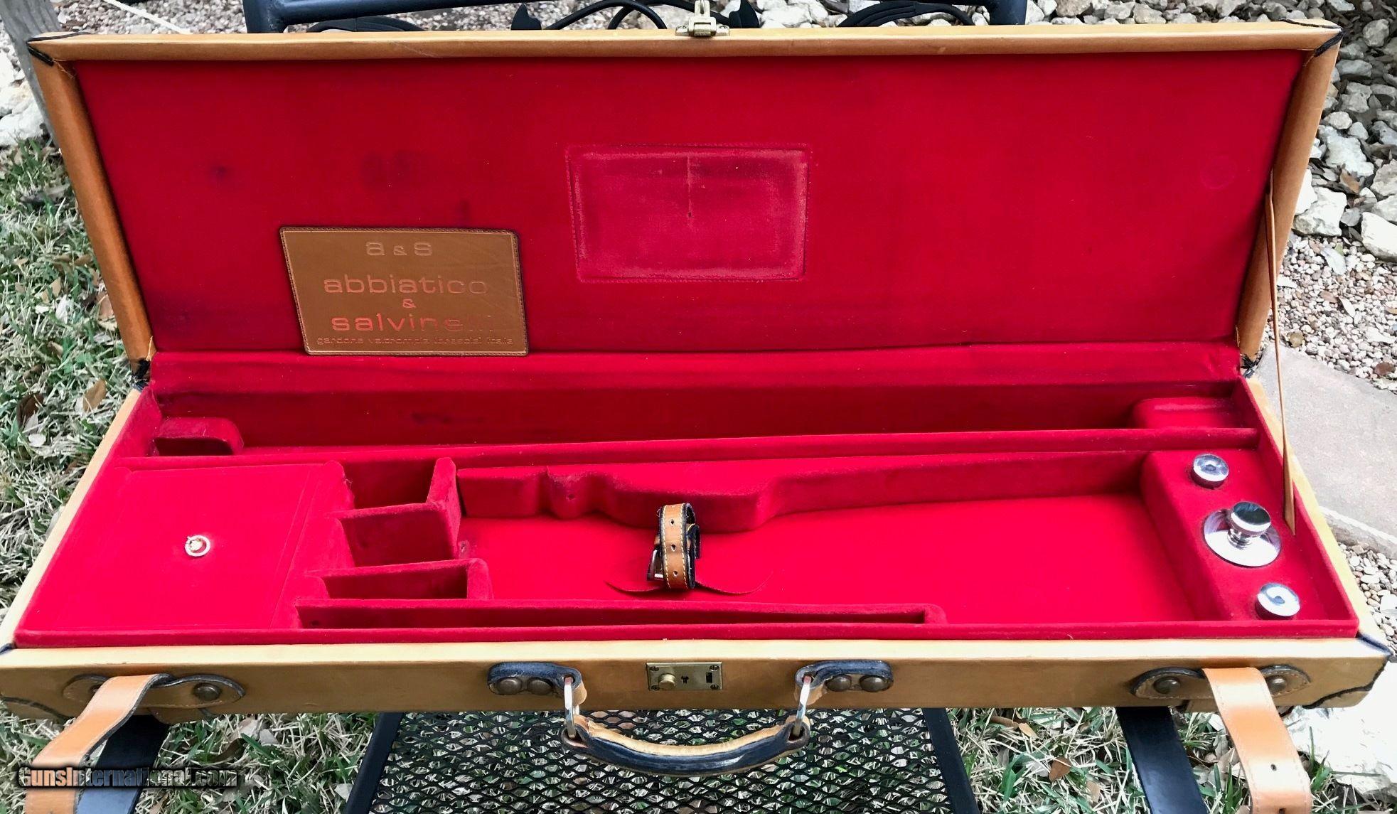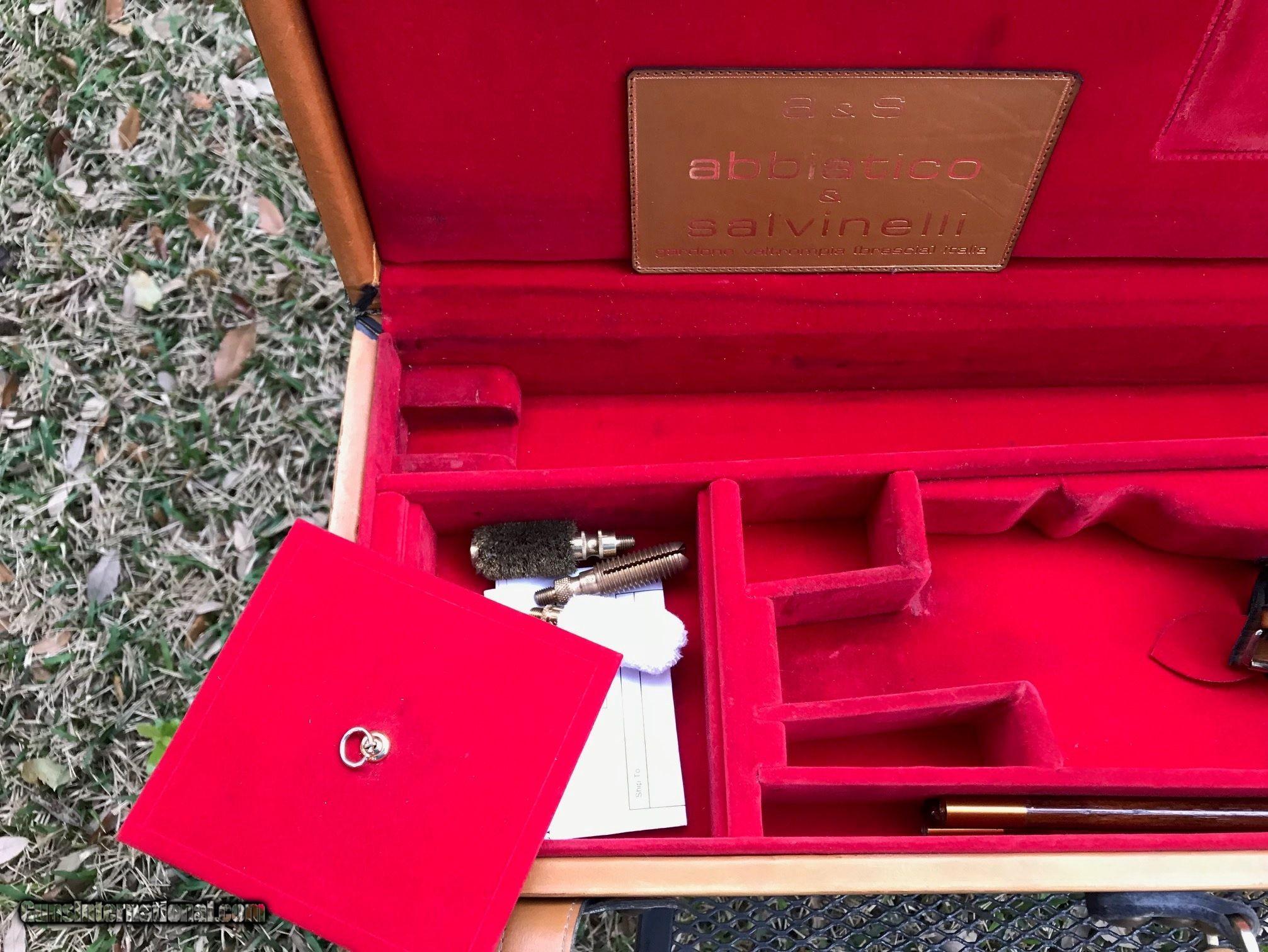 Description: Up for sale is a 1980's Nizzoli full leather case for a SxS shotgun. This case is in sound condition, the front clasp works, the straps are solid, the handle is secure, and the interior wrist strap works. There is no key. The interior is lined in a rich velour fabric. Accessories included are: 12 ga snap caps, round oil bottle, 3 piece rosewood cleaning rod with three 12-ga attachments. The leather label has been removed but can be re-glued or the trade label of your choice attached. The exterior leather contains several nicks, bruises, and scratches however nothing is deep. The stiching is in great condition. The interior is soiled in several places but there are no tears or fabic missing. This case is fit for a 12-ga or smaller SxS with barrels up to 29" in length. Exterior dimensions are 30-1/4" long, 9" wide, 3-1/4" high. Leather Nizzoli cases are only supplied with the finest guns and today run well north of $2000 new. SOLD |