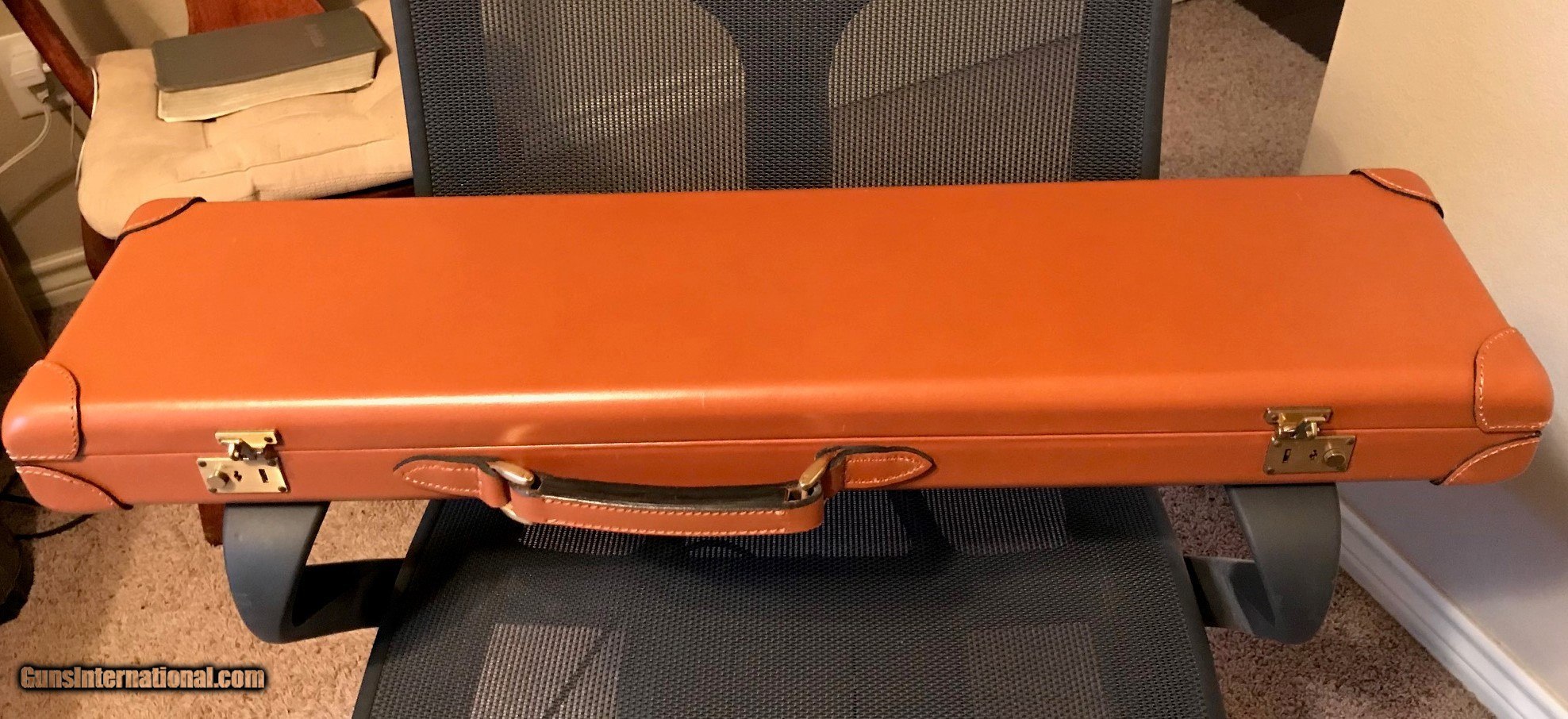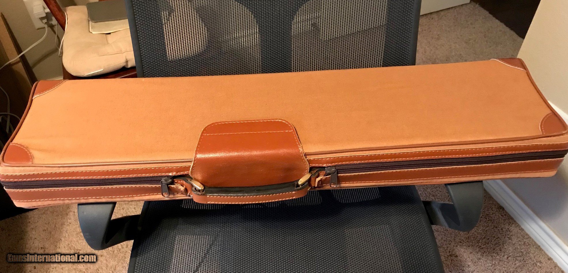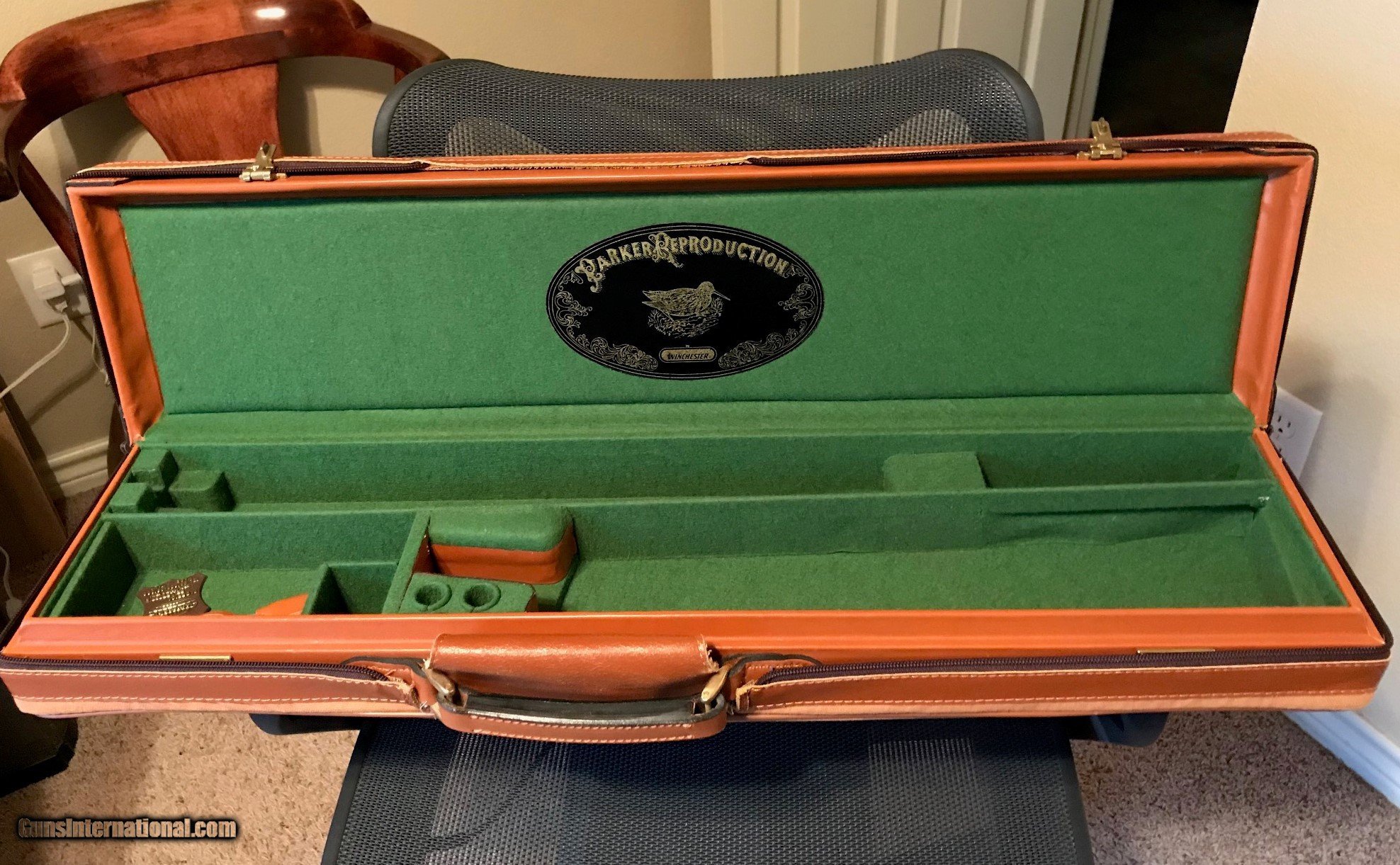 Description: Sold Pending Funds - - - Parker Reproduction leather case with outer cover for a 20/28 gauge with 26" or 28" barrels in excellent condition. Includes the original keys and leather holder. SOLD |