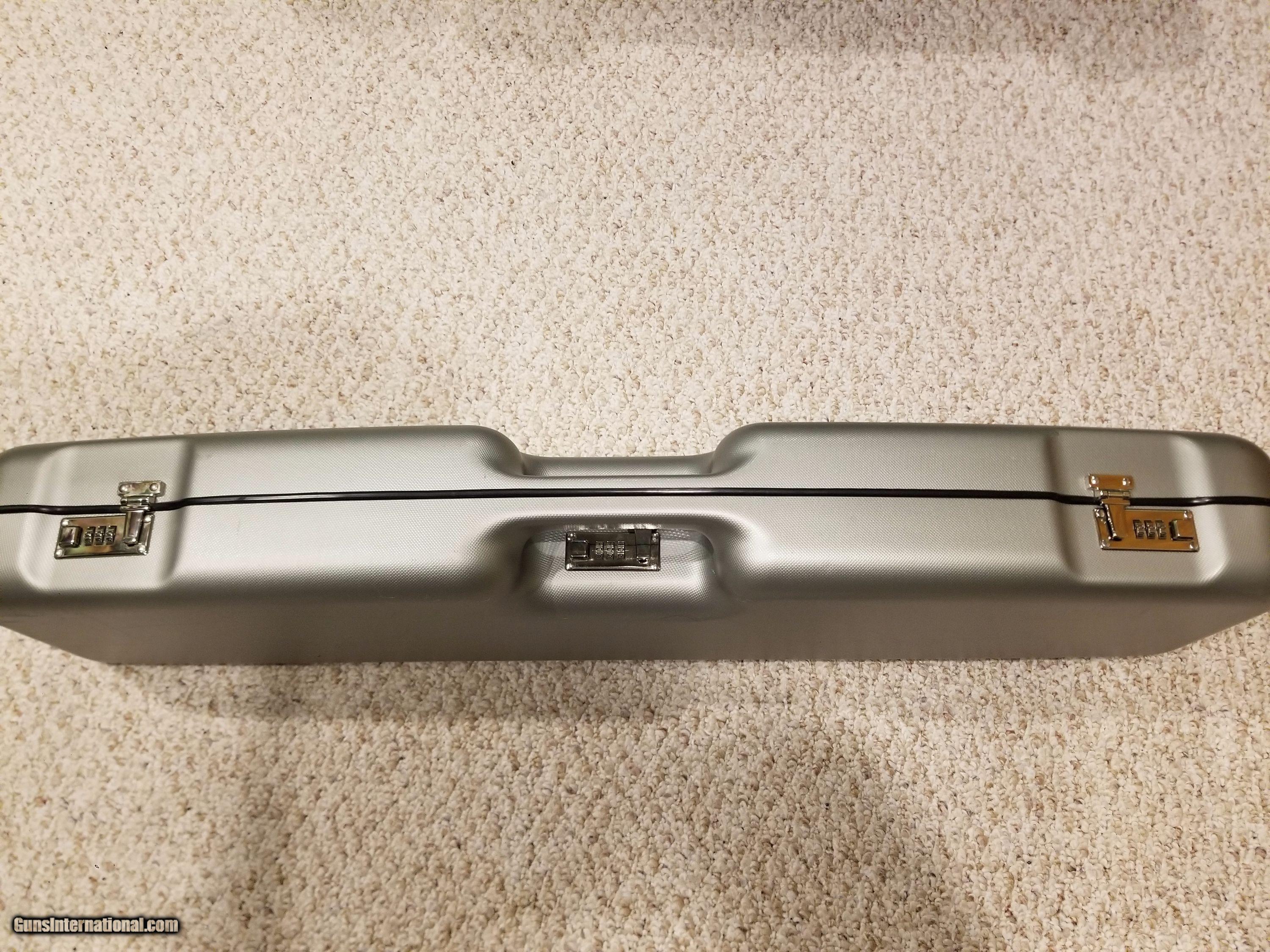 Description: Perazzi velour lined 2barrel factory hardcase. Clamshell style case that holds an over and under reciever and stock on one side and 2 barrels and forends on the other protected by a padded divider with room for chokes and accessories. Case has 3 combination locks to keep your gun safe. This is a lightly used case in very good condition. SOLD |