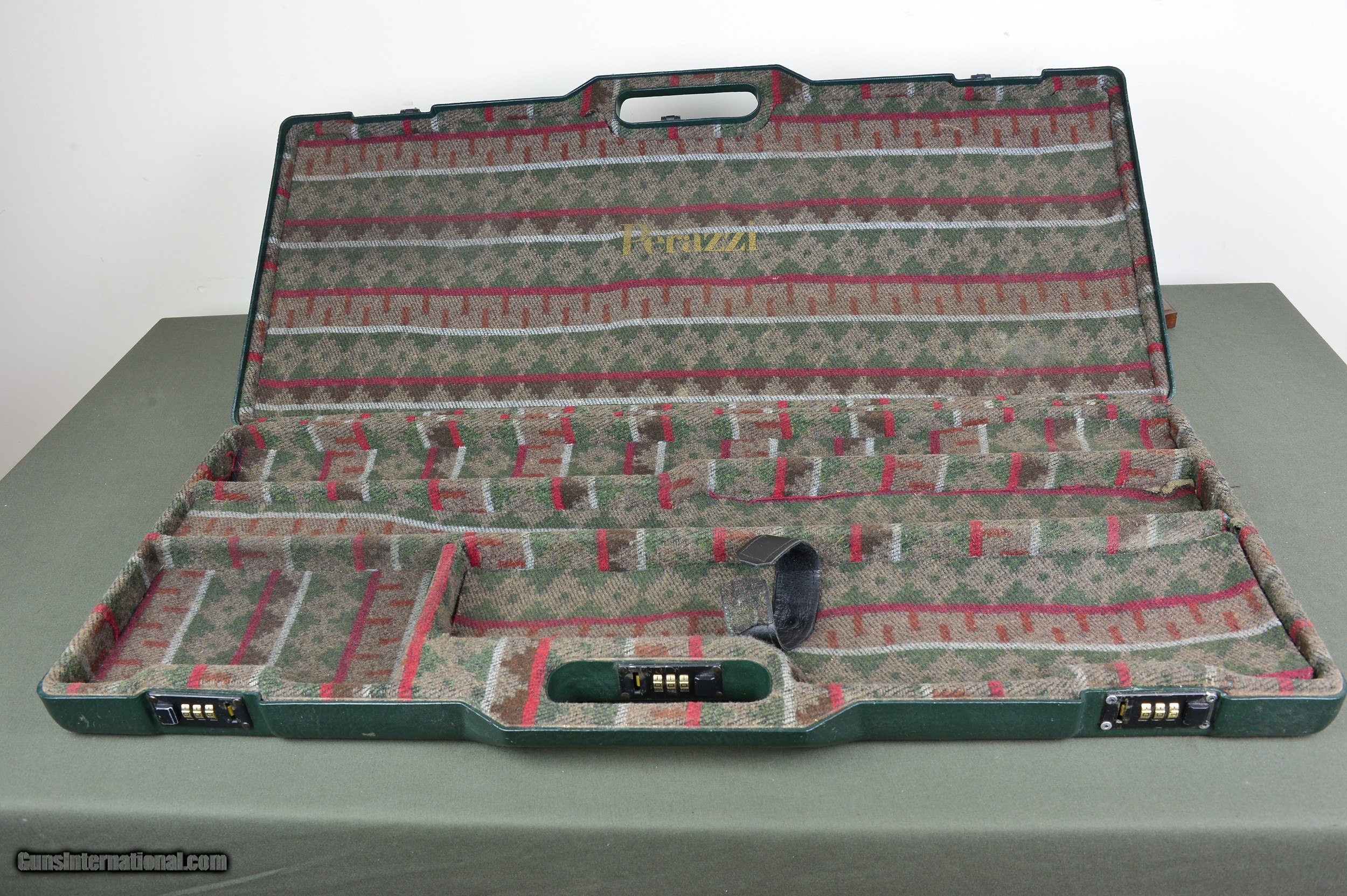 Description: SOLD Nice condition Perazzi factory case for gun and two barrel sets. Accommodates one gun with two Over/Under or Side-By-Side barrel sets up to 30" in length. Green ABS exterior with Perazzi multi-color interior and Perazzi logo on interior top lid as well as exterior top lid. Three combination locks to keep your gun securely in the case. Exterior Dimensions are: 31-1/2" by 13" by 3-1/2" Width goes to 14" when you allow for the handle. Flat fee of $25 shipping and insurance to Lower 48. Three day inspection. Return at buyer's expense. Payment by US Postal Money Order or Cashier's Check only. SOLD |