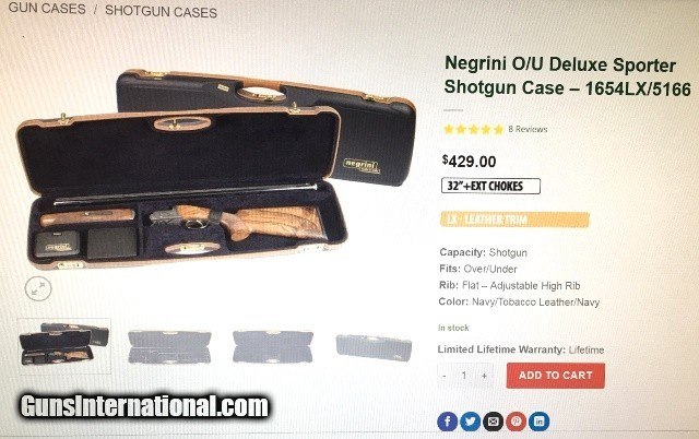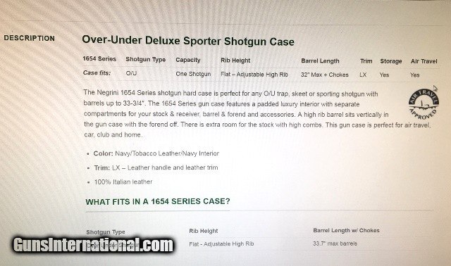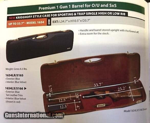 Description: NEGRINI MODEL 1654LX/5166 BLUE EXTERIOR, TAN LEATHER TRIM, BLUE VELVET INTERIOR "KRIEGHOFF" STYLE with seperate forend storage.Very upscale negrini case with leather trim. It is the EXACT model shown in catalog shown in photos please see EXACT DIMENSIONS IN PHOTOS (see pictures and is as new condition, never used just not new price! Look at the room for your barrels-no need to remove chokes. THIS is the case. From negrini these run $429 + shipping. Ill take $325 and Ill PAY for shipping if you paypal using friends family. Any questions please just ask August, Owner AMC Fine Guns 512-567-PULL (7855) SOLD |