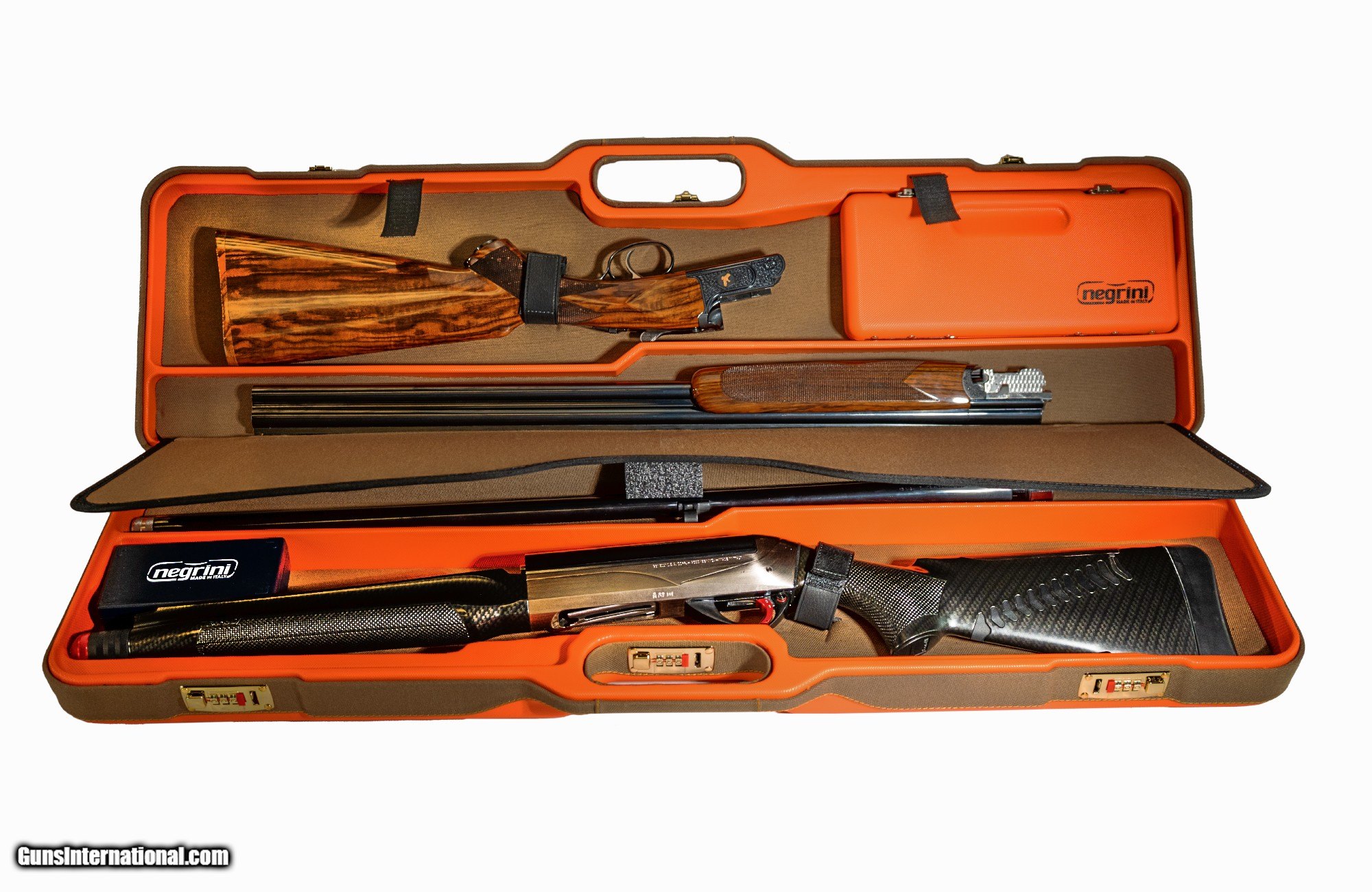 Description: Negrini WINGS Khaki Blaze Two Autoloader 32 Shotgun Travel Case -1677LXP/6274 There is nothing like the Negrini Wings 1677LXP Double Shotgun Case. Travel to your next hunting/shooting destination with your SXS, O/U, and/or Semi-auto and Pump shotguns. The two shotgun case easily converts and adapts to any type of shotgun. Just Remove the accessory box to convert the case from an O/U to an Autoloader shotgun hard case. The dual shotgun UNICASEs ultra-strong double wall construction consists of a thick thermoformed ABS outer case welded to a rigid inner ABS case with fully cushioned plush velvet materials. The patented double wall construction assures maximum shock absorption without losing the integrity of the cases construction. With hardened steel locks and hinges that are recessed to prevent damage from airport conveyor belts. It features separate compartments for stock and receiver, barrel and forend as well as removable accessories boxes. All materials used are certified to not gas out or corrode firearms. Includes ICC Limited lifetime warranty. Fits two Semi-auto and/or Pump shotgun cases. Fits Low to Rib Barrels Add an Accessory case to fit over under or Side-by-side shotguns About Negrini Gun Cases Negrini gun cases are designed with an ultra-strong double-wall ABS construction, which consists of a thick thermoformed ABS outer case welded to a rigid thermoformed inner case. Negrini gun cases are fully cushioned and lined with plush velvet or microfiber. Negrini gun cases' patented double wall construction assures maximum shock absorption without breaking. Each gun case is fitted with hardened steel combination locks and hinges. The locks are recessed to prevent gun case damage on conveyor belts. Negrini gun case interiors are designed with separate compartments for stock and receiver, barrel and forend as well as accessories. All Negrini gun case materials used are certified to not outgas or corrode firearms. Many colors are available. Limited lifetime warranty. International air travel certified Hardened steel combination Locks for security 100% Made in Italy Lightweight air travel without all the extra baggage fees Limited Lifetime Warranty Manufacturer: Negrini Model: 1677LXP/6274 Condition: New Barrel Type: Over and Under, Semi Rib: Flat Rib Weight: 12 lbs Price: $690.00 Contact Seller |