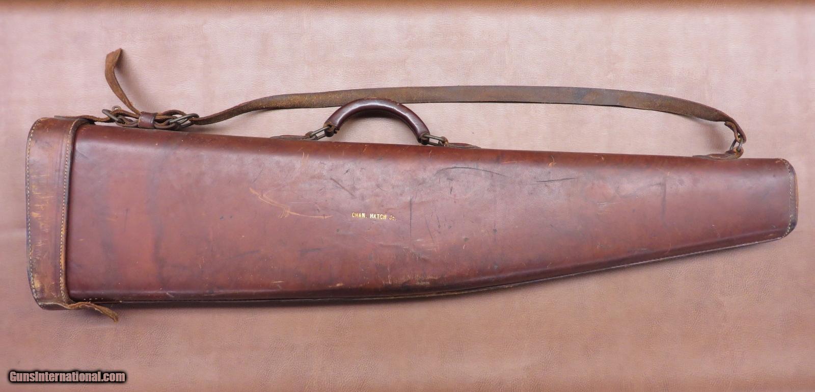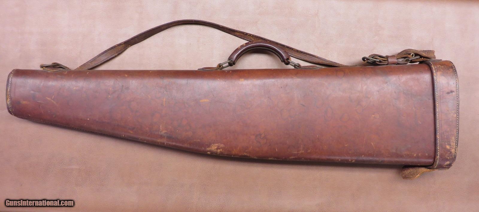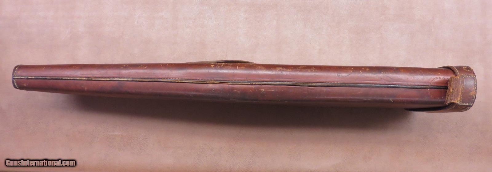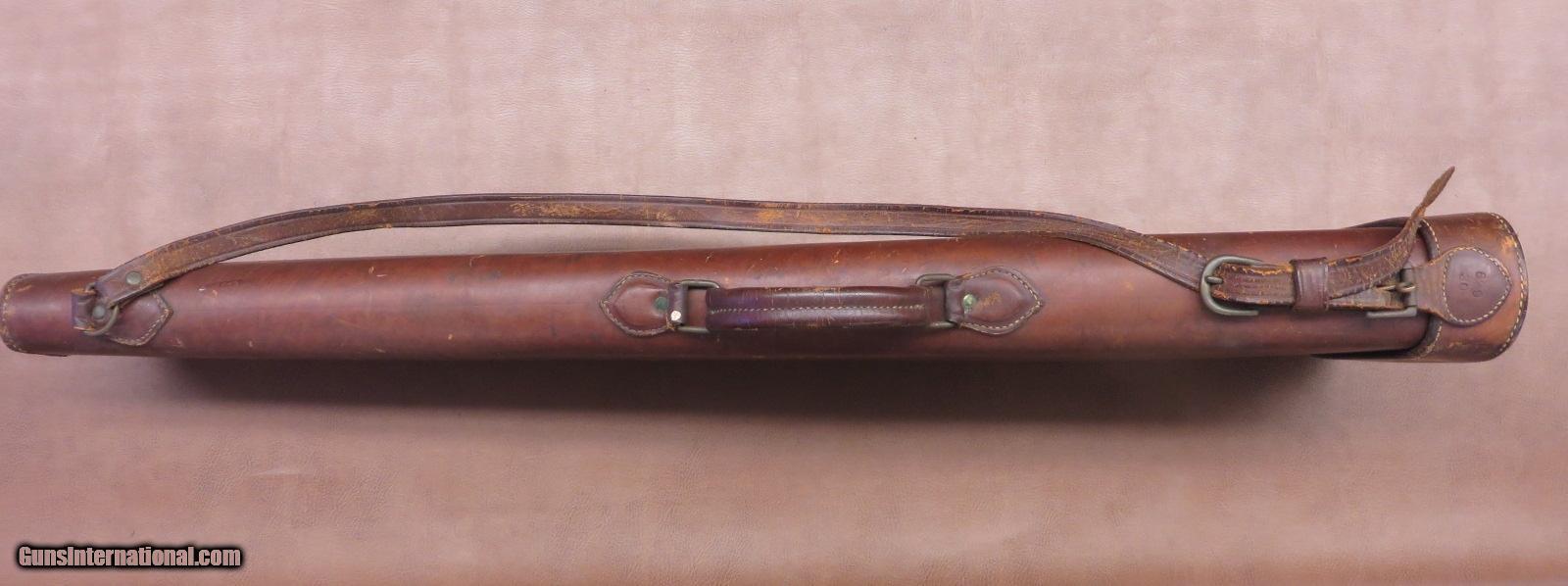 Description: Leather takedown case measuring 34 inches long inside. Handle, latch, and strap in good shape. Stitching on the hinge has come loose. SOLD |