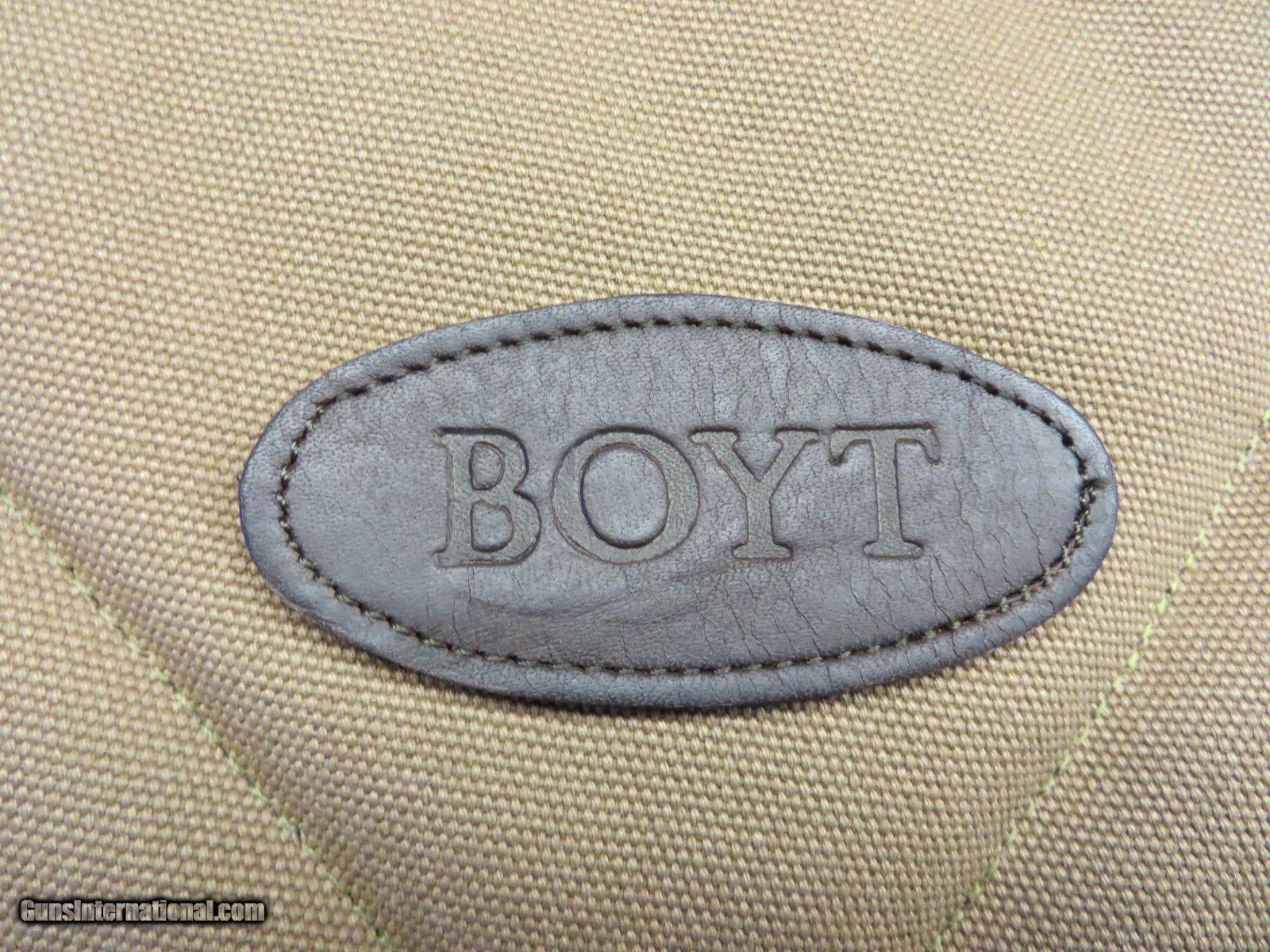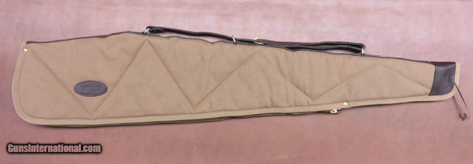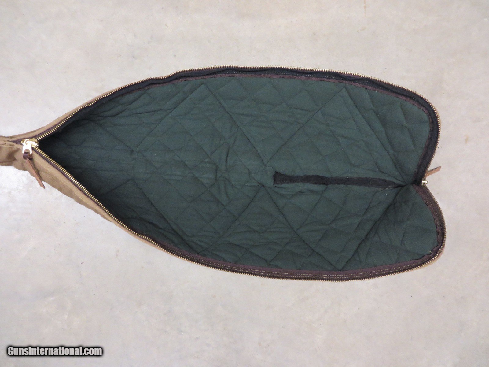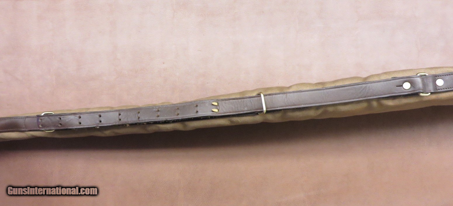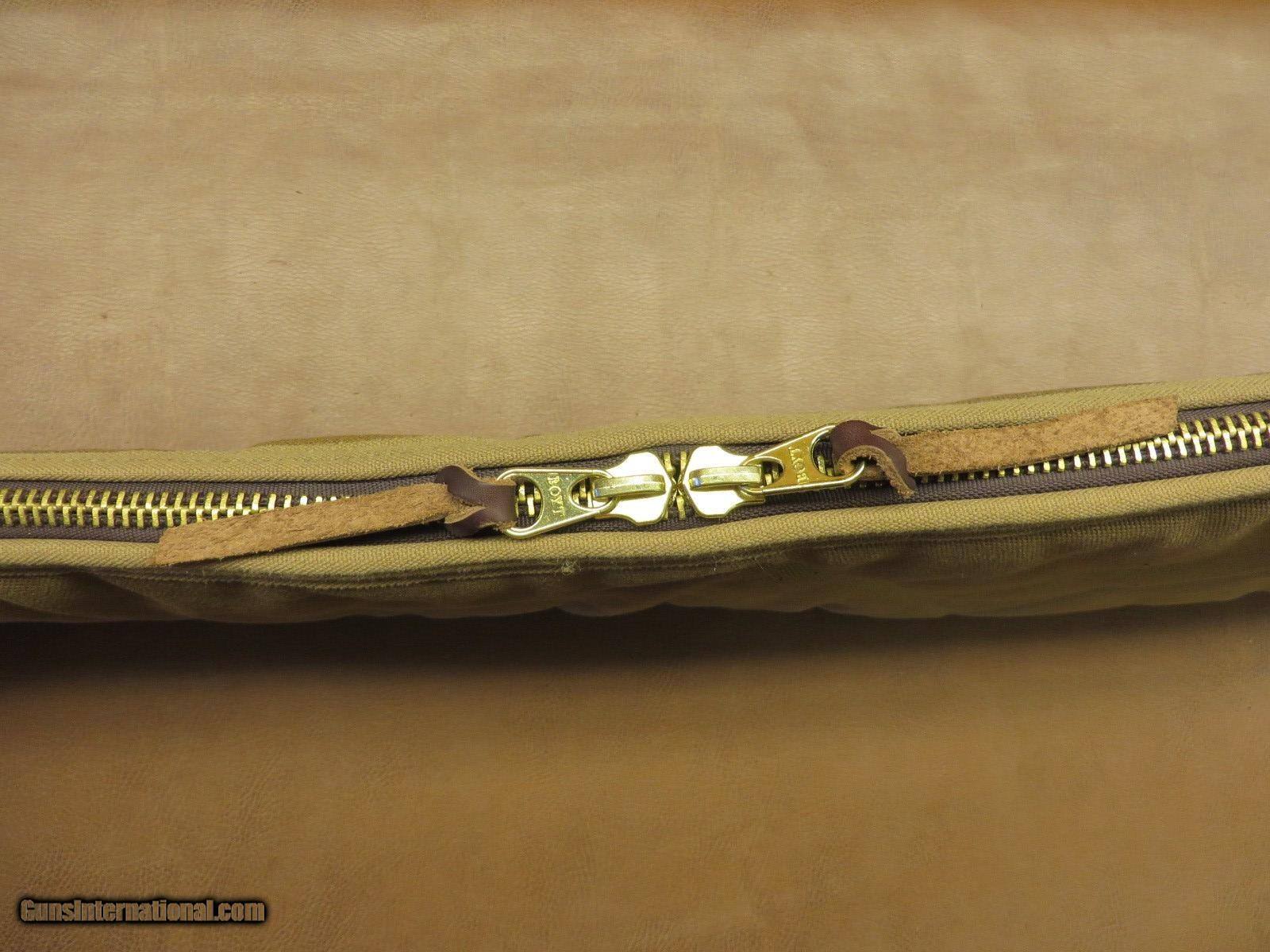 Description: Heavy canvas case with leather binding and sling, heavy duty two way brass zipper, and quilted flannel lining. Holds scoped rifle up to 44 inches long. New SOLD |