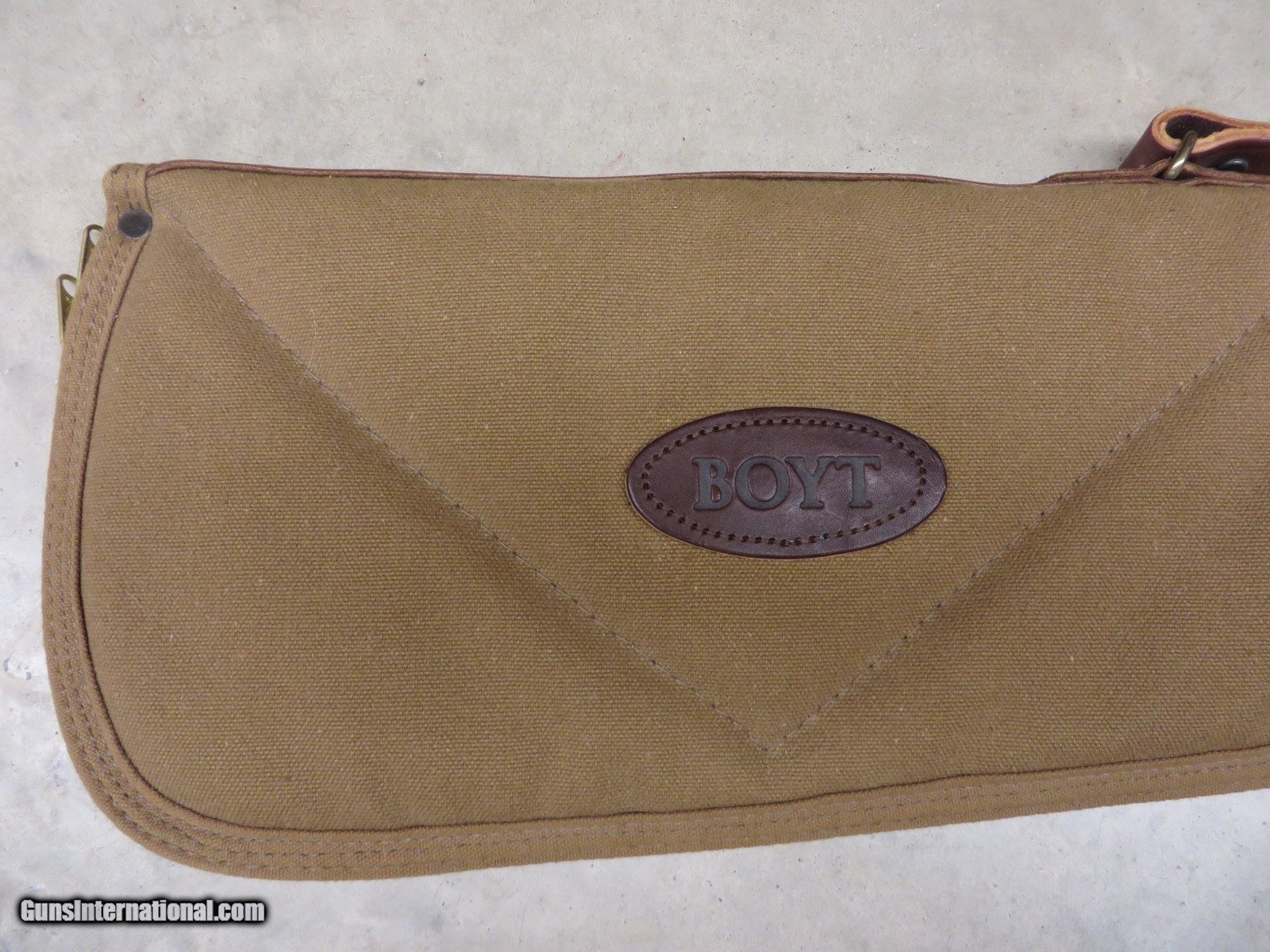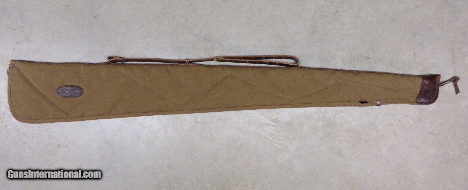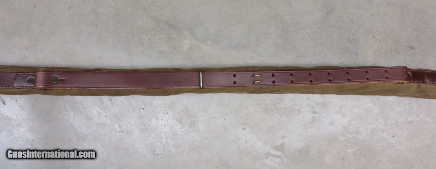 Description: Heavy canvas case with leather binding and sling, heavy duty two way brass zipper, and quilted flannel lining. Holds shotgun up to 52 inches long. Excellent used condition. SOLD |