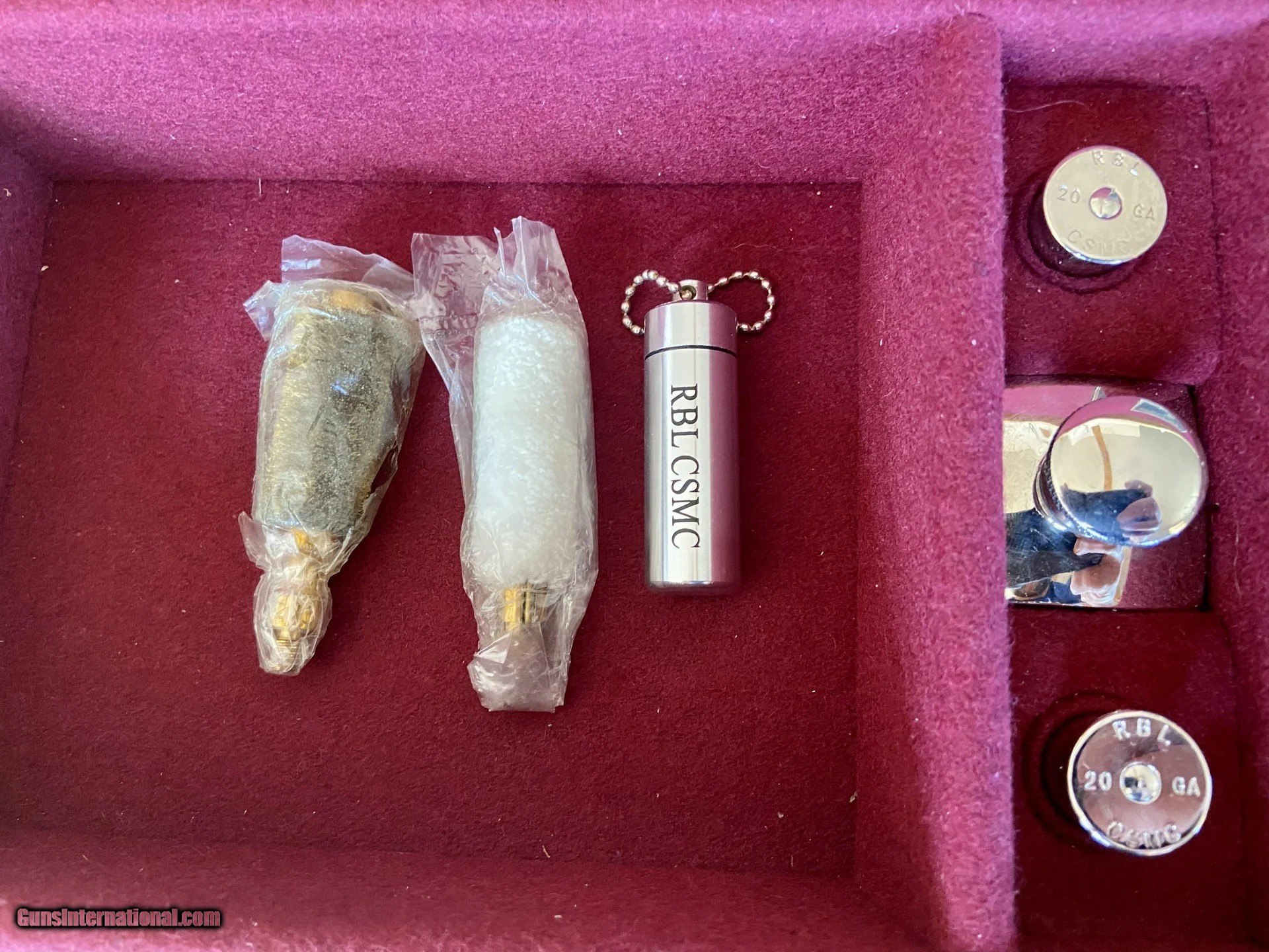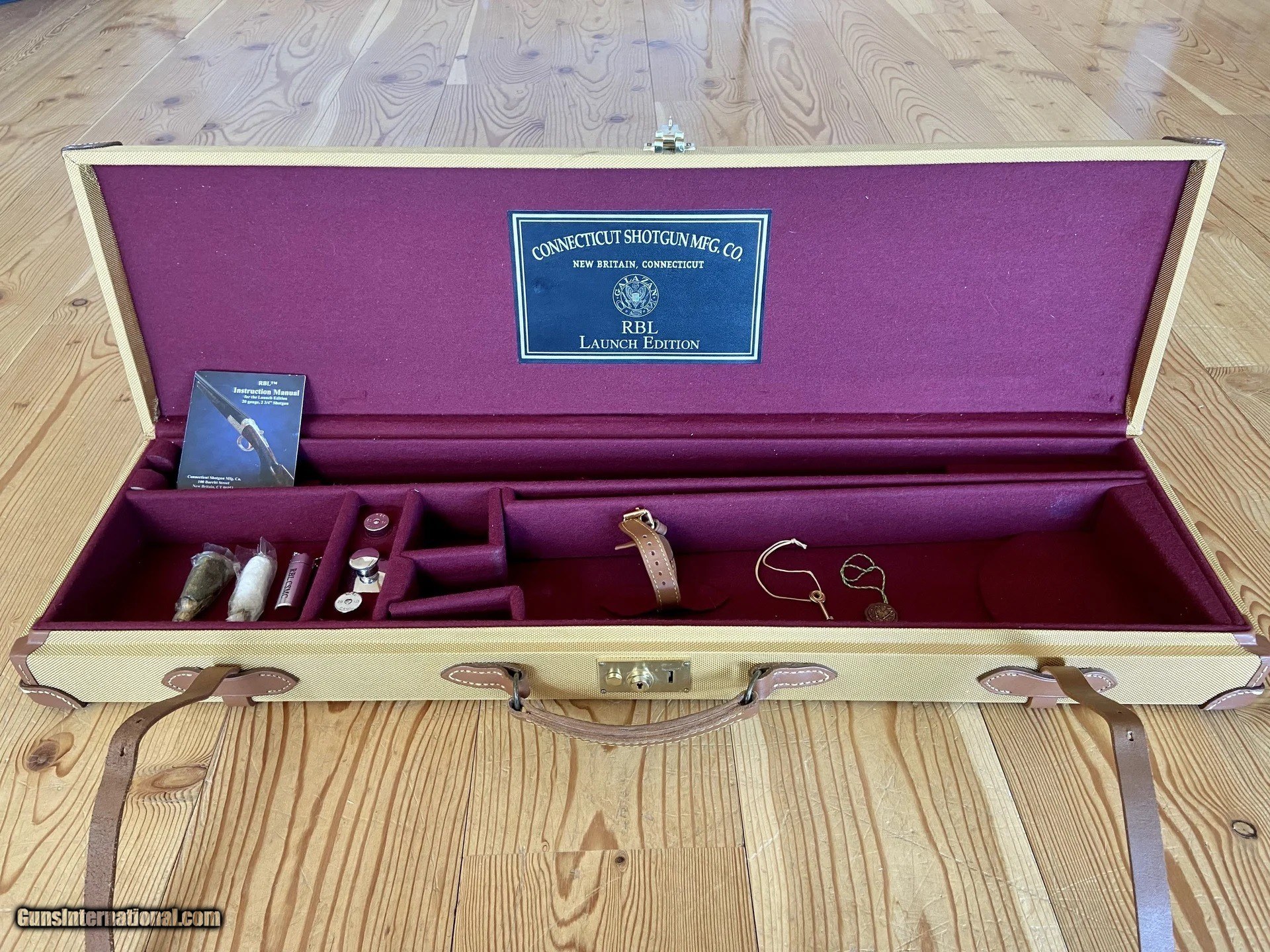 Description: Connecticut Shotgun Manufacturing Company/Galazan- Canvas and Leather SxS Case for 20ga RBL "Launch Edition" with all 20ga Accessories. The accessories include: Square nickle plated oil bottle, 2 piece rosewood cleaning rod, wool mop, bronze brush, a pair of nickel 20ga RBL snap caps, CSMC RBL ear plugs w/ nickel container. Also includes original RBL Launch edition owners manual. Case is used, but in great condition. Interior, hinges, and leather nearly perfect. Some minor wear and very light staining on exterior canvas from being stored and transporting gun. Price for this case from CSMC is $325, plus $30 for RBL leather patch, and $150 for the accessories. Total: $505 before tax and shipping. SOLD |