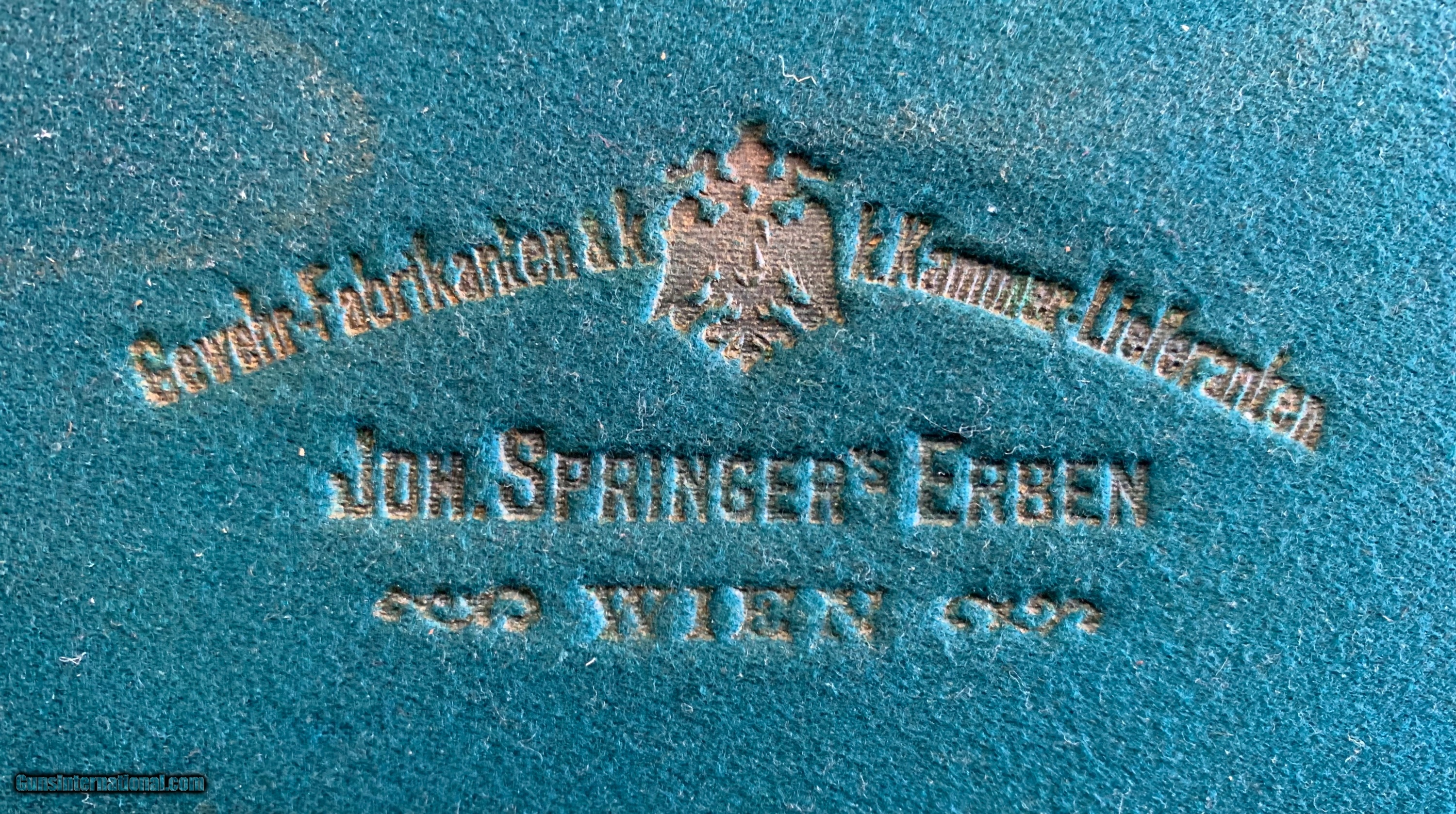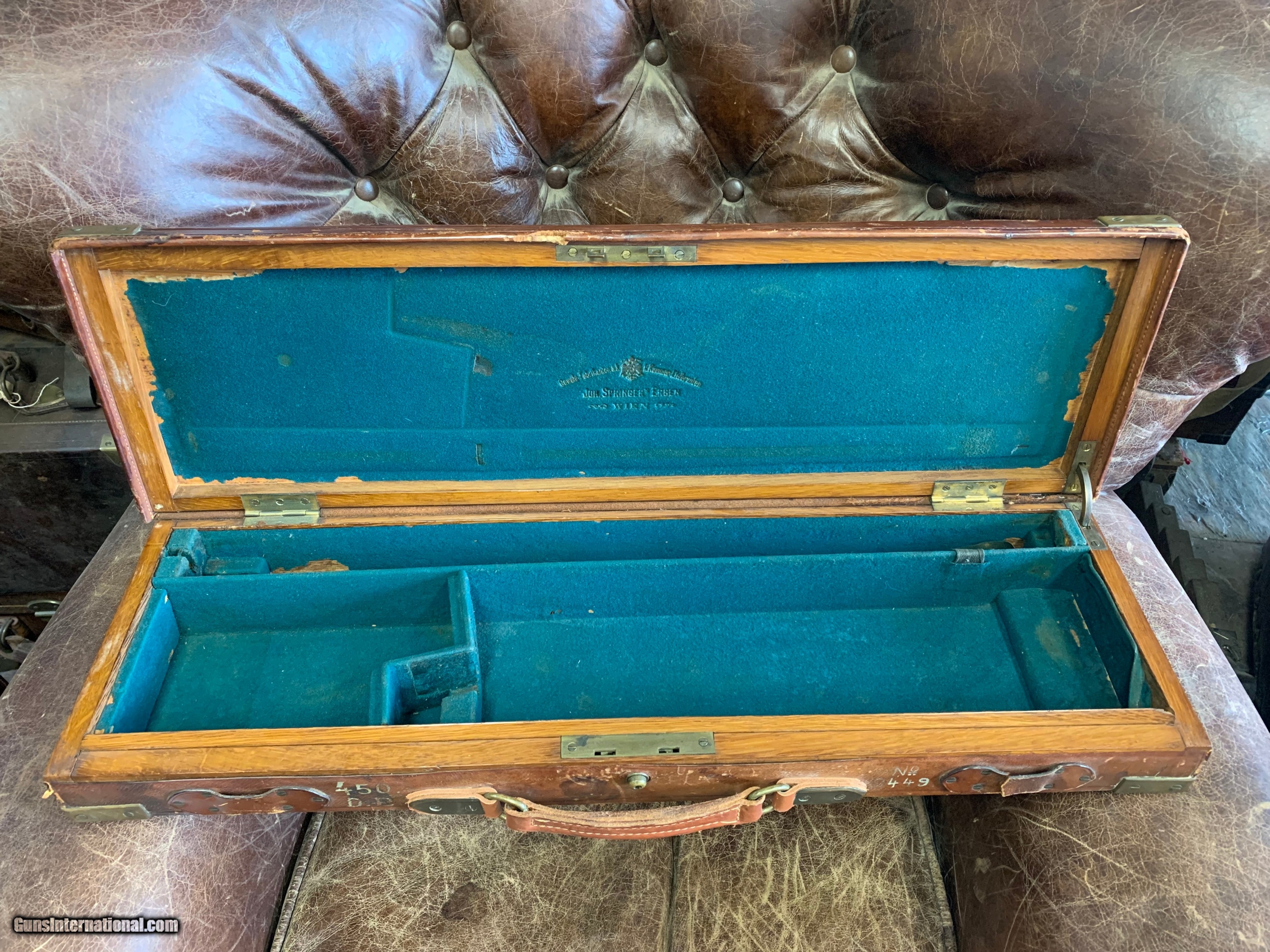 Description: Vintage Cases - This is a very hard to find case! Structurally in great condition. The leather shows some wear, as does the interior but overall both are in good condition for original. The case measures 1 7/16" across the muzzle end, 1 13/16" across the breach end, and is set up for 25 1/4" barrels. It could go as long as 25 3/4". It is also set up for a stock with approximately 14" length of pull. Could be for either a hammer or hammerless action. We can provide the maker\'s label of your choice for an additional $50.00 *All cases are sold as is, no returns (unless we miss something significant), because our time is limited, and prices are fair. Flat rate shipping is $50.00 anywhere in the lower 48 states. *** Note: To see this gun with high resolution photos and a zoom-in feature, go to the vintagedoubles main site and search for the gun ID: 5891 or browse the main site to see our full gun collection. SOLD Manufacturer: Rare Springer Double Rifle Oak and Leather Case Model: None Ejectors: No Barrel Type: Damascus Gauge Info: Other |