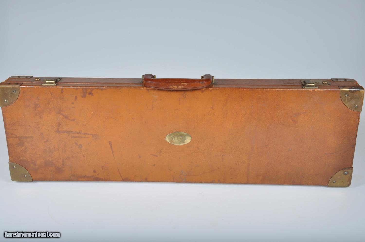 Description: This case will hold one side by side shotgun receiver and one set of 28” barrels. The lined interior has one compartment for cleaning supplies and accessories. The exterior is leather wrapped with brass corners and hardware. The latches work well but there are no keys. Included is a wooden three piece cleaning rod, two chamois gun wraps and two bottles of old lubricant. Overall, this case is in very good, serviceable condition. Unknown manufacturer. 30.25” x 9” x 3” exterior dimensions. We will accept Paypal also on this item. My office hours are 7am-4pm CST Monday through Thursday and 7am-11am Friday. Emails or phone calls received after hours and on the weekend will be answered on the following business day. SOLD |