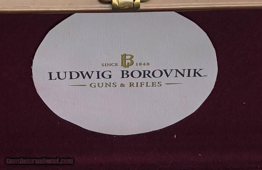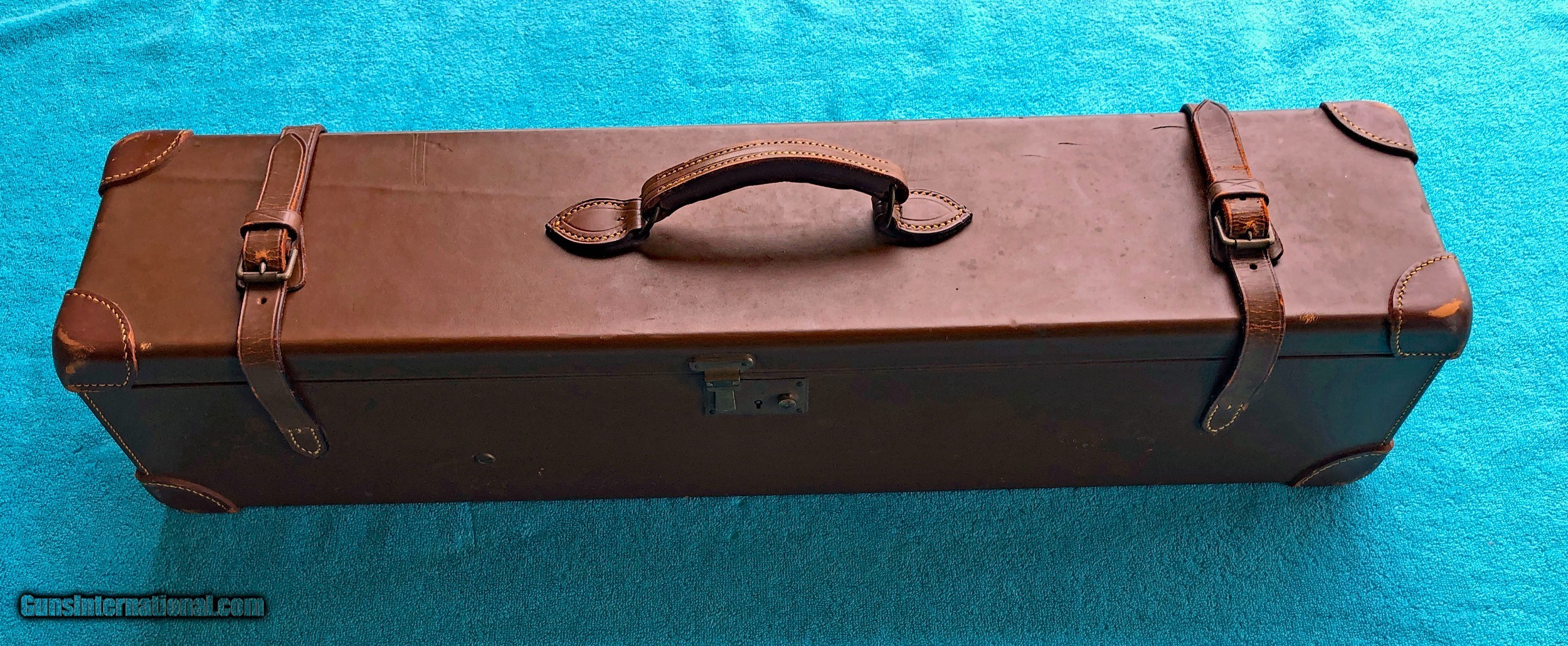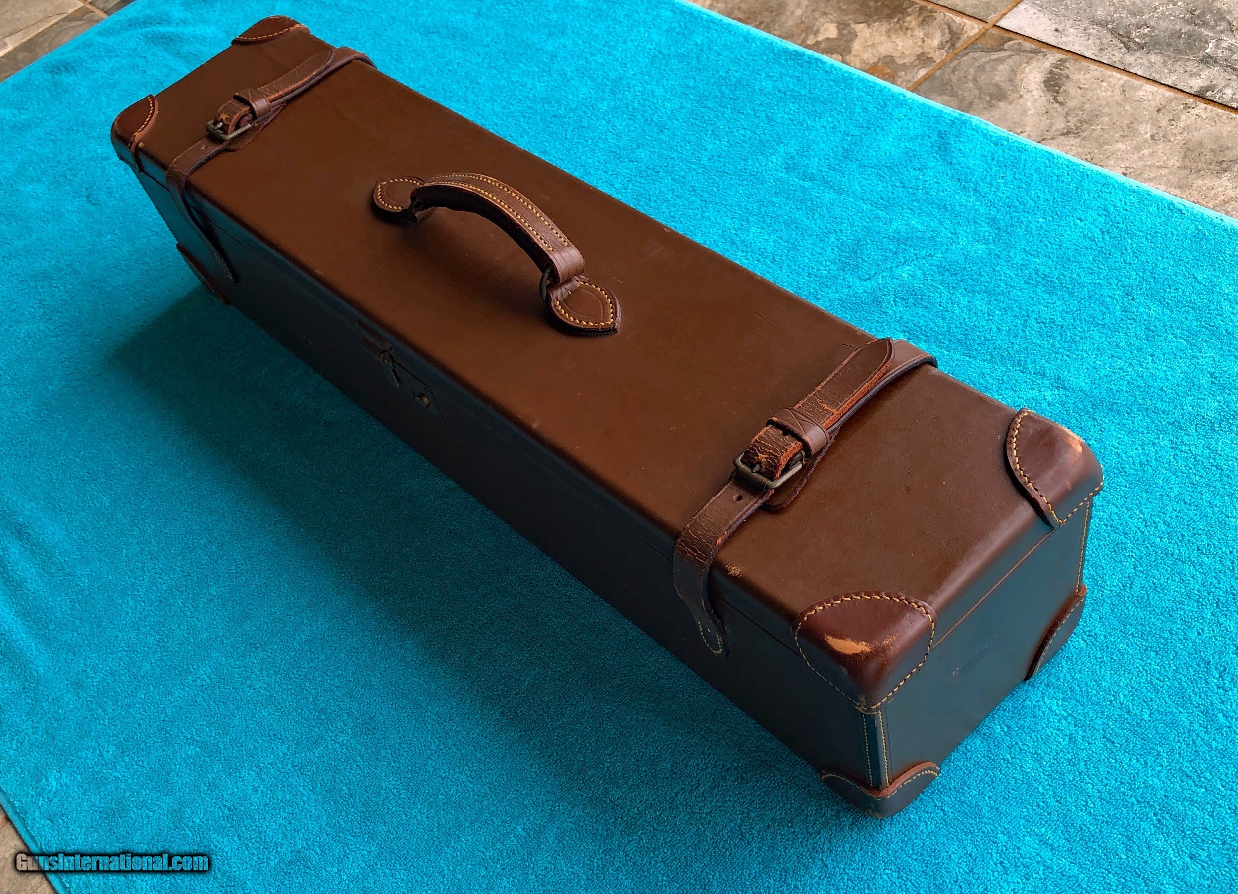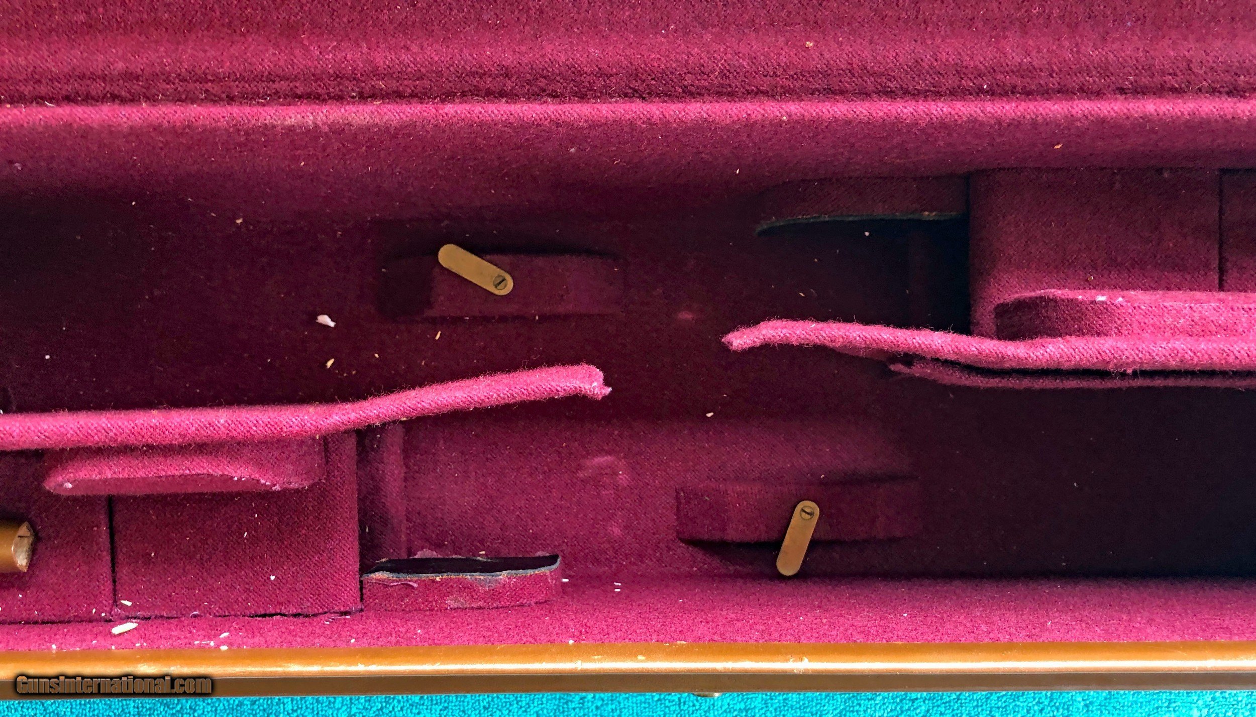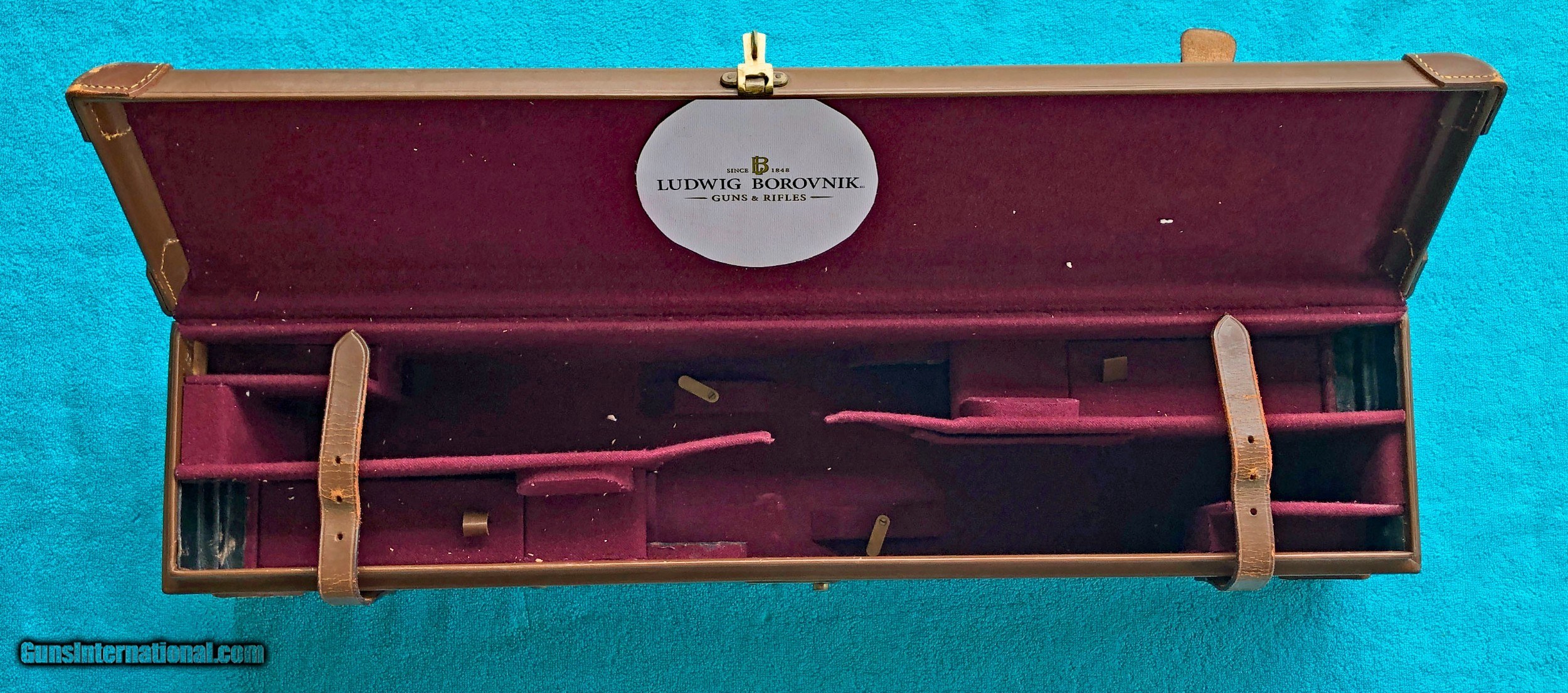 Description: SOLD Two Gun Leather Motor Case – 98% Condition Will accommodate two take down shotguns with 28” barrels, either over and unders or side by sides, for 12, 16 or 20 gauge. Very well built case, nearly new, with leather corners and plush red wine interior with cleaning compartments and stations for two takedown cleaning rods. Comes with two keys. Outside measurements 6 ¾” by 6 ¾” by 30 ½”. The Borovnik label is lightly glued on and can be easily removed and replaced with your gun’s label acquired through Connecticut Shotgun – other Galazan products. (The white flakes are styrofoam bits that should have been vacuumed out before photography.). Price $675.00 plus $50.00 shipping. SOLD |