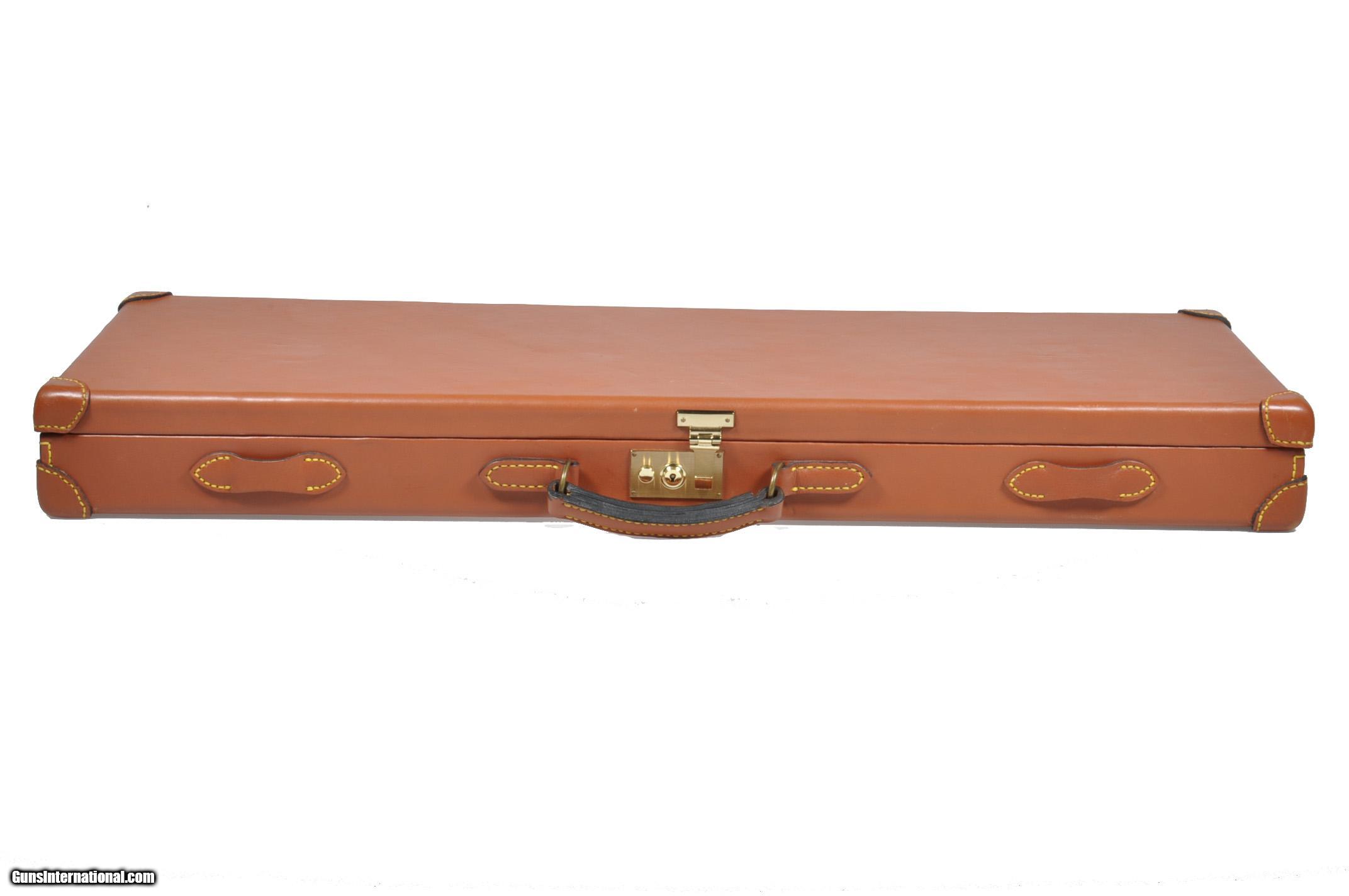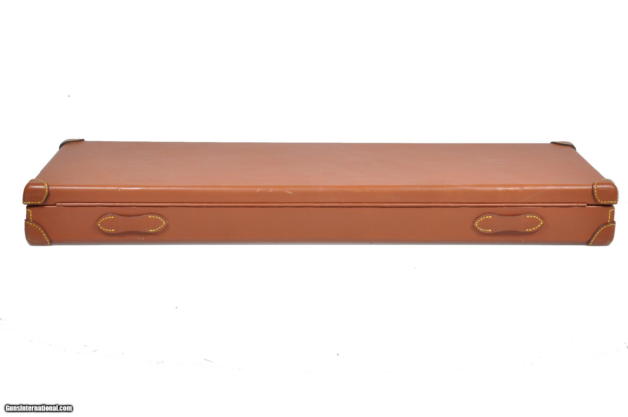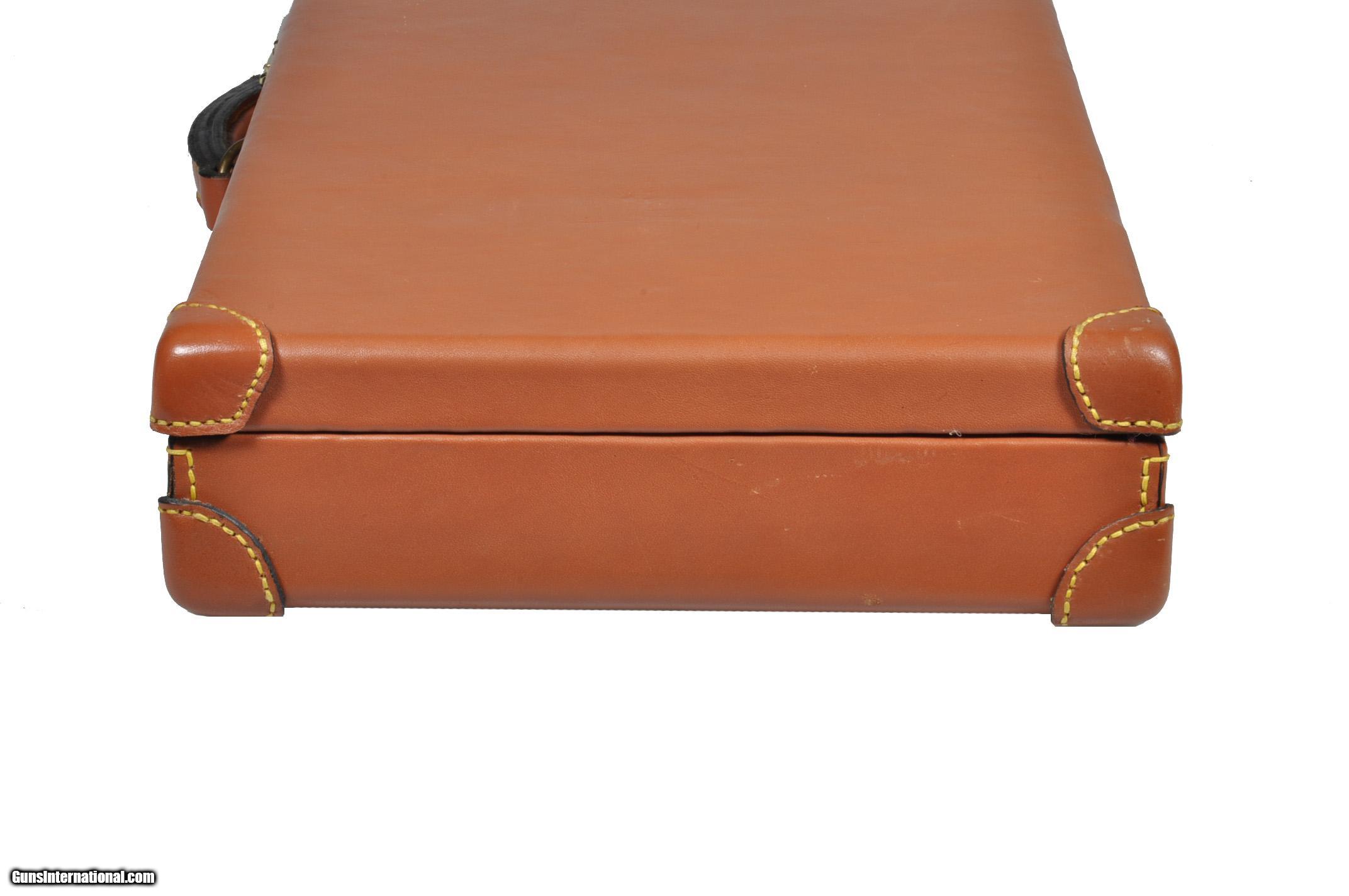 Description: This case will accommodate one side by side shotgun and two sets of barrels up to 30” in length. In near new condition, the exterior has a few light indentations, probably from being stacked and a couple of light wear marks. All stitching is excellent. The brass hardware is excellent with light tarnishing on the handle loops. The latch functions correctly and there is one key present. The red felt interior has very light soiling and no worn spots. Included items: two exterior leather straps in excellent condition, two 16 gauge snap caps, an oil bottle and a two piece wood cleaning rod. 33” x 12” x 3.5” exterior dimensions. Unknown manufacturer. We will accept Paypal on this item. PLEASE NOTE! My office hours are 7am-5pm CST Monday through Wednesday. Emails or phone calls received after hours and on the weekend will be answered on the following business day. SOLD |