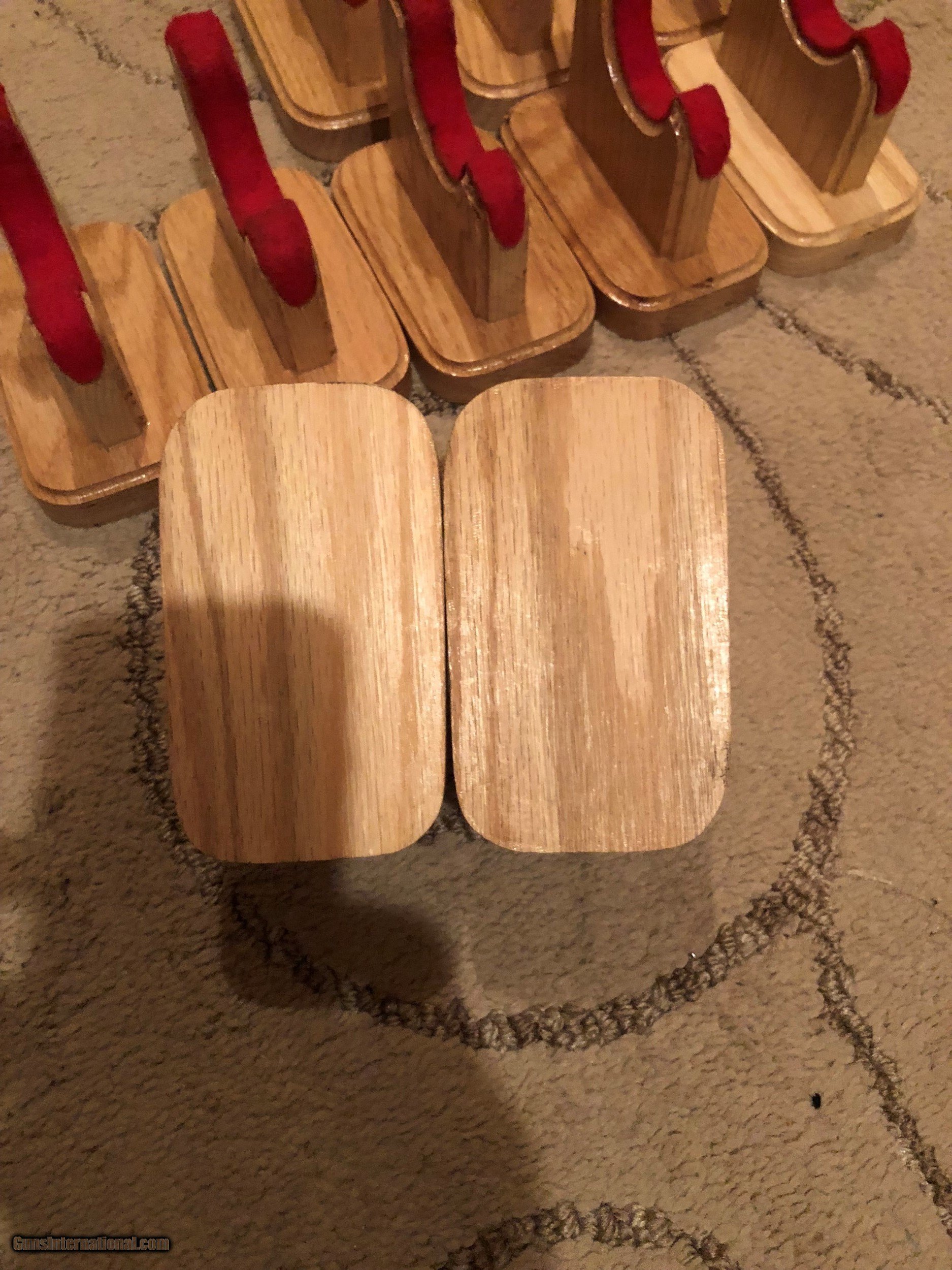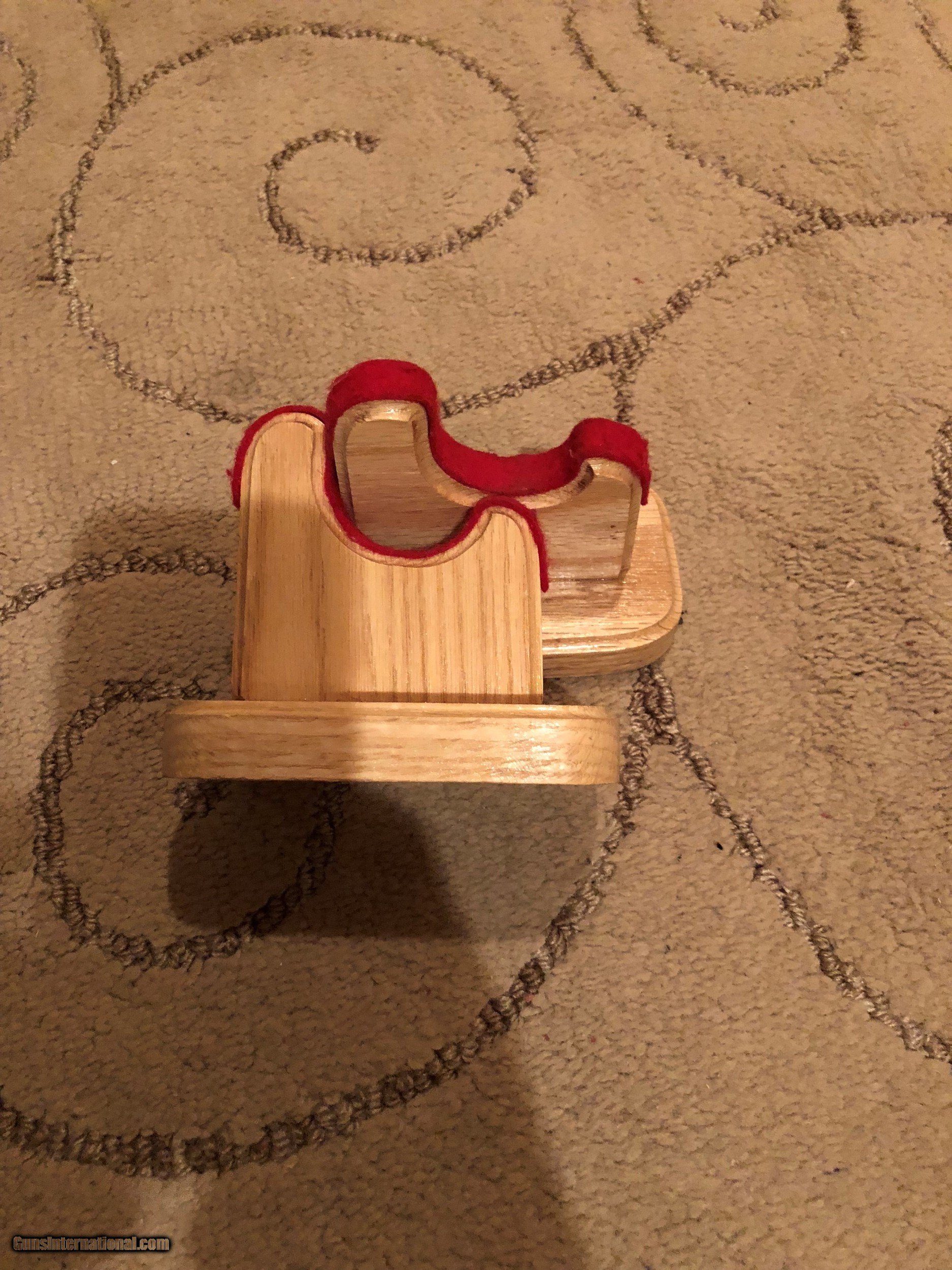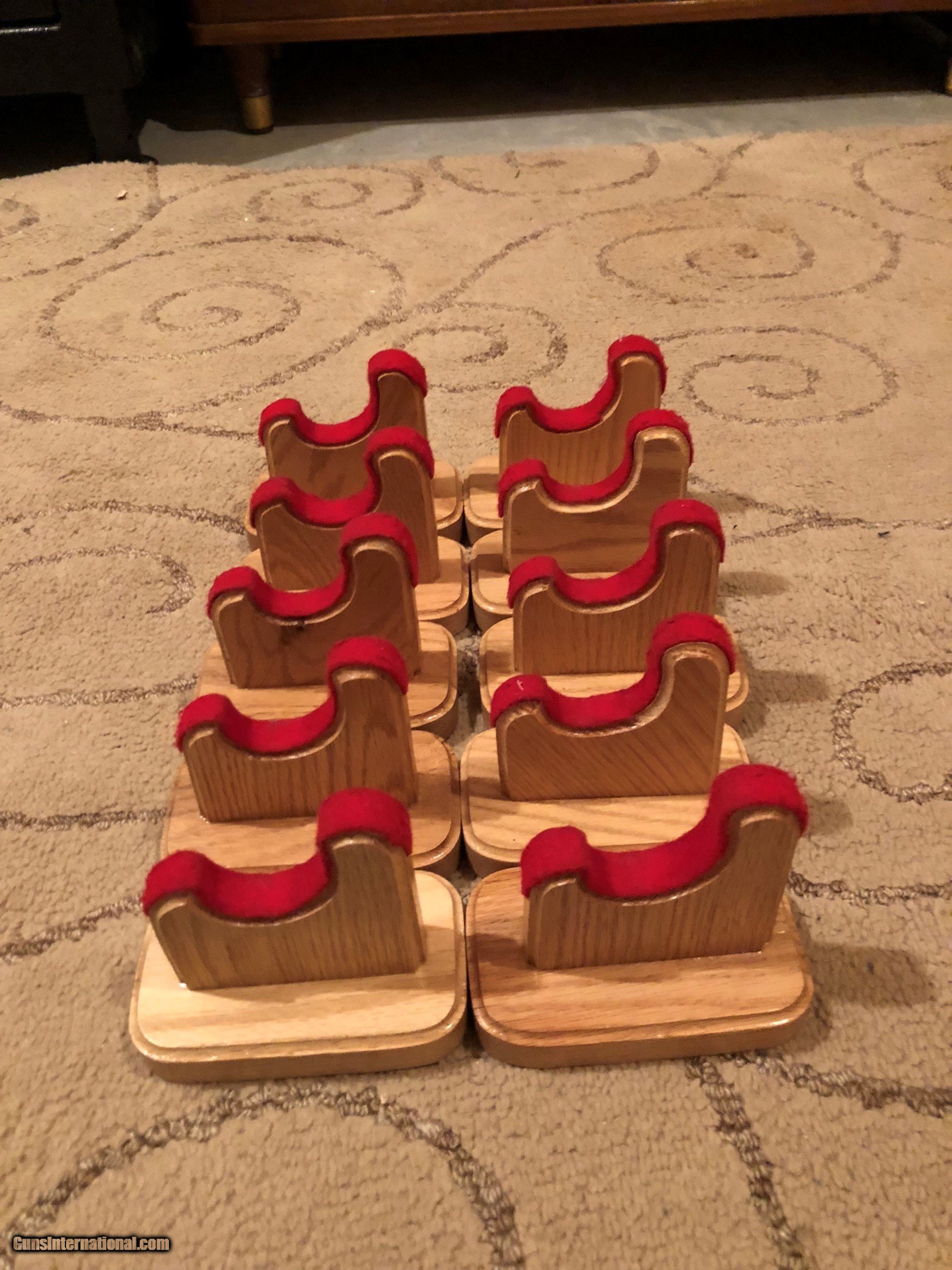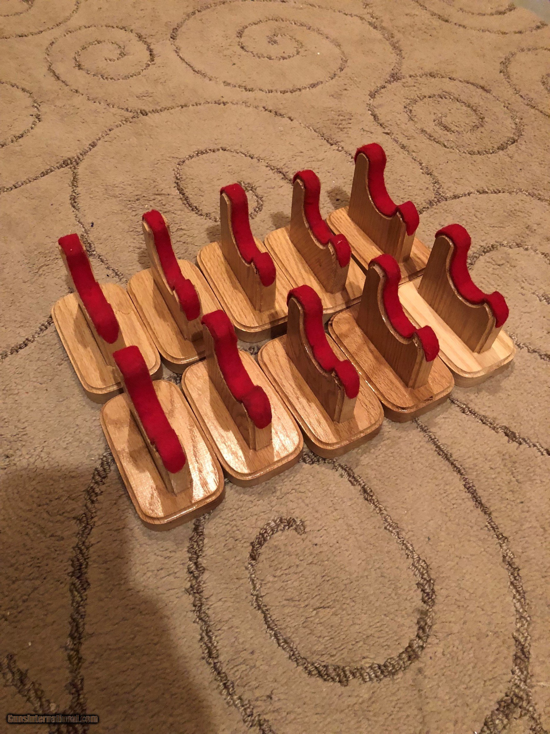 Description: Here we have 5 pair or 10 each Oak Gun Display Stands. These stands are made of oak and have routed edges and red felt cushion. Stands measure 3" Wide, 5" Long, and 4 1/2" Tall. These would be great for displaying you guns at home or at a gun show. Ask any questions or if you need more pictures. No sales outside of the U.S.. Shipping is $7.95 USPS Priority Mail. Thanks SOLD |