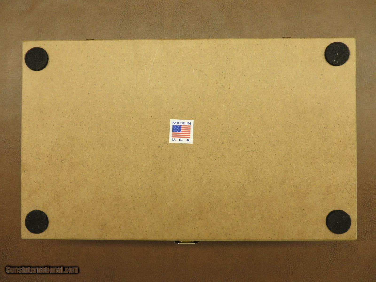 Description: Wood presentation case with S&W logo laser cut on top. Brass hardware. Fits 8 3/8 inch barreled revolver snuggly so probably made for 6 or 6 1/2 inch barrels. Excellent like new condition. No key. SOLD |