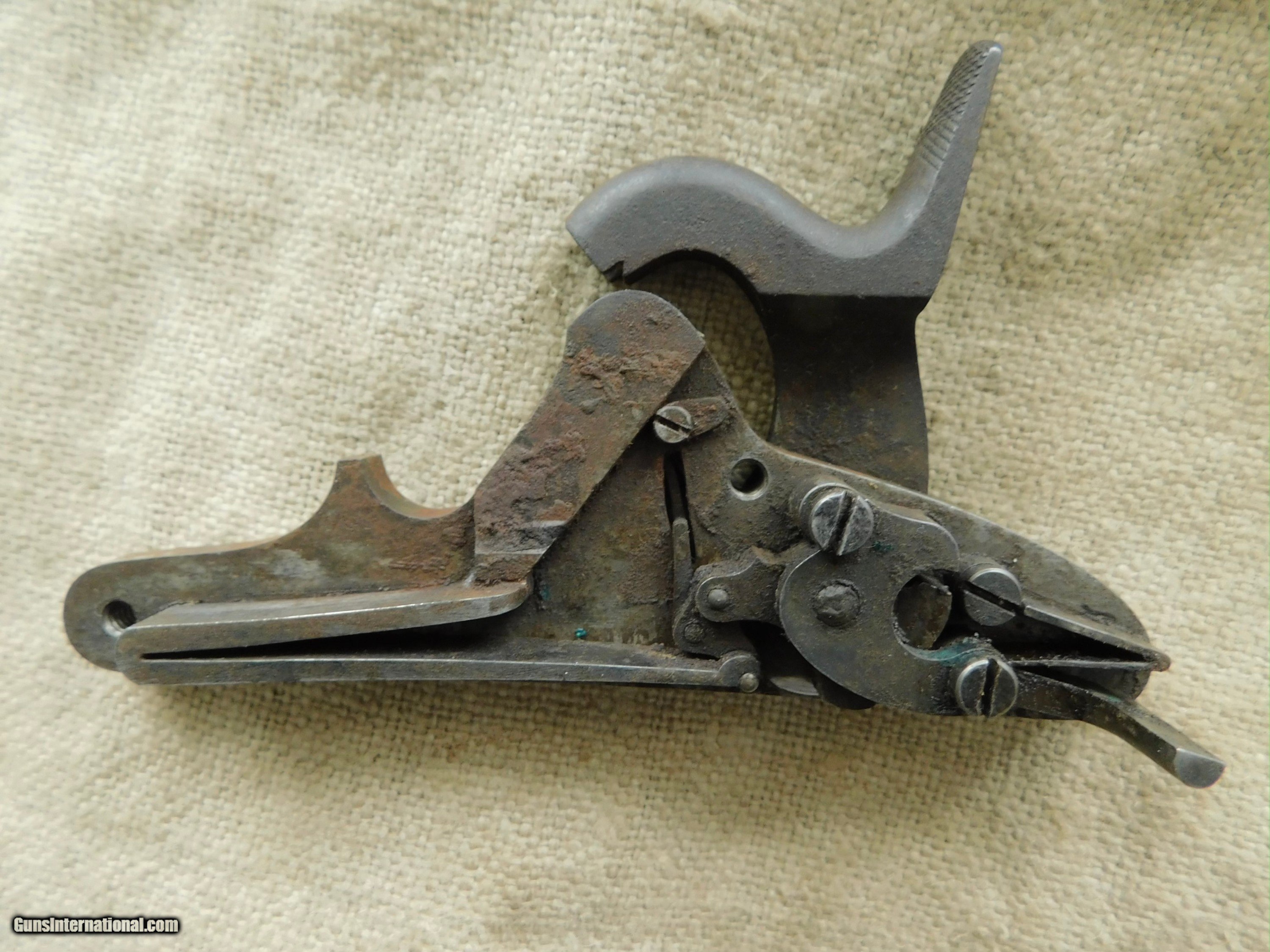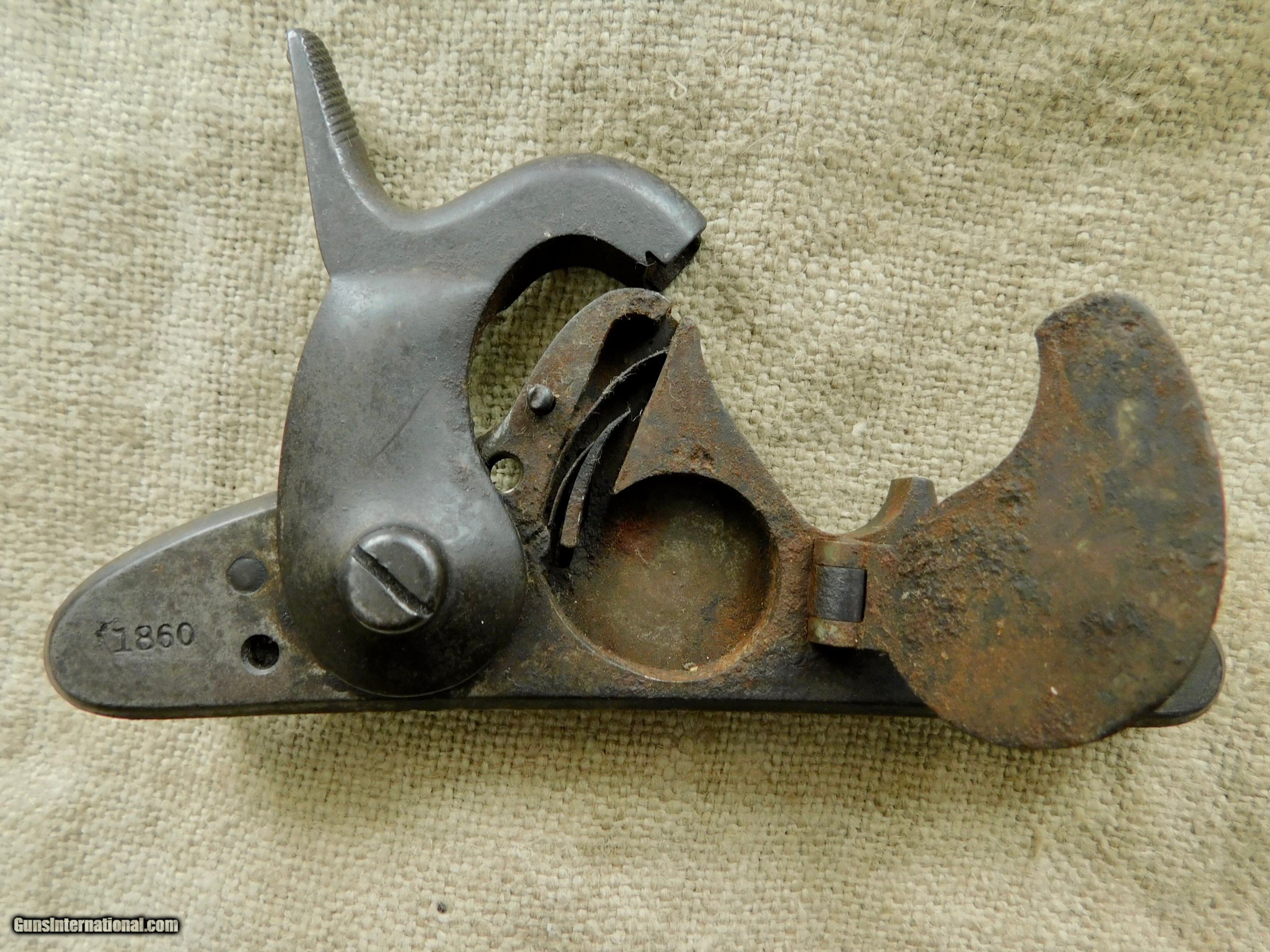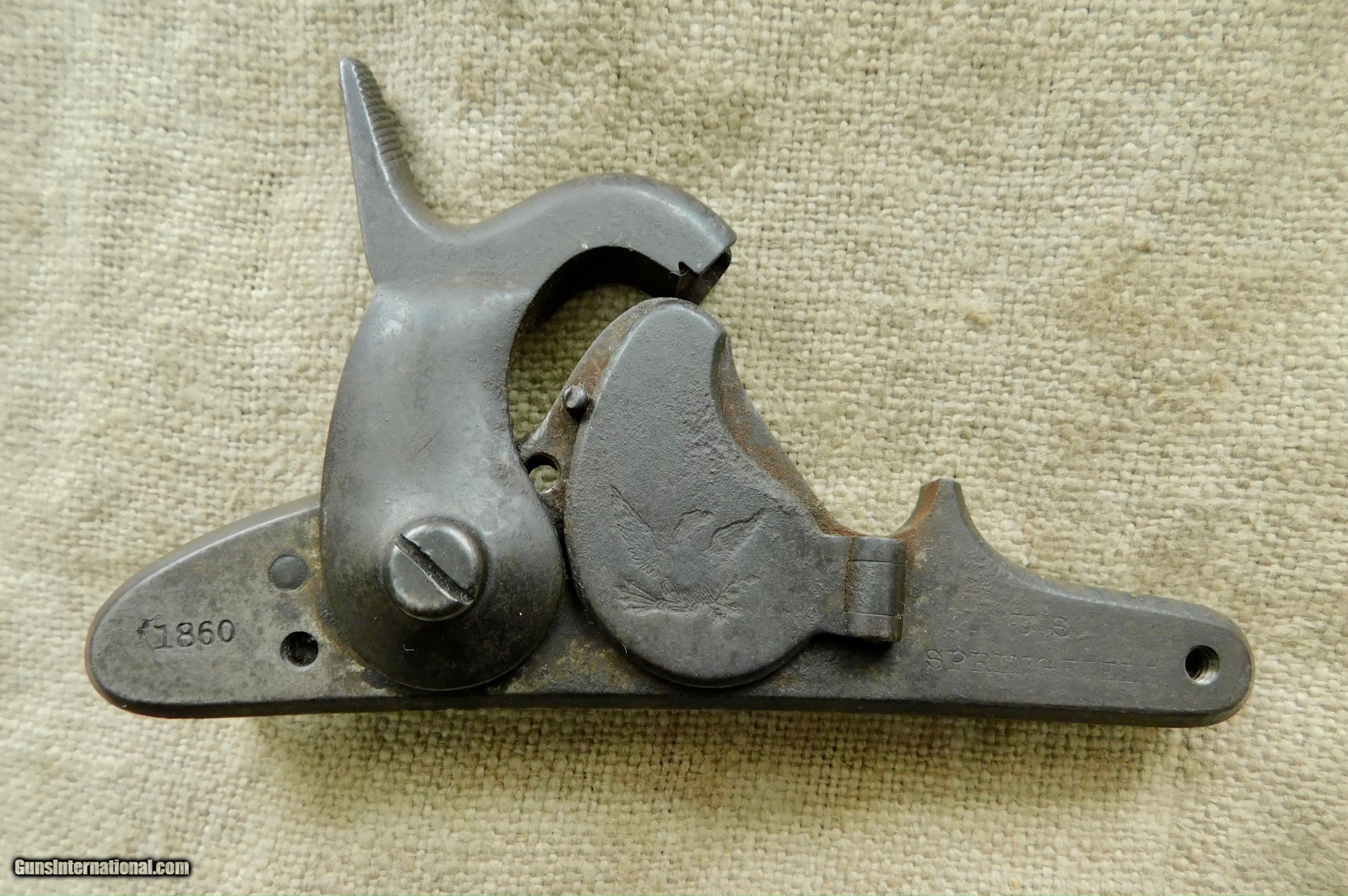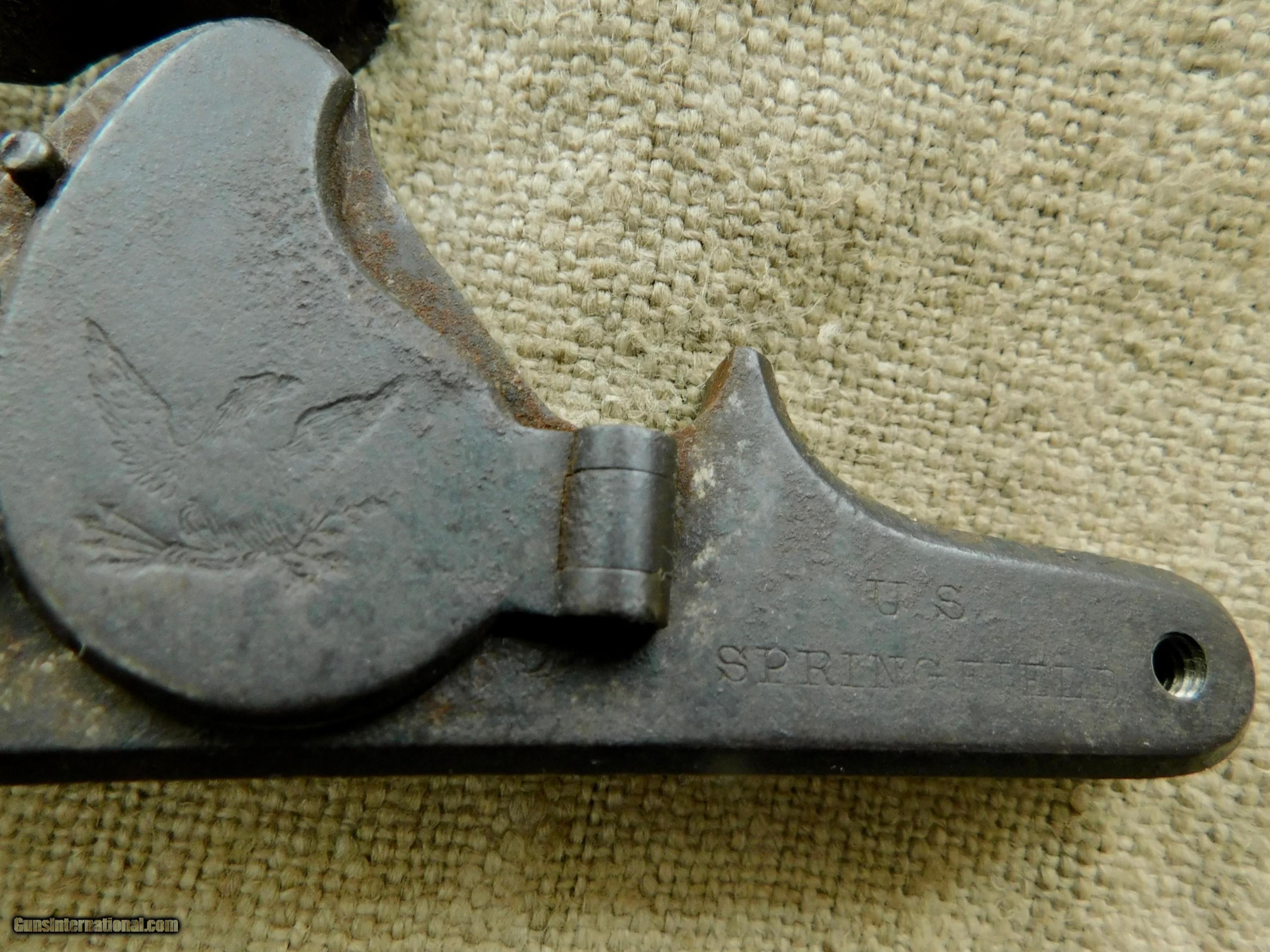 Description: Offered is an orginal Springfield 1855 Maynard System lock with an 1860 date on the lock plate. As can be seen from the photos, it is uncleaned but is functional with a strong mainspring. Please look over the phots carefully to help determine condition. Price is $750.00 which includes USPS priority mail shipping. Payment can be made with a USPS Money Order or bank check. SOLD |