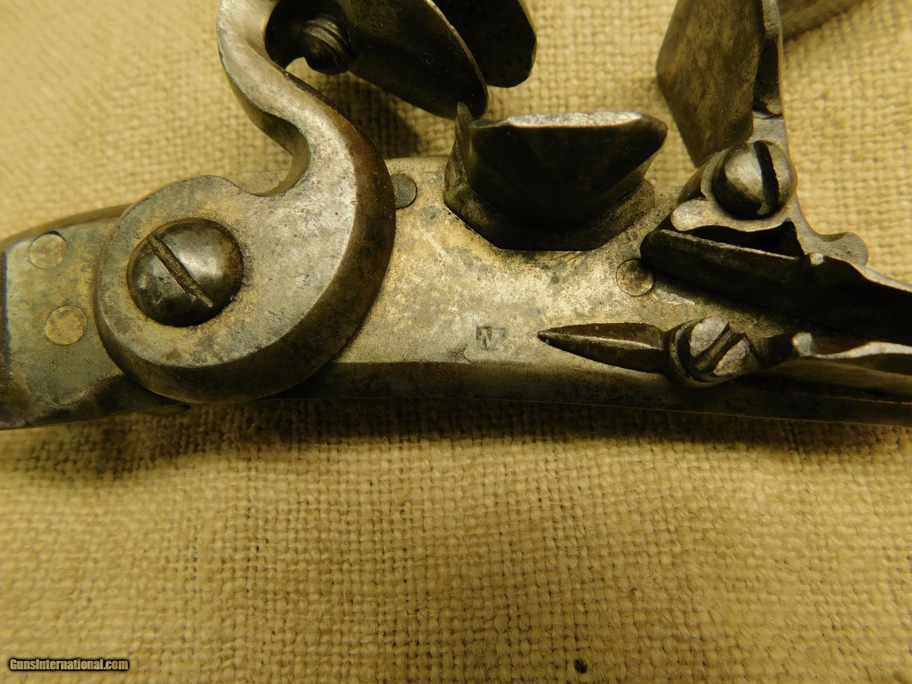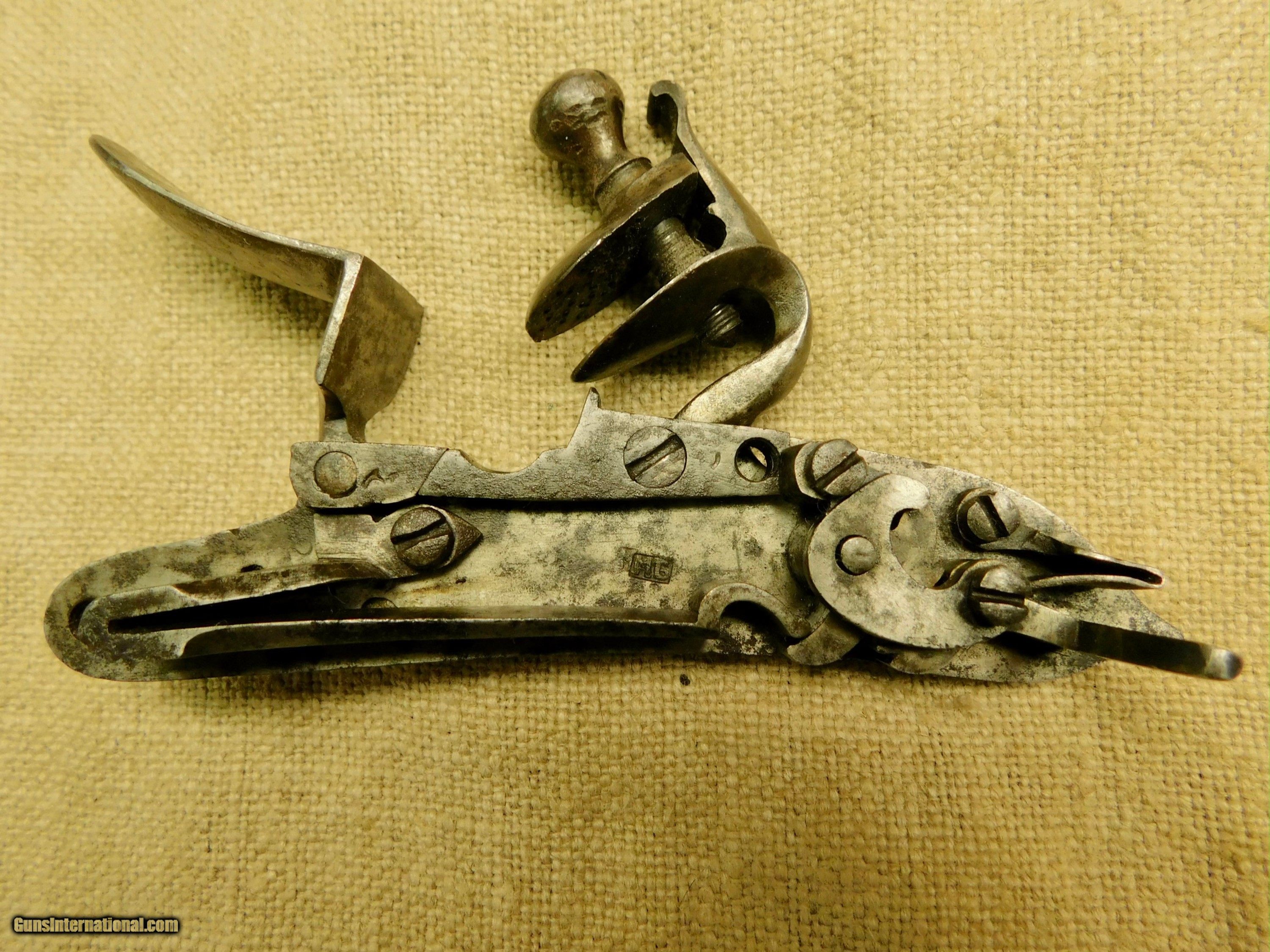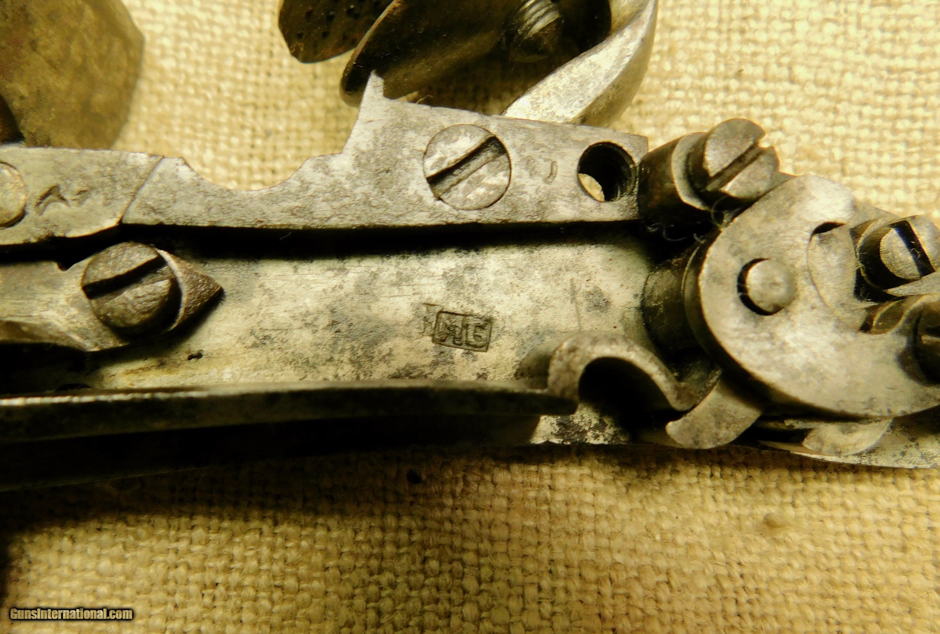 Description: Offered is a Germanic style flintlock lock in very good condition. Only marks are an "M" on the lockplate and "MG" on the inside of the plate. Strong mainspring and functional. Price is $750.00/obo, which includes shipping. Payment can be made with a USPS Money Order or bank check. SOLD |