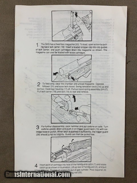 Description: This is an original SKS Owner's Handbook covering various topics that came with an SKS surplus rifle. It is not identified as to origin, but is 8 pages of information on the SKS rifle. SOLD |