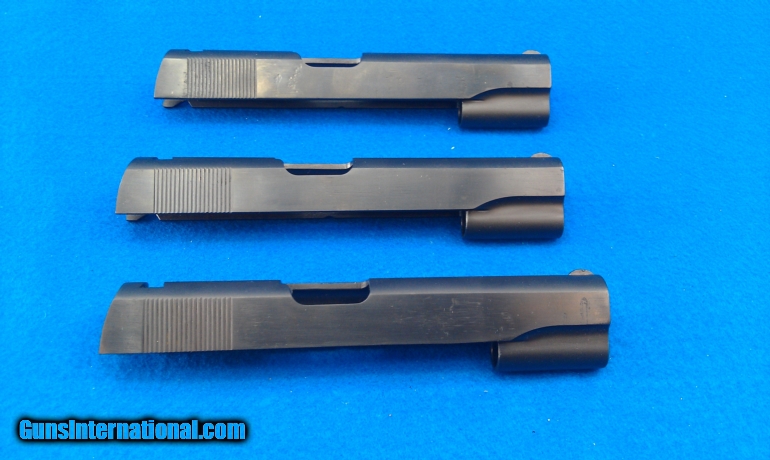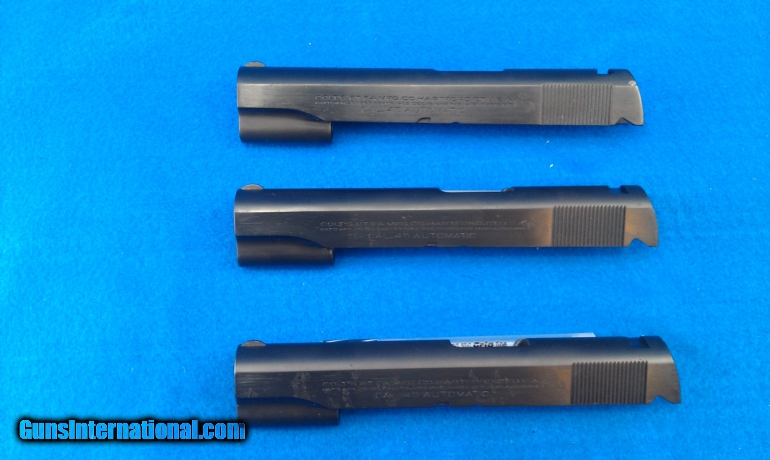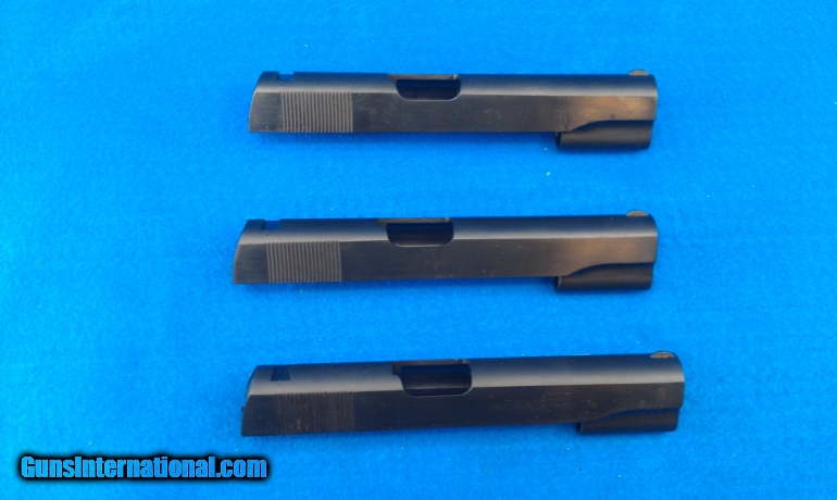 Description: Colt Gov't 1911 slides, 45 acp, they have been reblued, nice job. You can see some pitting marks. No rear site, and they are just the slide, no parts inside. $169.00 EACH. We have three ready to build on. Add 3% for C/C SOLD |