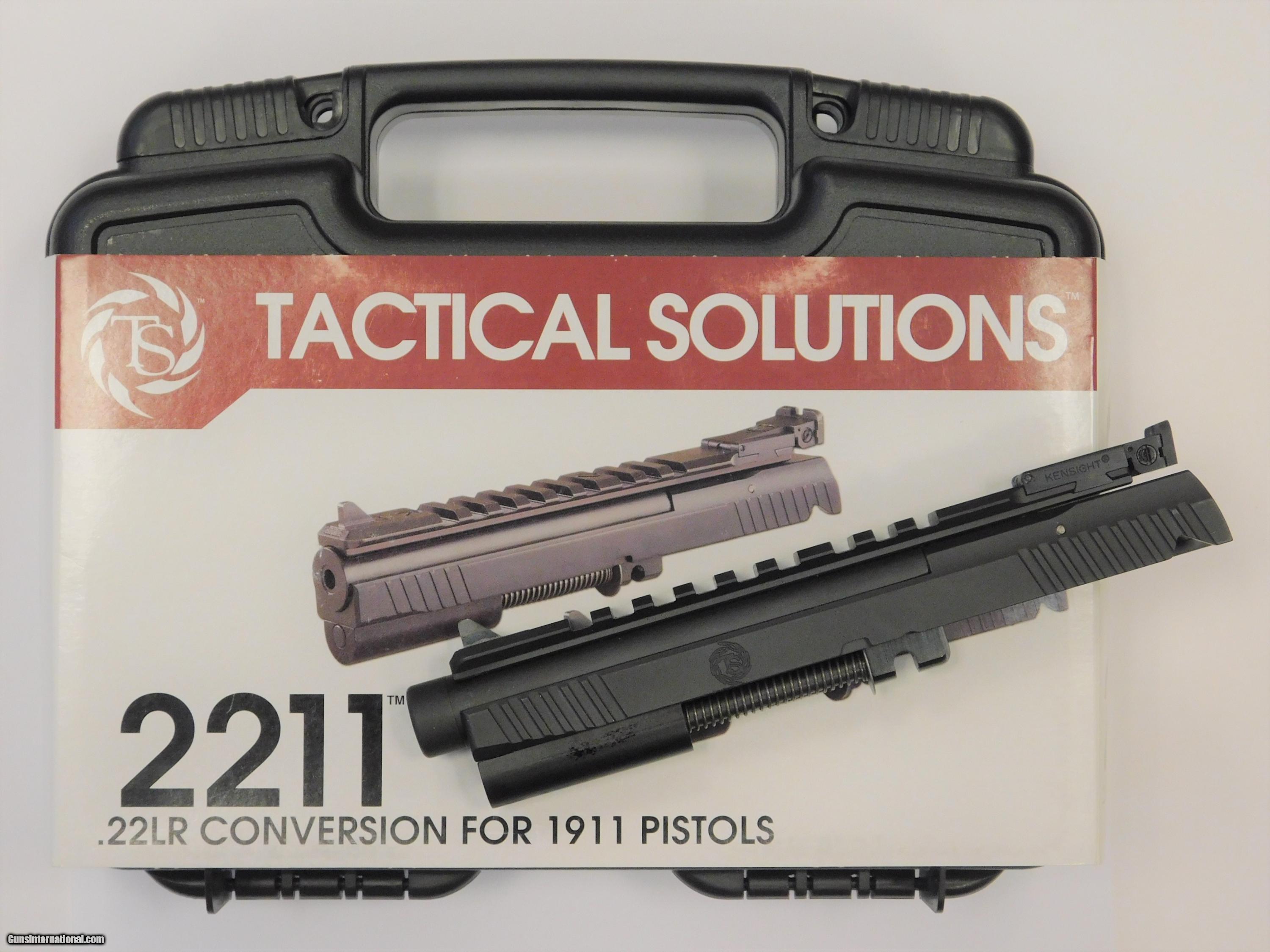 Description: Brand New in the Box, Ready to Ship. Buy It Now!! This item can be shipped direct to your residence, it will however be sent adult signature required. Quickly and easily convert your 1911 style handgun to fire .22 LR with this conversion kit from Tactical Solutions. Machined from a solid bar of heat treated steel, it easily fits the 1911 frame and has unmatched performance, durability and usability. It maintains a similar weight and feel to your 1911 pistol for realistic shooting and training. A polymer magazine is included. Includes a picatinny rail. Fits: 1911 Government or Commander Sized Single Stack Pistols and Clones Precision Machined From Heat Treated Steel. Nitride surface treatment for wear and corrosion resistance. Manufacturer: Tactical Solutions Type: Conversion Kit Item #: 2211CONTESSCMB Model: 2211 Conversion Threaded Barrel Slide Finish: Black Slide Material: Steel Barrel Length: 4.5" Barrel Material: Steel Barrel Finish: Black Capacity: (1) 10 Round Magazine Shipping to Lower 48 Only Shipping $10.00 KNOW YOUR LOCAL AND STATE LAWS!! SOLD |