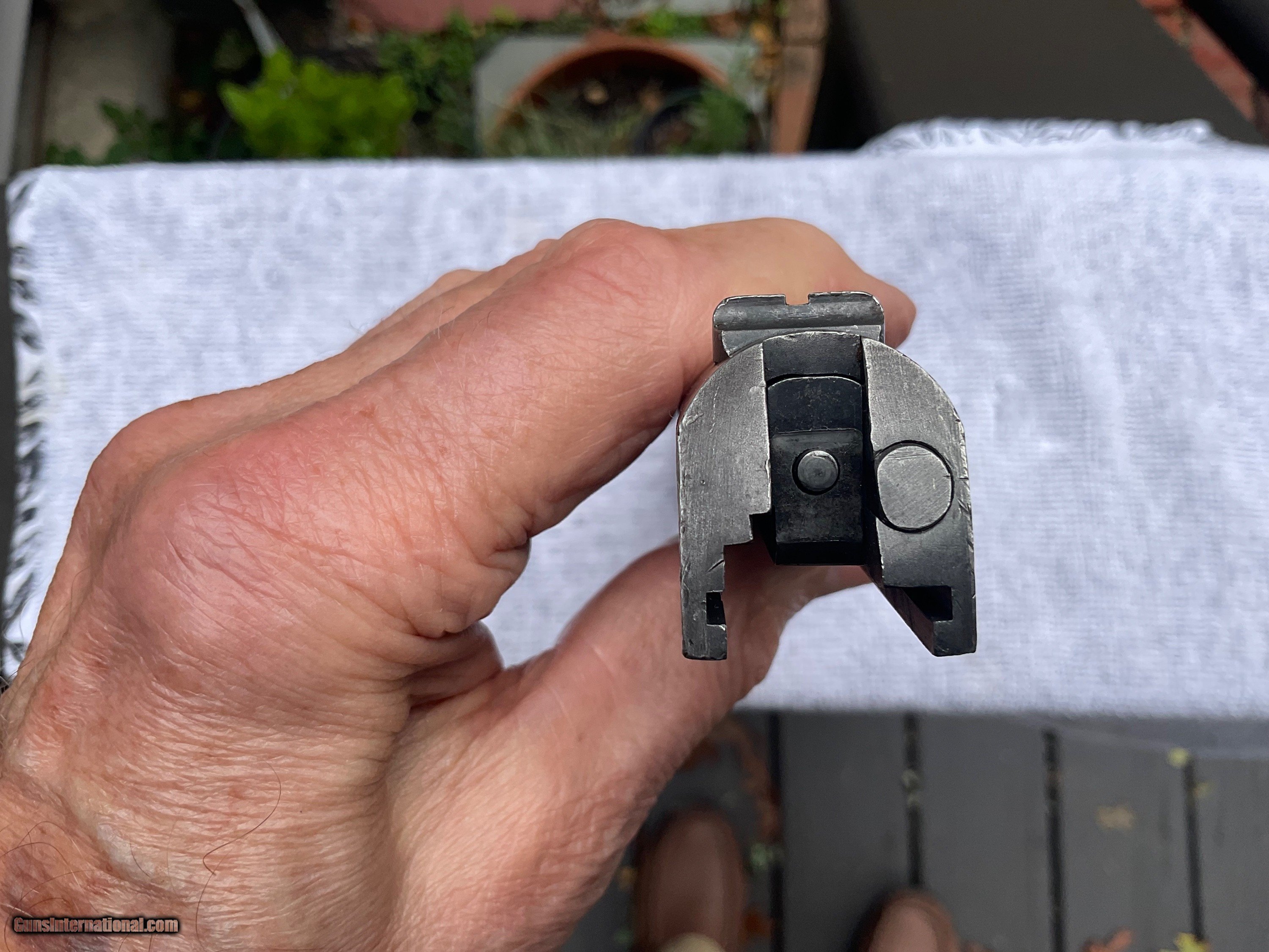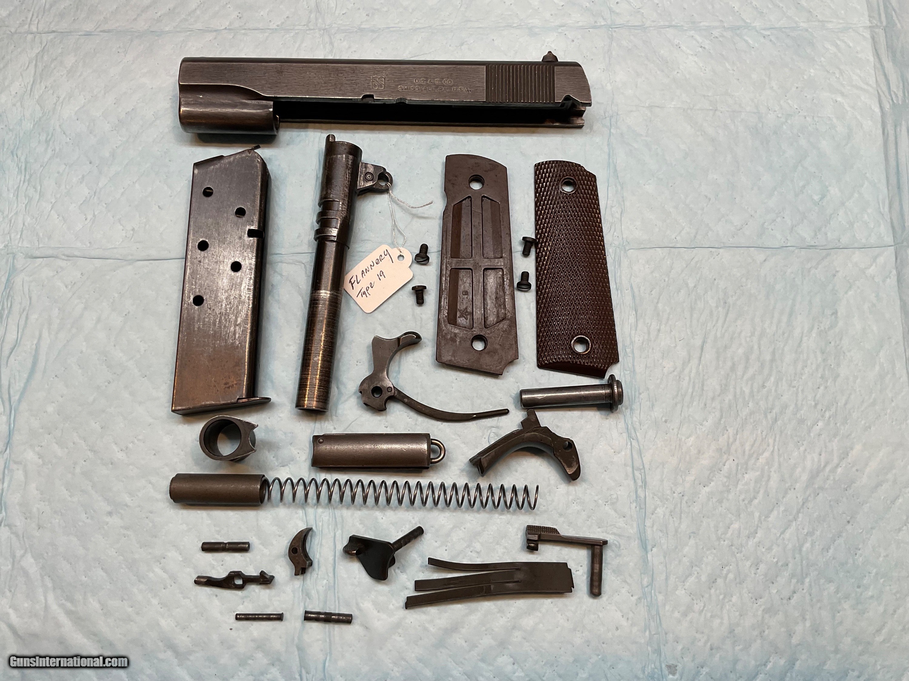 Description: This is a 1911/1911A1 parts kit, which includes a Union Switch & Signal slide. The parts kit also includes Keyes Fiber grips, and M.S.Little magazine, which are correct for a US&S 1911A1. The remaing parts will fit a US&S, but may not be original. The barrel is a Flannery Bolt Co. barrel, which were used on late Ithaca's and as replacement barrels on all 1911A1s. There is NO receiver or trigger included in this parts kit. In addition there may be other small parts such as pins or springs, missing. All parts appear to be in good condition. The finish may be worn, but the part will function as intended. No Sales to any state or local jurisdiction that restricts the sale of gun parts. It is the buyers responsibility to know the law in their jurisdiction. Sales only to the contiguous 48 states of the United States. No sales to Hawaii or Alaska. No foreign sales. Please look at pictures closely and ask questions. These are not new parts, nor are they in new condition. All show some signs of use. I do not accept returns unless not as described. Payment by USPS MONEY ORDER, Certified Check, or Personal Check. I will hold shipping of parts until a personal check clears my bank. Price includes shipping. SOLD Handgun Caliber: .45 ACP (.45 Auto) |