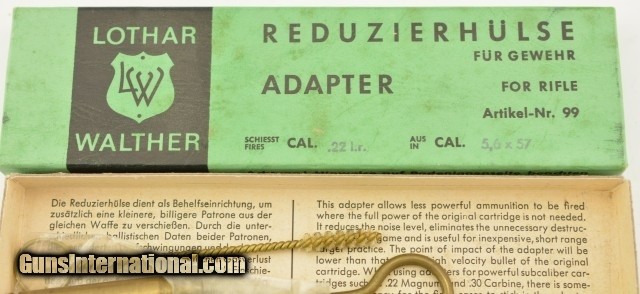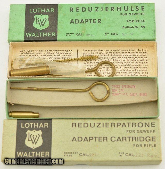 Description: This is two used Lothar Walther 22lr Adapter Cartridge for Rifle consisting of one in 5,6 x 57 caliber and the other in .221 Remington. Both of the kits are in very good condition and contain the tools. SOLD |