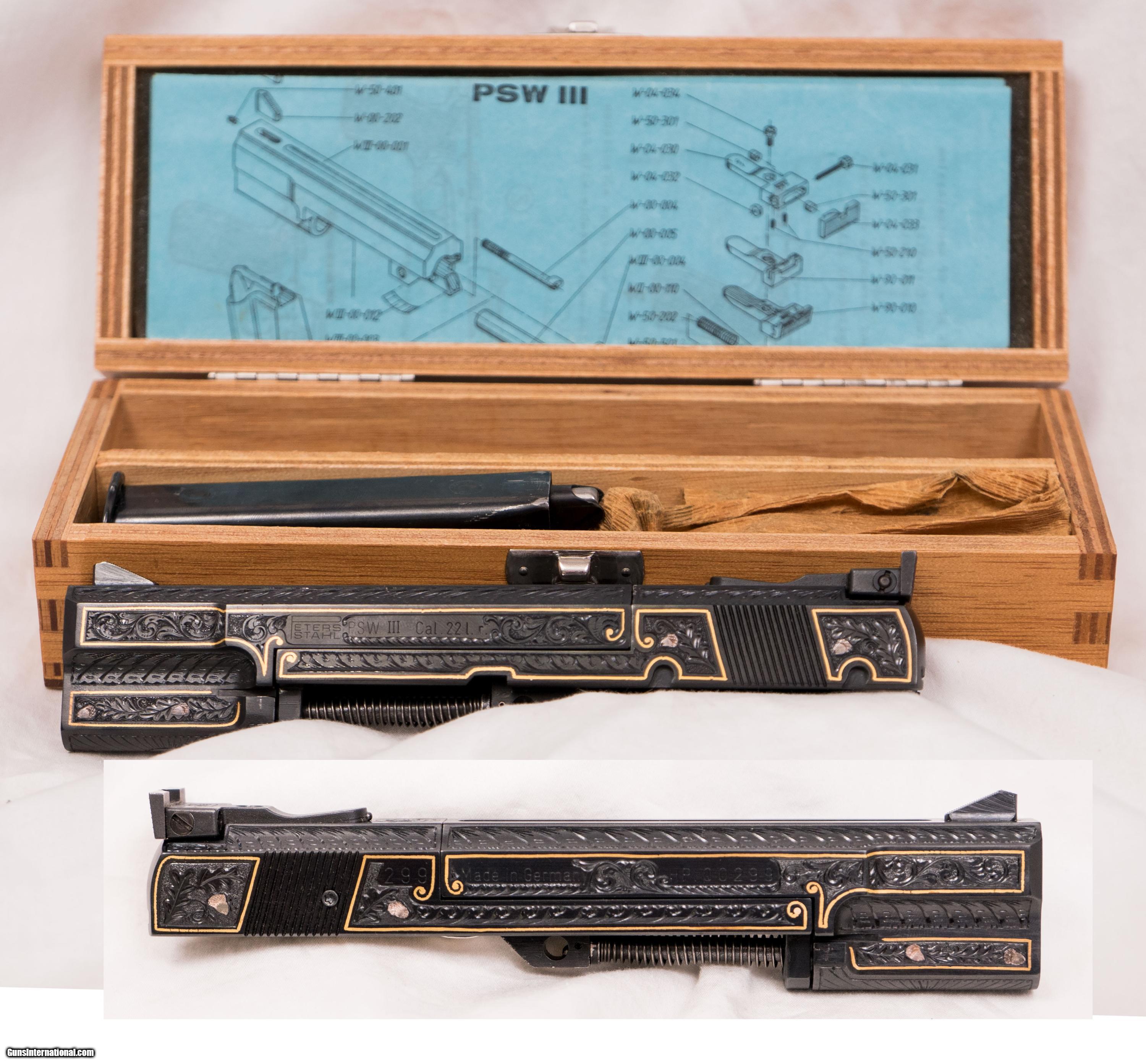 Description: PETERS STAHL PSWIII BROWNING HIGH POWER CONVERSION. OAK LEAF SCROLL ENGRAVING WITH GOLD INLAY, 1 MAGAZINE WITH OAK LEAF SCROLL ENGRAVING ON MAGAZINE PLATE, MAKERS WOODEN BOX WITH INSTRUCTION SHEET, SPARE EXTRACTOR & SPRING. CONDITION: EXCELLENT+ SOLD |