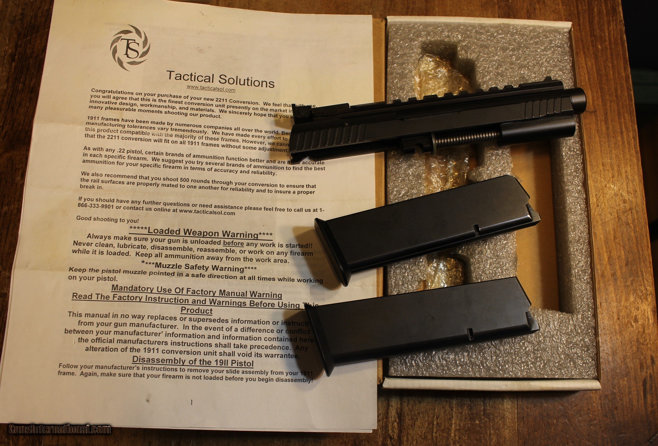 Description: Tactical Solutions 2211 Rimfire Conversion Kit with Picatinny-Style Scope Mount, Adjustable Sights, Threaded Muzzle 1911 Government, Commander 22 Long Rifle Matte w Two Factory Magazines NOTE: Look close at the pictures as the item you see is the one you get. As is means AS IS so There is NO, Refund. This came from the estate of an FFL/SOT Gun Smith, Gun Store that is out of business. The estate was an avid collector. This is from the collection or was inventory. There will be countless other listings from this inventory and other inventories. We are selling for the seven different estate/store. This is NOT a liquidation. There are no lists and will be no lists. Please check our other listings for more items Please also check our Webpage and or Facebook page at P&T Partners Shipping is included. Shipping is NOT FREE. Just included for Priority Mail. Credit in any form, shape or manner add 3.5% and credit by PHONE only. Personal checks accepted, we do not hold until clear for parts. Postal Money orders also accepted. If you are in Texas and purchasing from Texas you are subject to Texas State Sales Tax For those that are local, there is no Face To Face. On Line means On Line. Again if you are Local there is NO local pick up. We ship only SOLD Handgun Caliber: .22 Long Rifle |