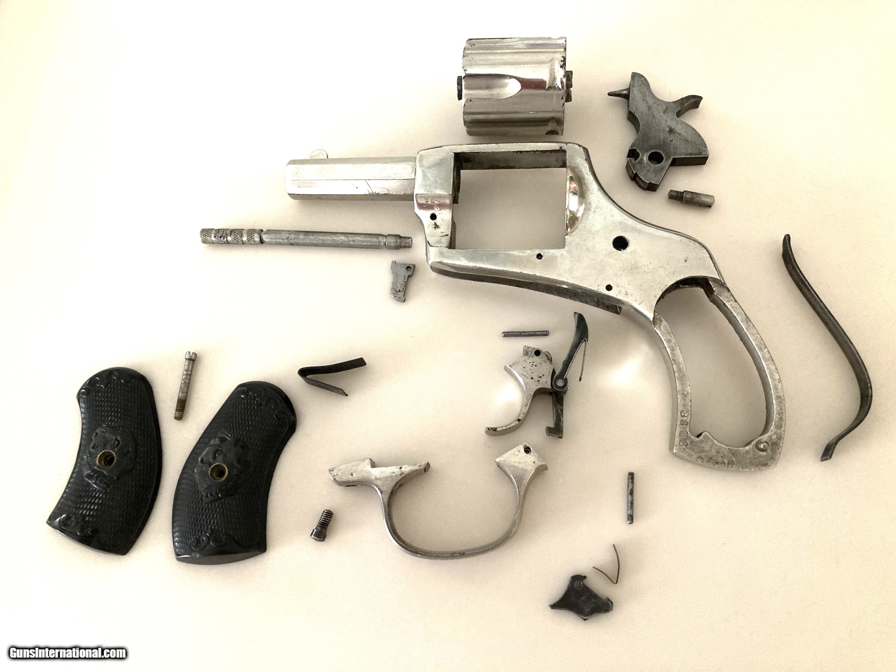 Description: I am new at this parts thing, so pleae bear with me. I have oriented the parts in the photo as close to their correct position as I can. I believe that the parts are all there except for a pin that holds the cam that holds the cylindeer shaft in place and probably a spring thatt puts upward pressure on that cam. Could easily be wrong there. I don't know the function of the v-shaped spring, or if it even a part of the gun. Price is based on some research regarding the value of a complete gun, and of similar parts packages. I believe this gun was made pre-1900 and thus can be shipped to a non-FFL holder. Advice on price or on this assumption cheerfully accepted. I'll do my best to answer questions. SOLD Handgun Caliber: .38 S&W (.38 Colt New Police, .38 Super Police) |