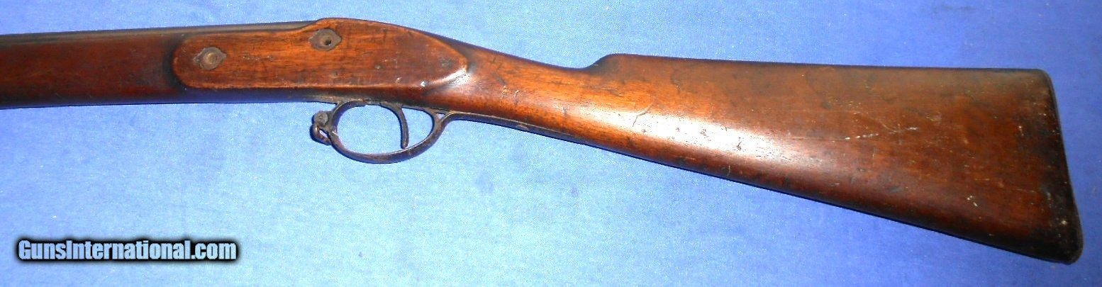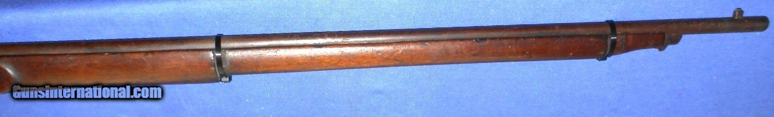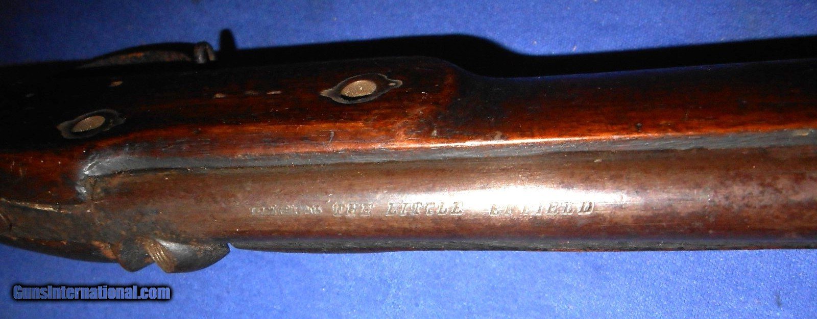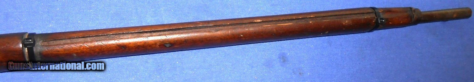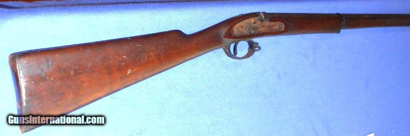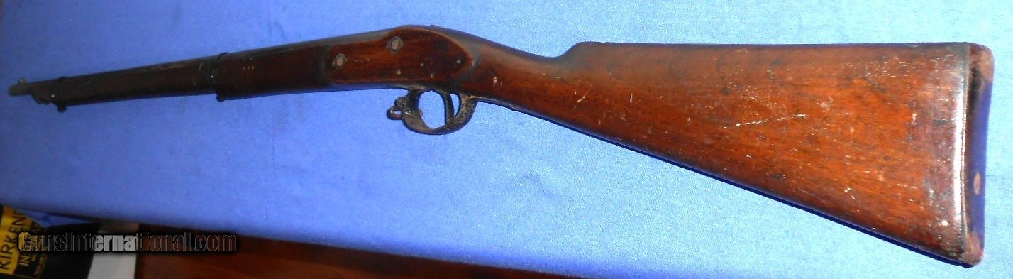 Description: FOR PARTS, RESTORATION or DISPLAY. SCARCE BELGIUM MADE "THE LITTLE ENFIELD" .38 CALIBER PERCUSSION CHILDS MUSKET. A COPY OF THE CIVIL WAR ENFIELD RIFLE IN CHILDS SIZE. THESE OFTEN CAME WITH A BAYONET, CAN YOU IMAGINE THAT ? AND WERE OFFERED AT GAR REUNIONS TO CIVIL WAR VETERANS AS A BRING HOME FOR THEIR CHILDREN ALSO MILITARY ACADEMYS AND SCOUT GROUPS. THIS ONE NEEDS A FEW PARTS TO COMPLETE. LOCK & LOCK SCREWS, NIPPLE, BARREL BANDS & RAMROD. OVERALL IN VERY GOOD CONDITION. WALNUT STOCK HAS NO CRACKS WITH SCATTERED HANDLING MARKS. THIS HAS TO GO ! $30.00 DIRECT TO BUYER QUESTIONS or ADDITIONAL PICS JUST ASK. SOLD |
