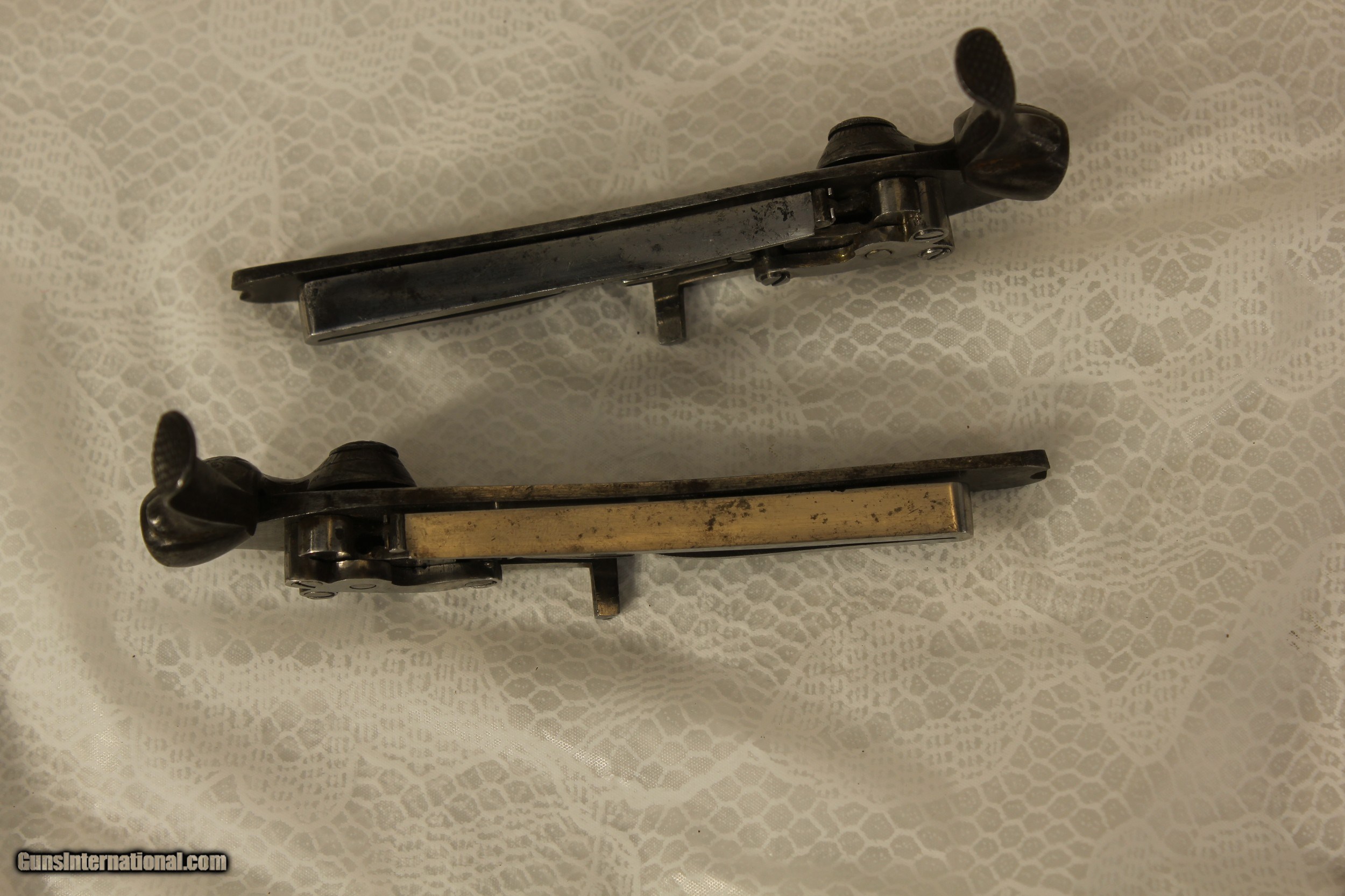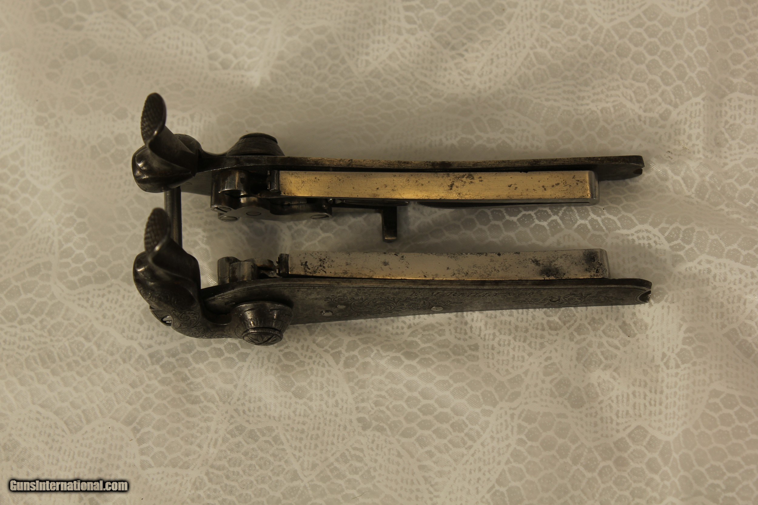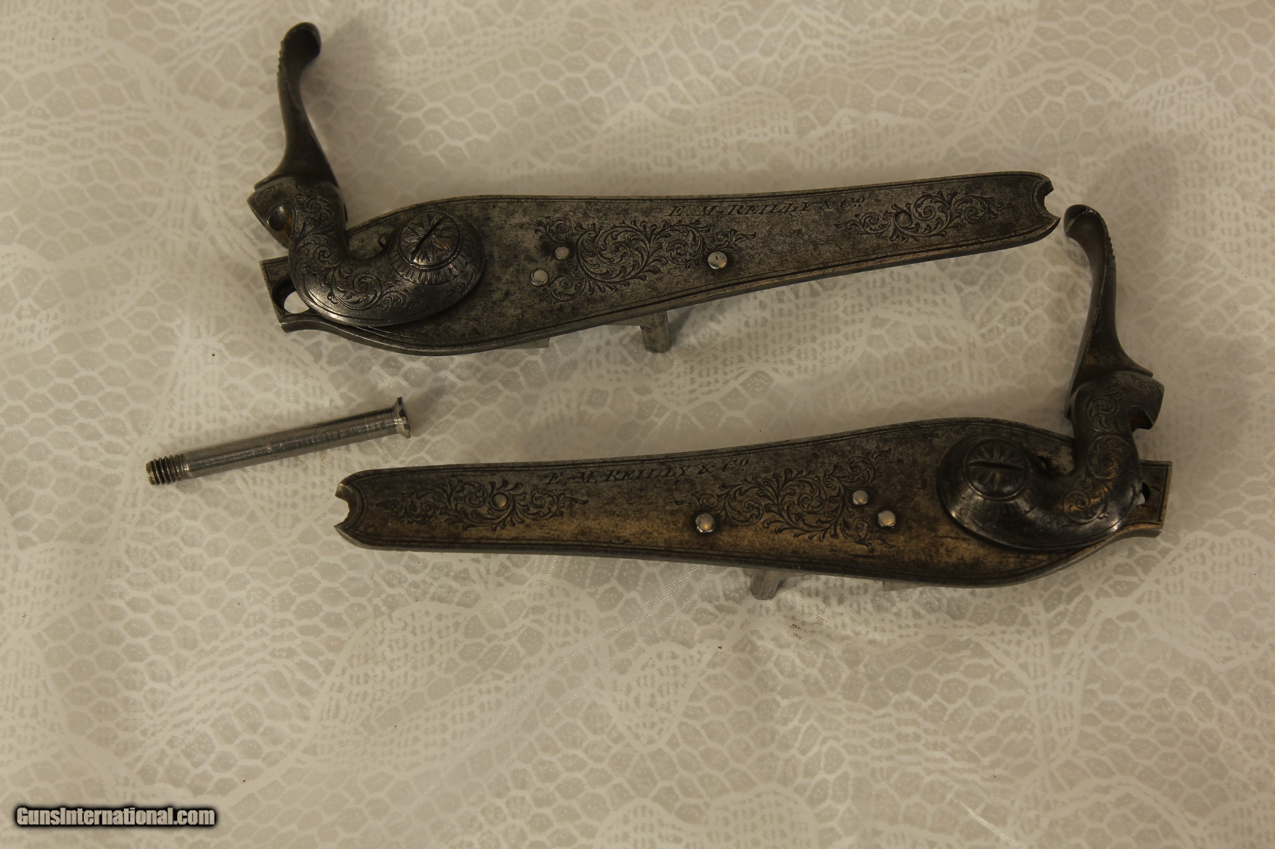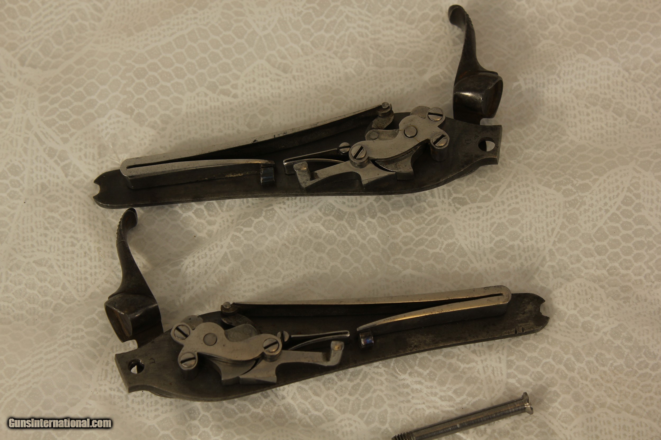 Description: These are early double gun breech lock locks made by E. M. Reilly. They are non-rebounding locks. These locks are in excellent condition and work as designed. They are lightly engraved. These could be converted for a percussion gun. Shipping via Priority Mail $20.00 SOLD |