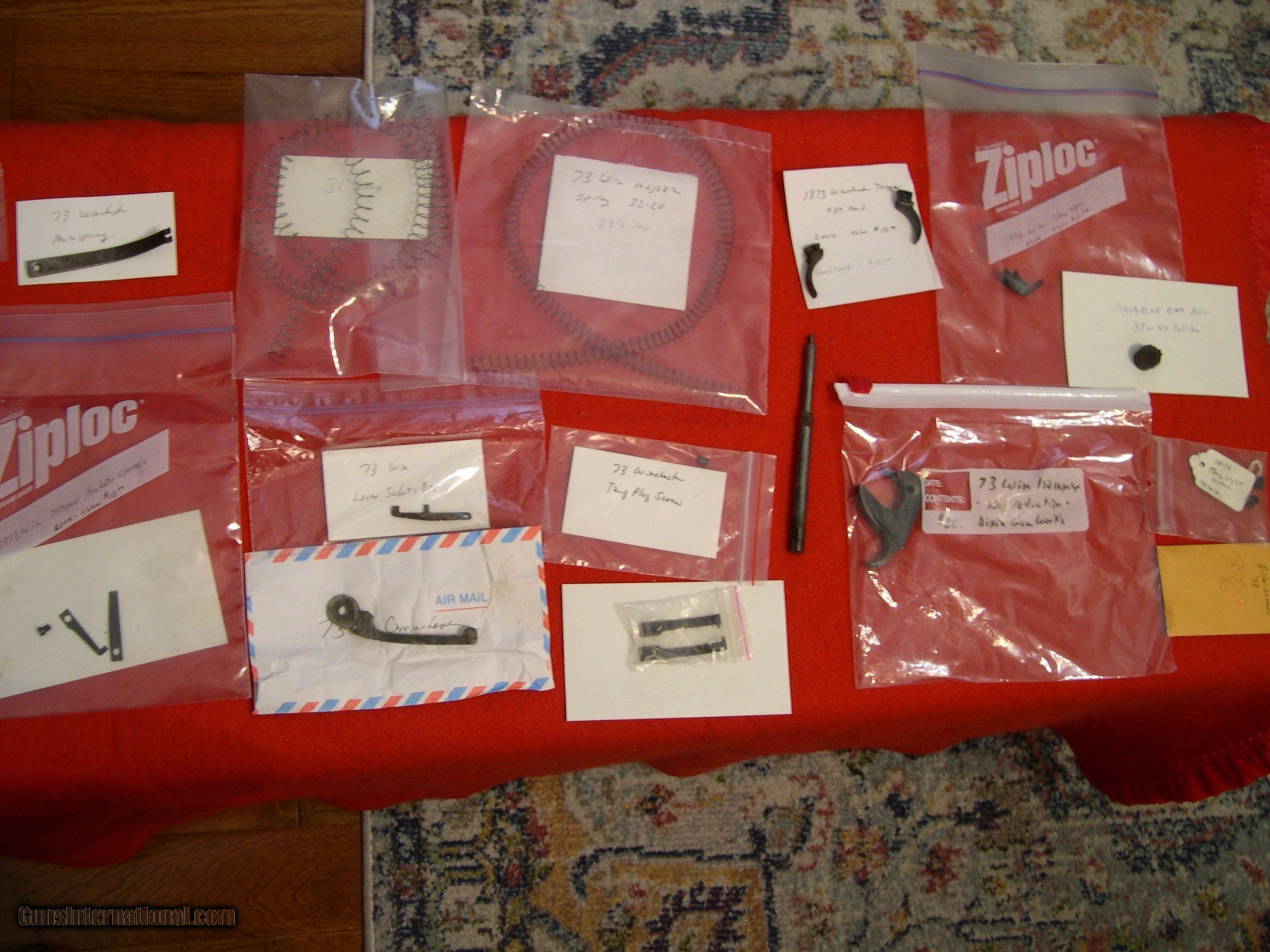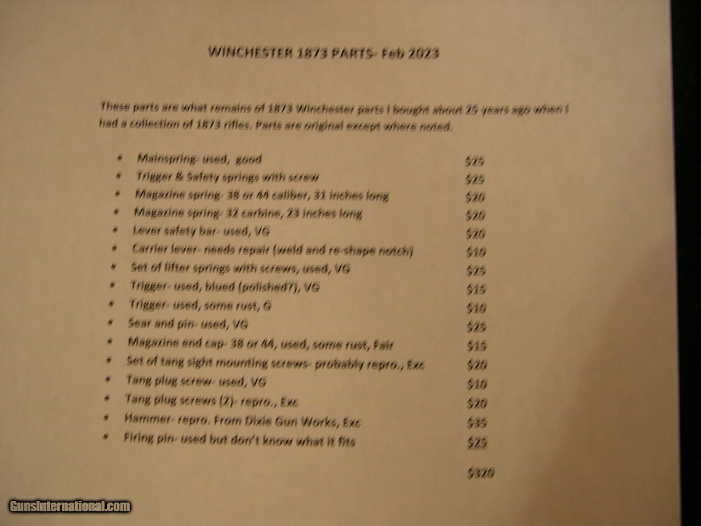 Description: This listing is for a lot of 16 Winchester Model 1873 gun parts or parts sets. Most parts are original, but a few are reproduction and those are so noted in the listing shown in the second photo. Please refer to that listing regarding the description of the parts. I bought these parts about 25 years ago and now no longer have a need for them. The individual prices listed on the sheet is what I believe the parts would easily sell for today. The total of the parts comes to $320, but I am only asking $200 plus $10 shipping so I will not have to list each part for sale individually. SOLD |