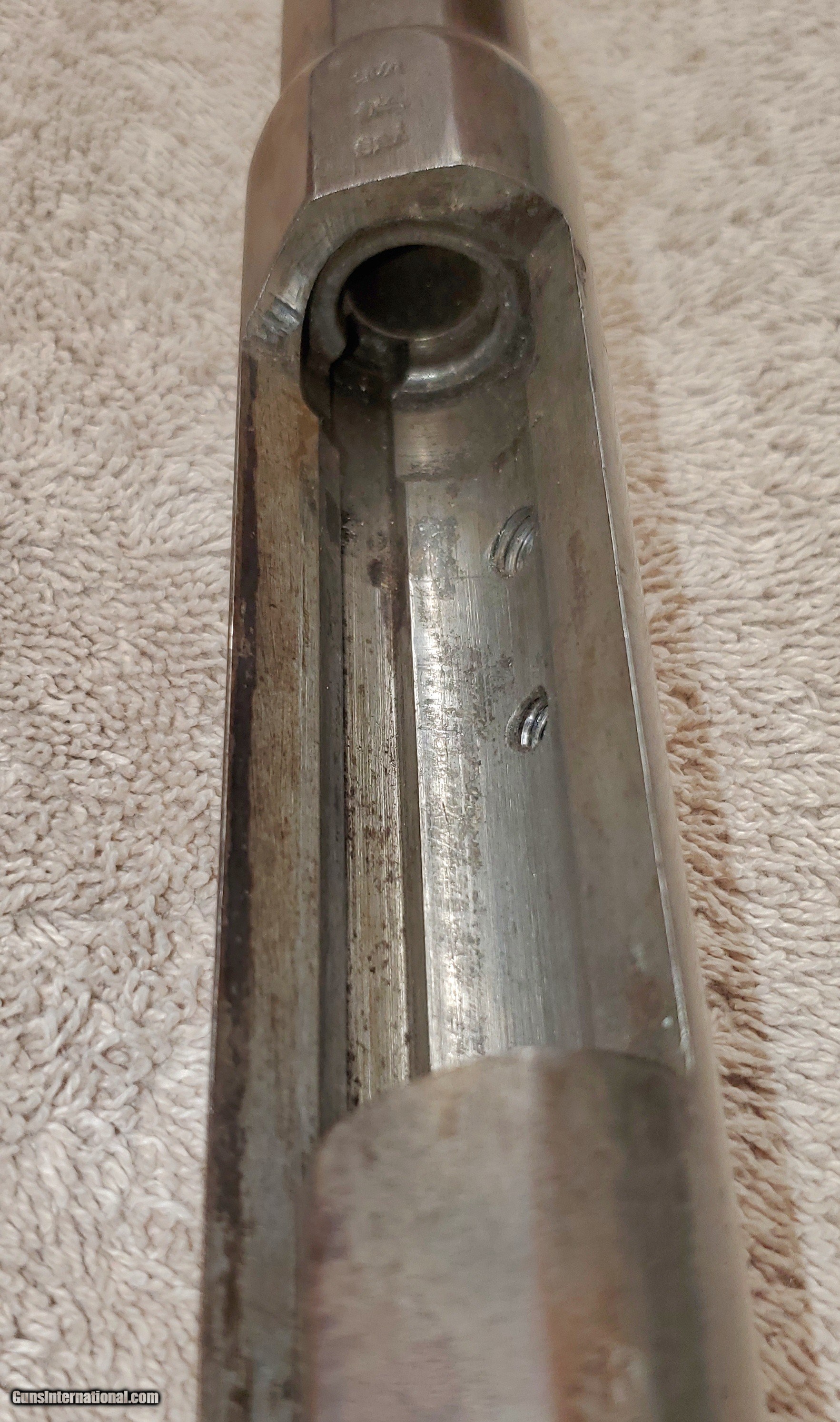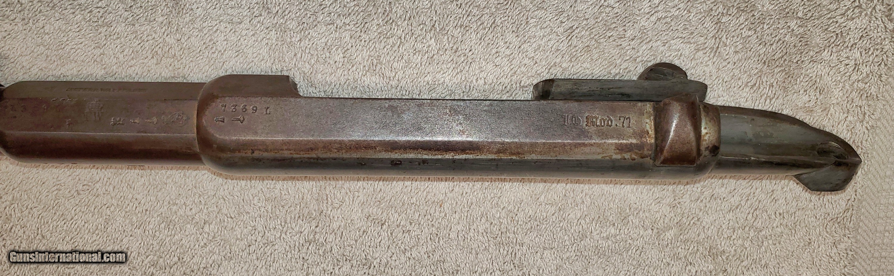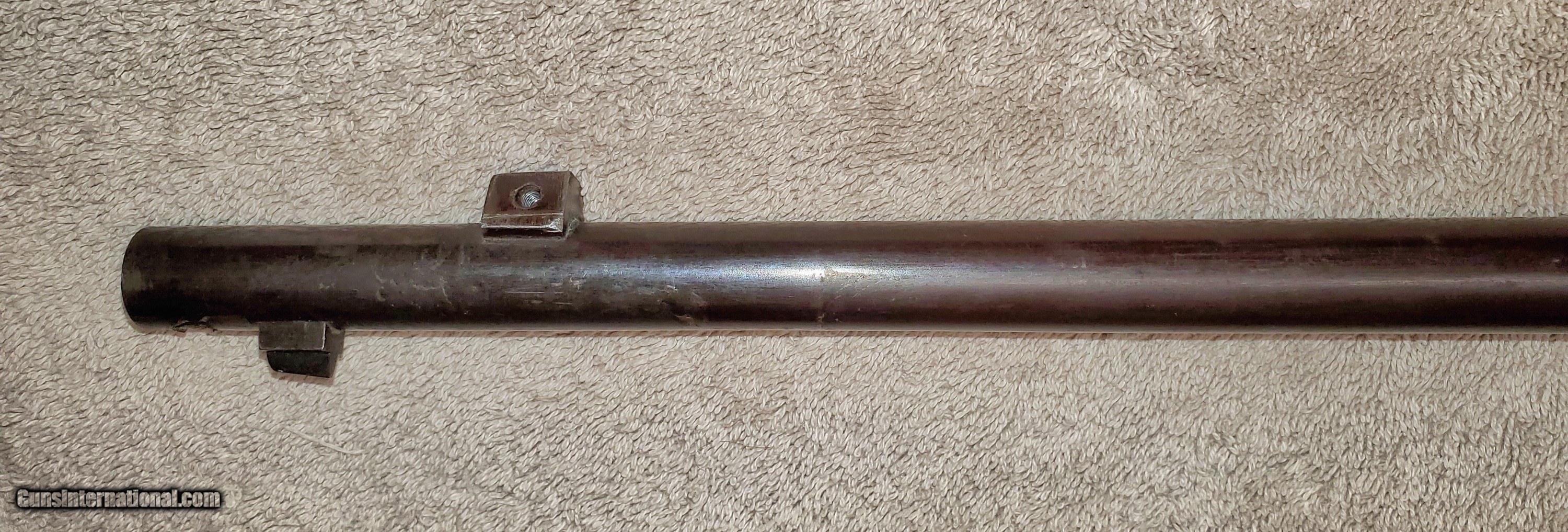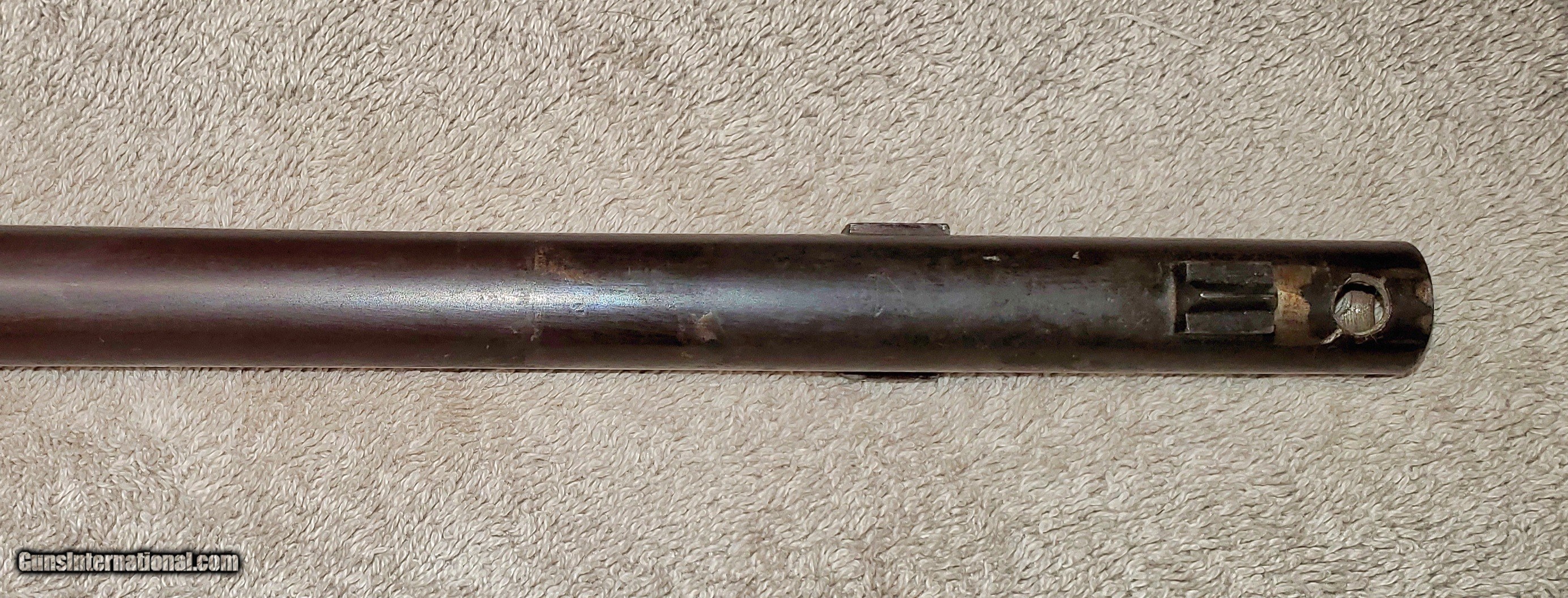 Description: Mauser Infanterie-Gewehr 71 Barreled receiver Receiver, barrel, front and rear sights (trigger assembly and bolt not included). Steyr make in 1874. Unfortunately a previous owner made a lamp out of it and drilled chamber and muzzle of barrel. Muzzle has also been threaded about an inch. Receiver appears to be in great condition. Rear sight ladder is good but missing slider. It has some kind of varnish that can be scrubbed off. s/n 7369L Buyer pays actual shipping cost. Will accept money order or cashier's check SOLD Rifle Caliber: 11x60mm Mauser |