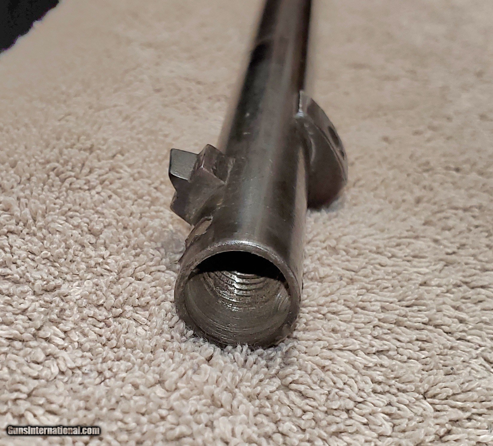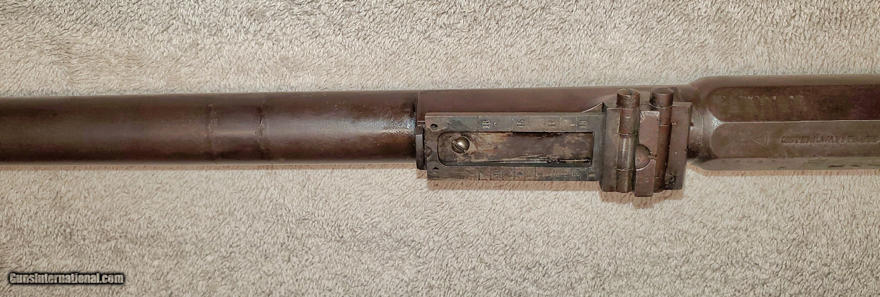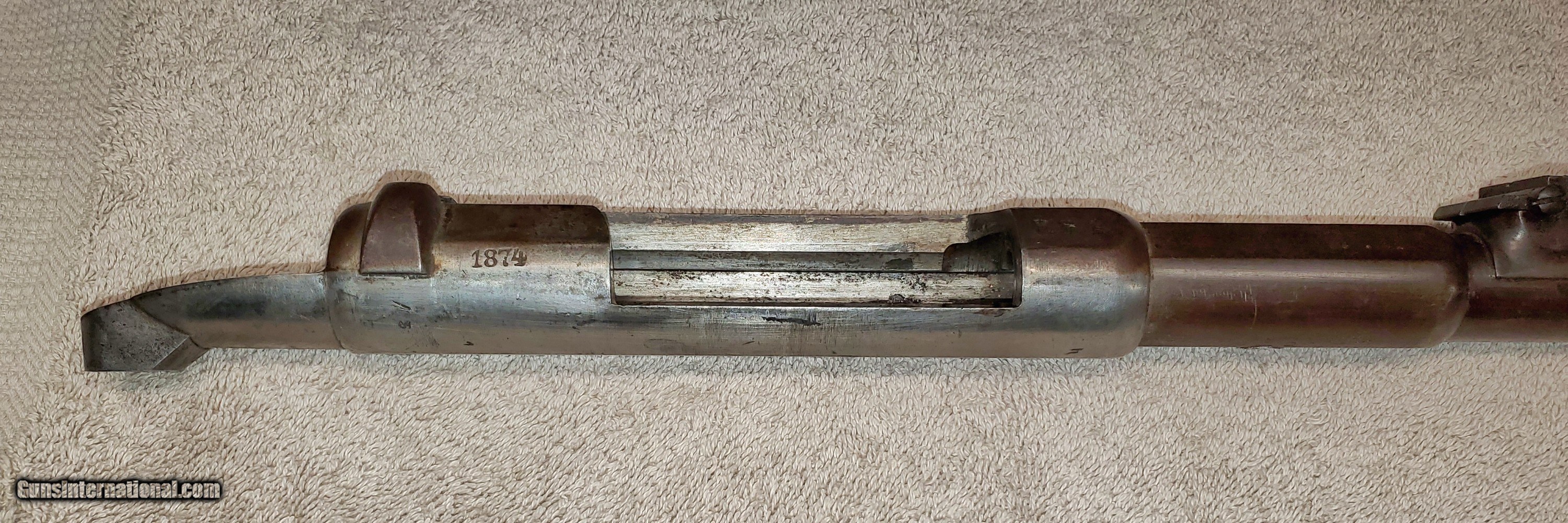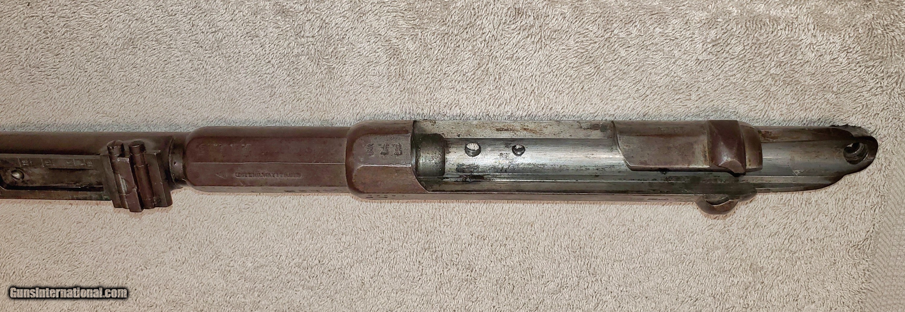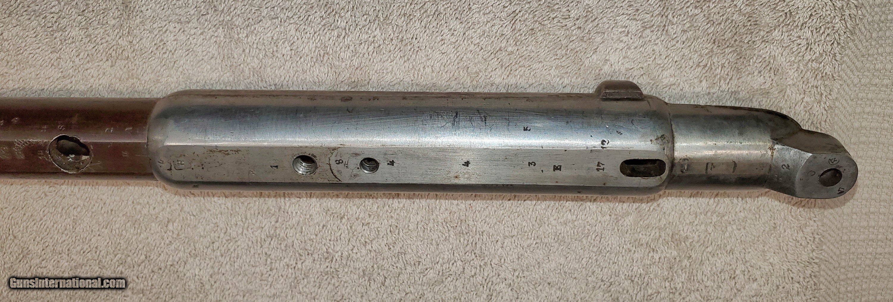 Description: Mauser Infanterie-Gewehr 71 Barreled receiver Receiver, barrel, front and rear sights (trigger assembly and bolt not included). Steyr make in 1874. Unfortunately a previous owner made a lamp out of it and drilled chamber and muzzle of barrel. Muzzle has also been threaded about an inch. Receiver appears to be in great condition. Rear sight ladder is good but missing slider. It has some kind of varnish that can be scrubbed off. s/n 7369L Buyer pays actual shipping cost. Will accept money order or cashier's check SOLD Rifle Caliber: 11x60mm Mauser |