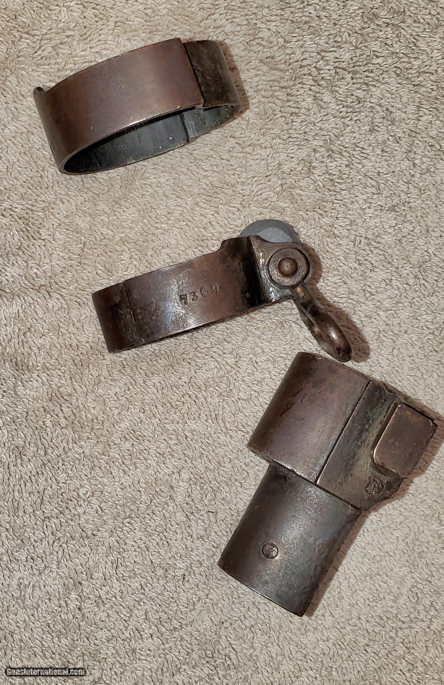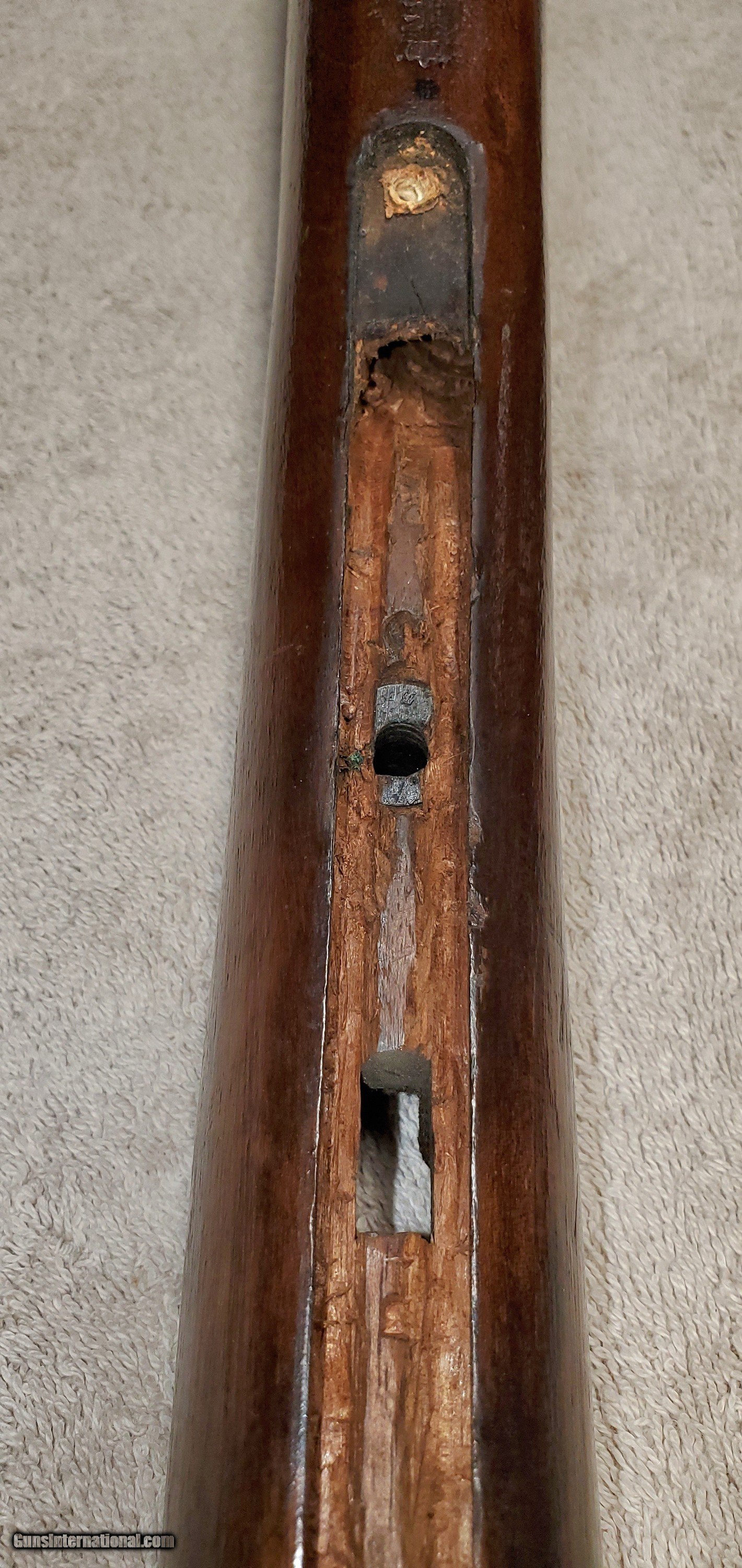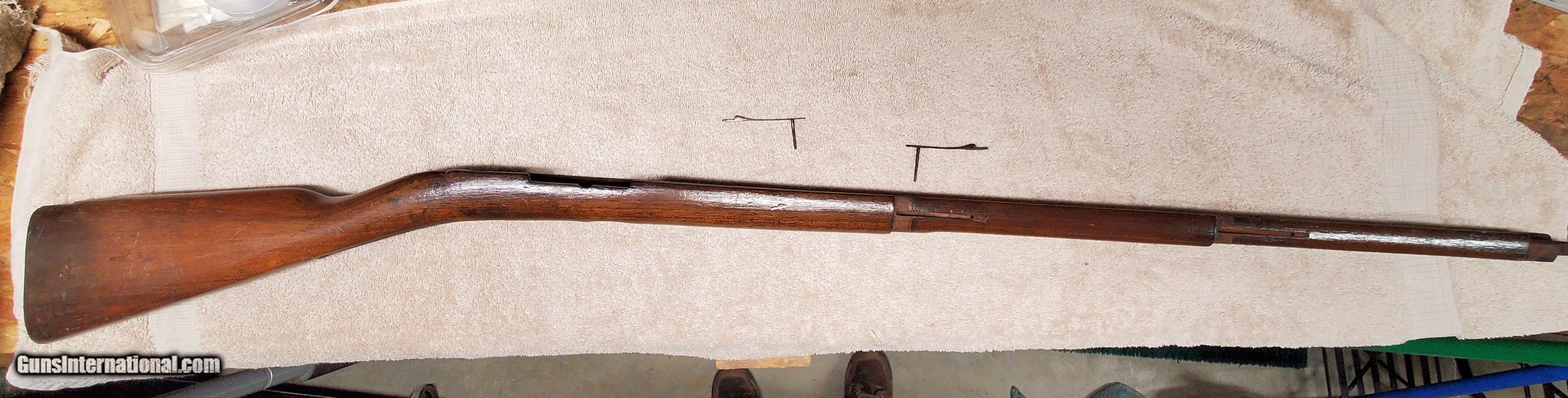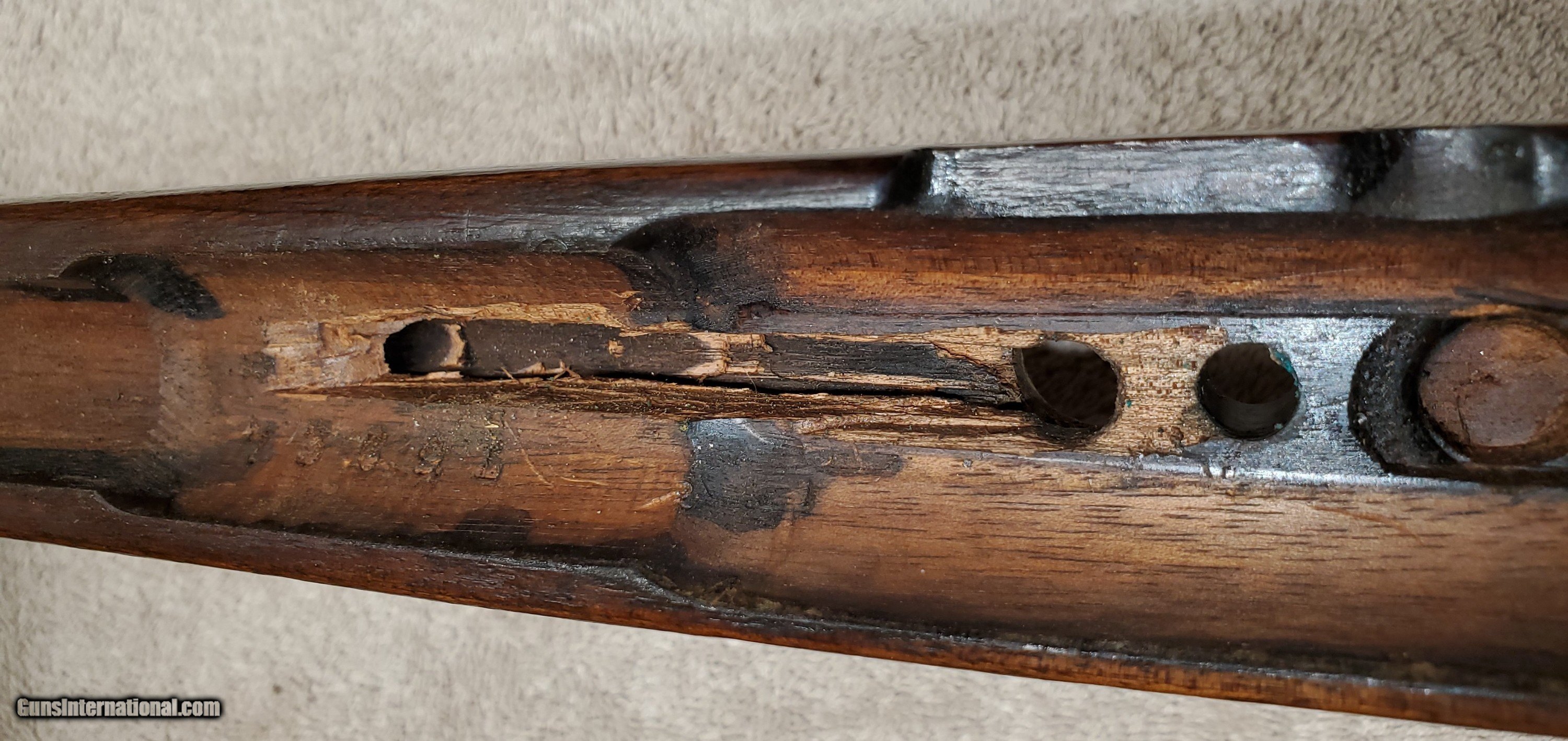 Description: Mauser Infanterie-Gewehr 71 stock assembly Full stock, butt plate, barrel bands and springs, nose cap. Wood appears to be in good condition, maybe sanded at some point. I don’t see any cracks or splits. It has been altered when previous owner converted rifle into a lamp. Butt has been drilled into the receiver area as well as trigger area was altered to run the wires. Stock looks like it can still be used as a shooter. Butt plate is not original to rifle and comes with one screw. Rest of the metal parts are in good condition. It has some kind of varnish applied to wood and parts that can be scrubbed off. s/n 7369L Buyer pays actual shipping cost Will accept money order or cashier's check SOLD Rifle Caliber: 11x60mm Mauser |