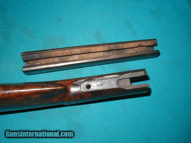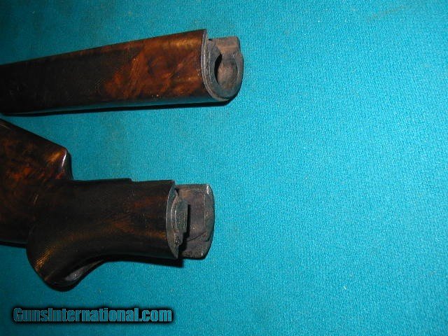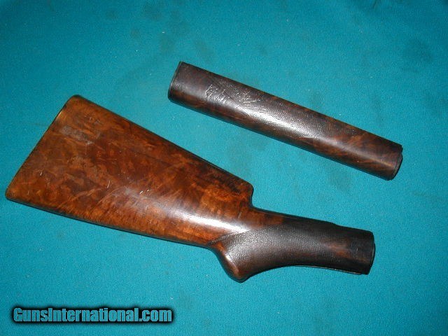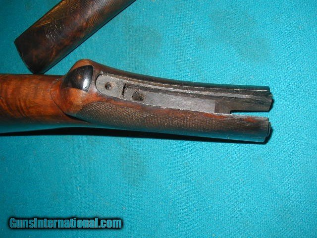 Description: sold pending funds.....THIS IS AN ORIGINAL MODEL 1886 DELUXE 3X WOOD , MATCHING SET FROM AN ANTIQUE 1886 DELUXE RIFLE MADE IN 1889.....IT WAS A LOCAL GUNSMITH TAKEOFF FOR AN OLD CUSTOMER YEARS AGO, AND NEVER FINISHED THE PROJECT....IT HAS 3X WOOD, CHECKERING IS VISIBLE, BUT NATURALLY WORN, NEVER RE-FINISHED, OR SHORTENED, THE ORIGINAL PERFECT FIT BUTTPLATE IS STILL ON THE UN-CUT STOCK , AND HAS A 2.5" X 1/8" SLIVER THAT WAS SPLITOFF YEARS AGO, NEAR THE UPPER TANG JUST BEHIND THE THE RECIEVER ON THE LEFT SIDE, AS PICTURED...... SOLD |