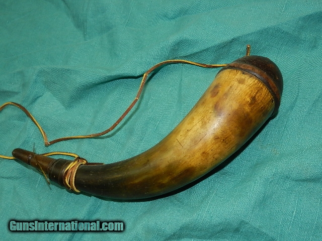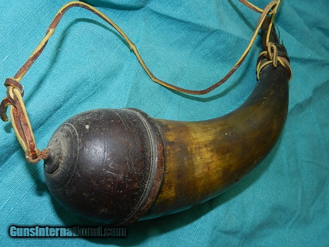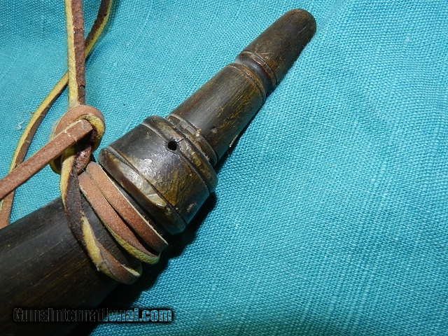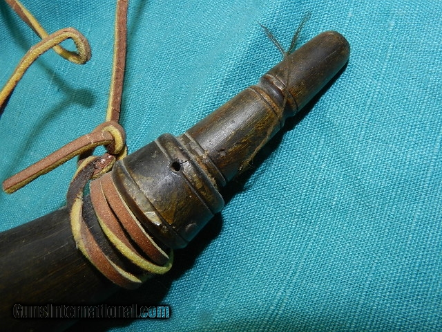 Description: This very early flintlock era powder horn has classic design, and superior workmanship, with a hand turned bulbous hardwood plug and intricately carved spout not found very often. The overall length is about 13", and the horn has a great aged look. A recent leather strip was added to hang next to a mantle hung flintlock early musket. We don’t have asite .I prefer money orders or a check. Item ships when funds come in. If you can only pay with a card let me know. I hope you like my wide selection of unusual guns, knives and gun parts. Shipping price determined by zip code. I try to keep the prices affordable, which means I make less money than most dealers. You won’t get altitude sickness with my prices! I consistently have the best selection of older guns If you BUY IT NOW you must still contact us for details buy it now doesn't end the sale, it just sends an email telling us you want to buy this gun. A phone call won’t secure a sale! Not home many times, the first buyer by email buys the gun !Thissite doesnot close down a sale when you do a BUY IT NOW like Ebay!I can get six buy it nows in an hour, first buyer to email gets the guns, others are in second place! Best to send another email . Sometimes not home to get calls. Some guns are required shipment to a gun dealer near you for a transfer to you when it arrives. With the widest selection of older guns at great prices, We don’t have a store, and sell on the internet only. SOLD |