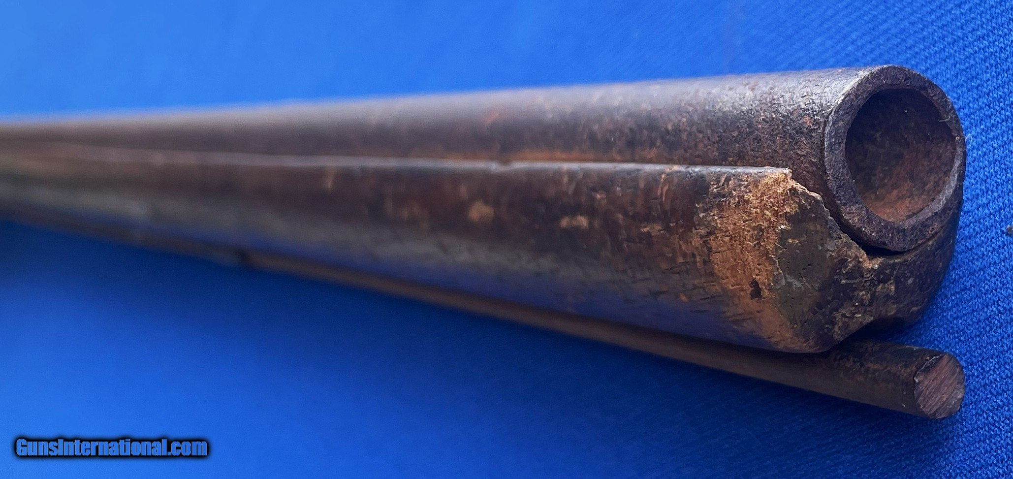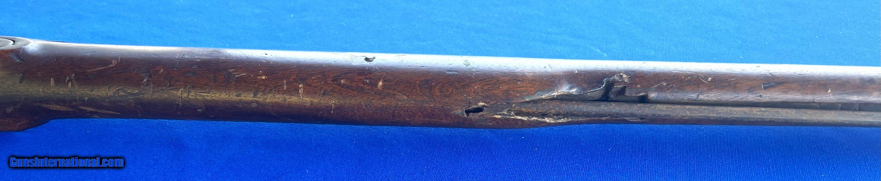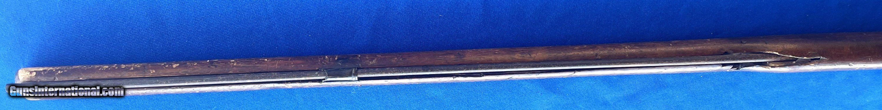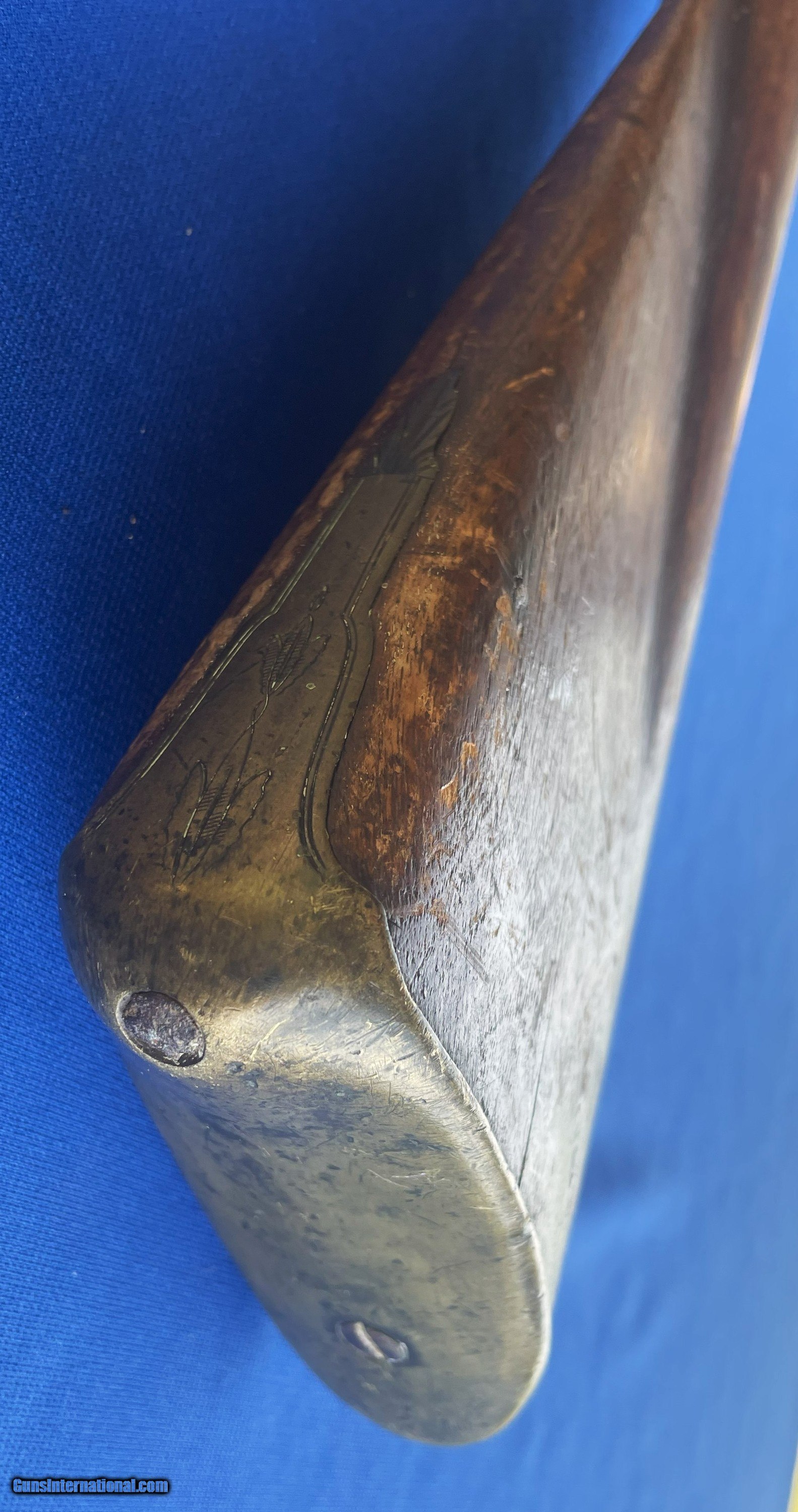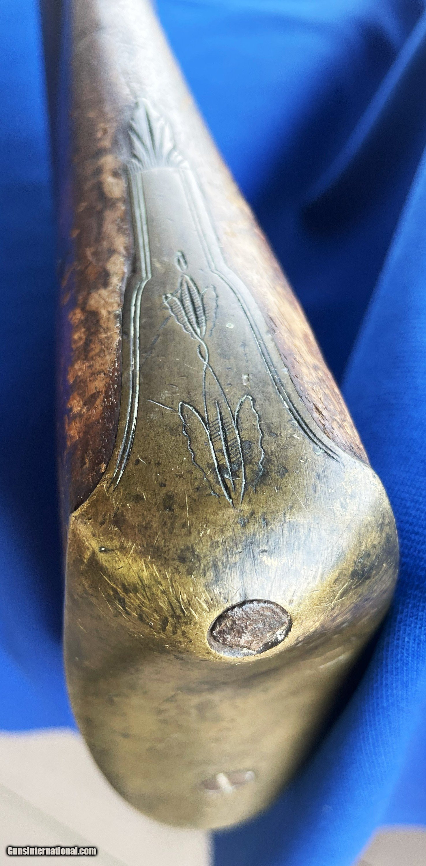 Description: FLINTLOCK 1790 ERA .45 CALIBER FOWLER MUSKET PROJECT, PARTS or DISPLAY. POSSIBLY A NATIVE AMERICAN TRADE GUN or A VERY NEGLECTED MILITIA MUSKET ? LOCK MARKED "KETLAND" ABOUT 51" LONG WITH 35 1/2" BARREL WITH ENGLISH PROOFS. FULL LENGTH STOCK FITTED WITH ENGRAVED BRASS TRIGGER GUARD, MONOGRAM PLATE & BUTTPLATE. FOR RESTORATION, PARTS or EXCELLENT OVER THE MANTEL DISPLAY GUN. SELLING AS PICTURED FROM A NEW ENGLAND COLLECTION FOUND YEARS AGO IN THE ATTIC OF A CHAMPLAIN VALLEY VERMONT FARM HOUSE. THIS MUST BE SOLD ASAP. OFFERS WELCOME ! $55.00 S&H DIRECT TO YOU ANYWHERE IN THE U.S. SOLD Rifle Caliber: .45 |