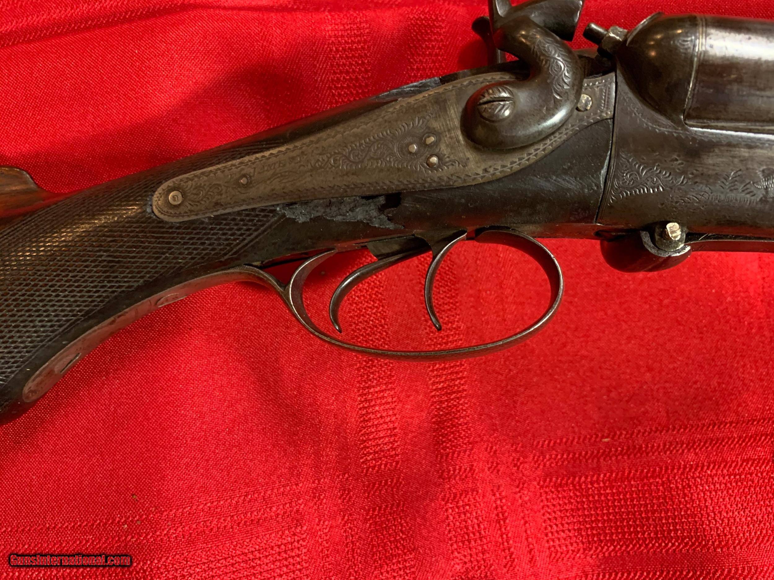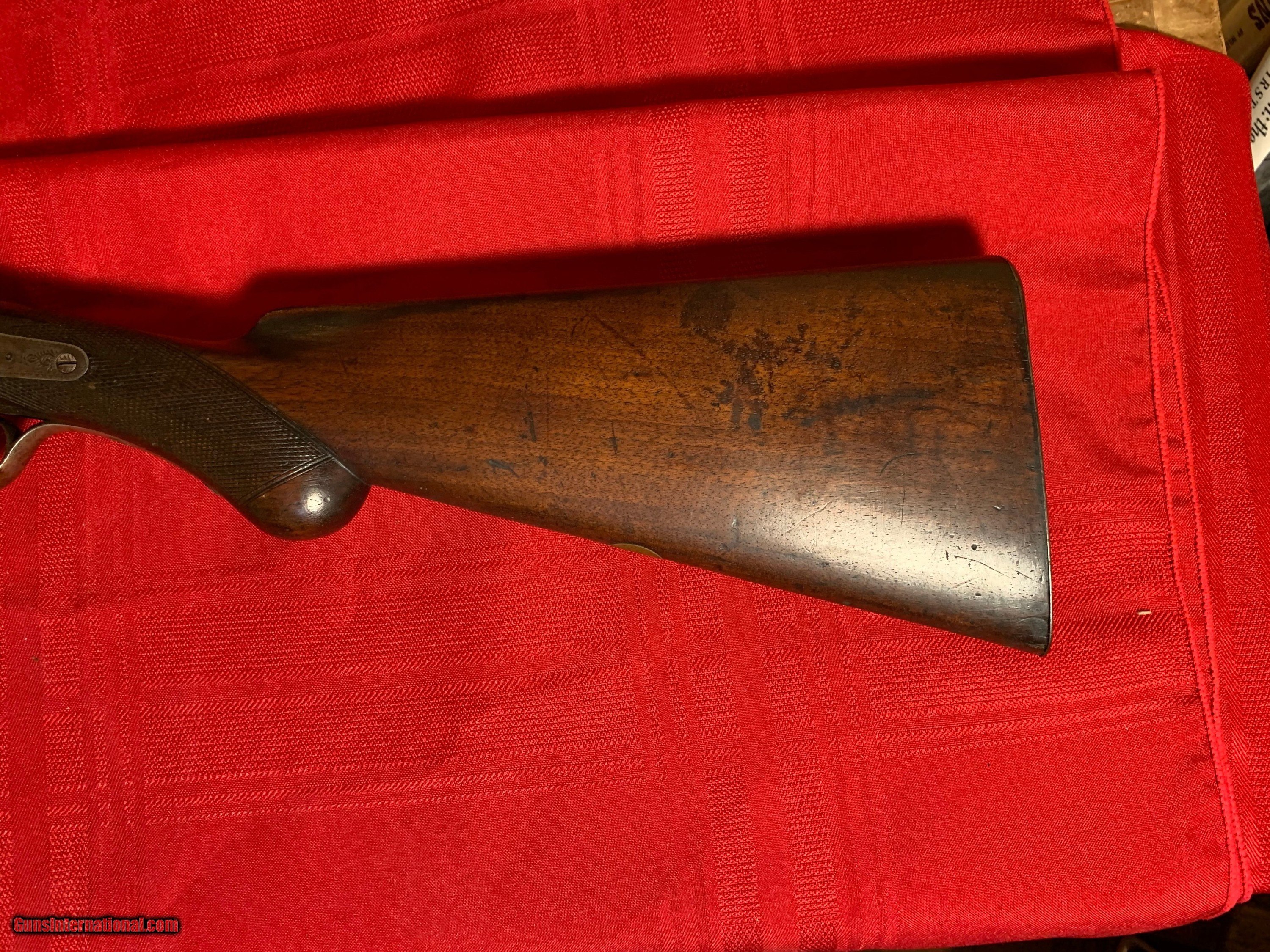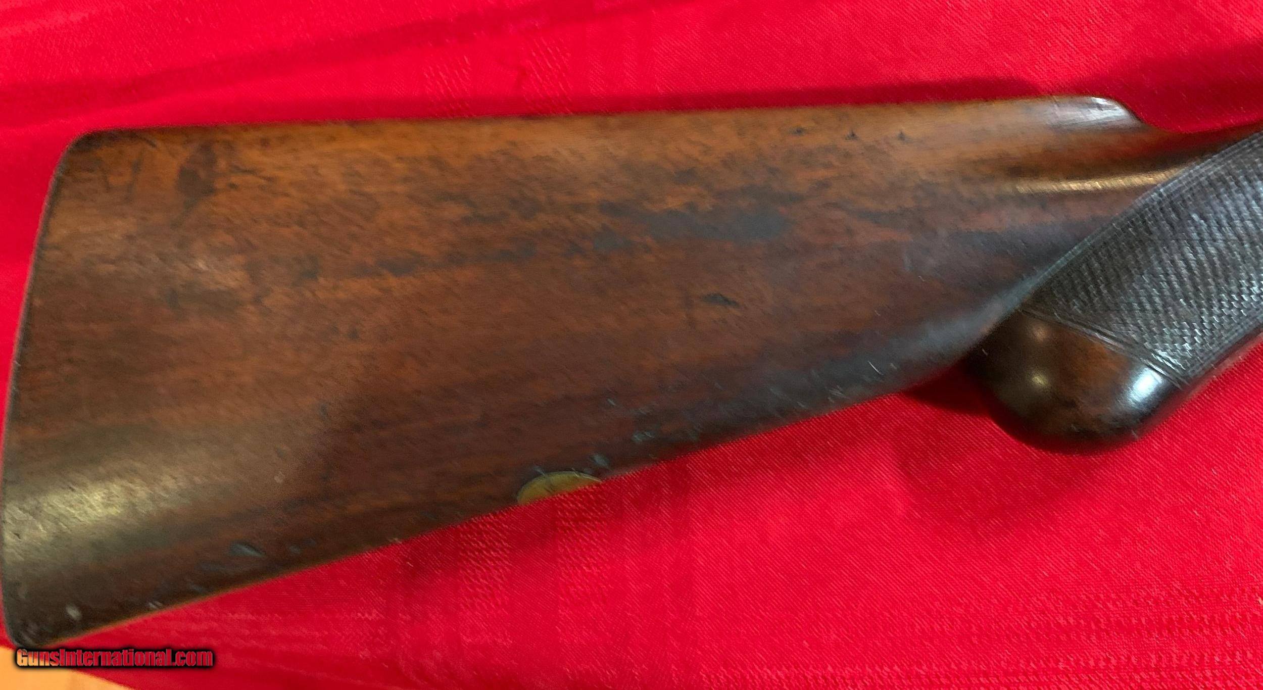 Description: Project 12 gauge British double. 32" barrels marked 14 gauge with dark bores that can be honed. Off face. stock work needed at head (see pics). Lightly engraved. SOLD |