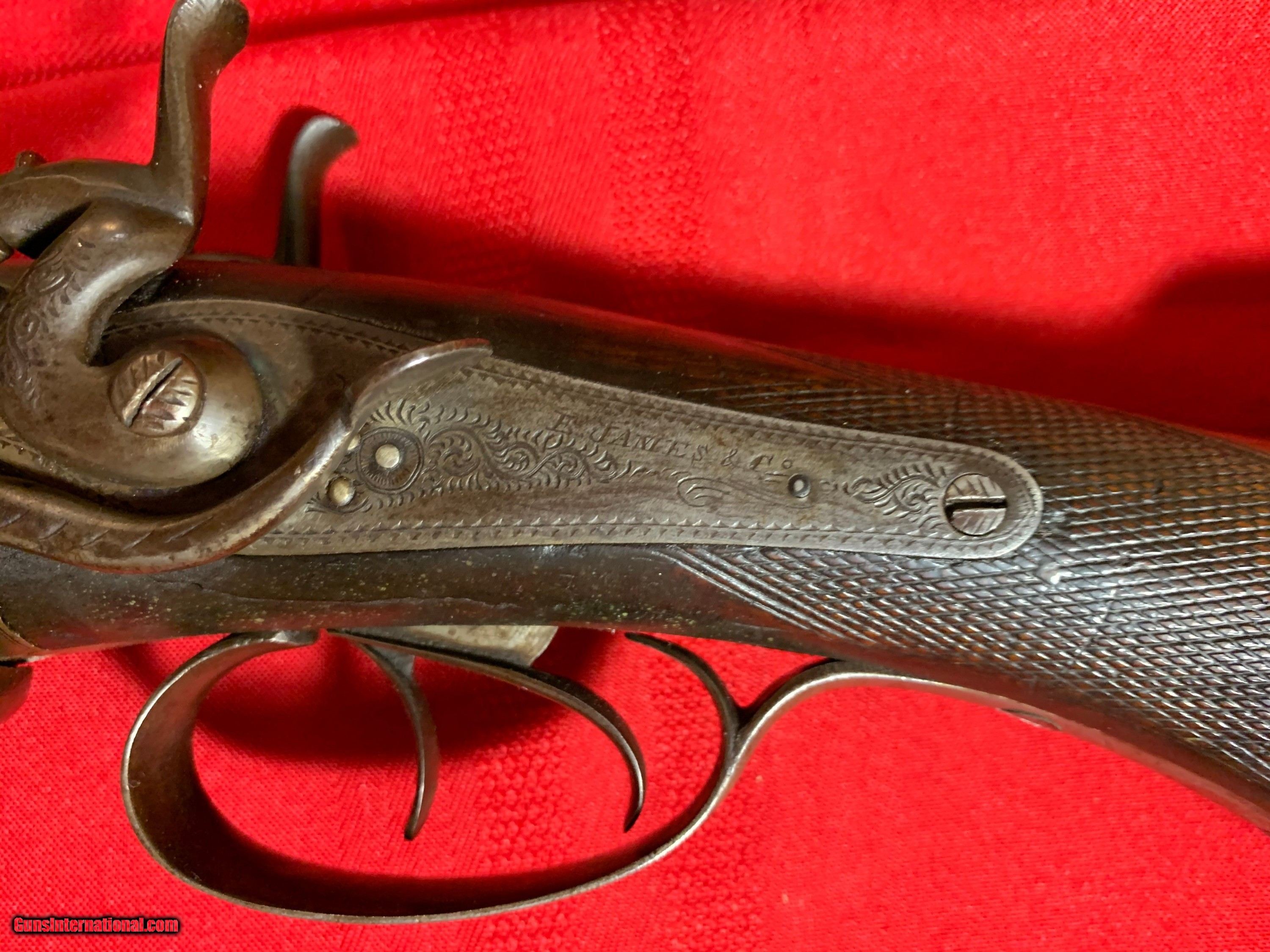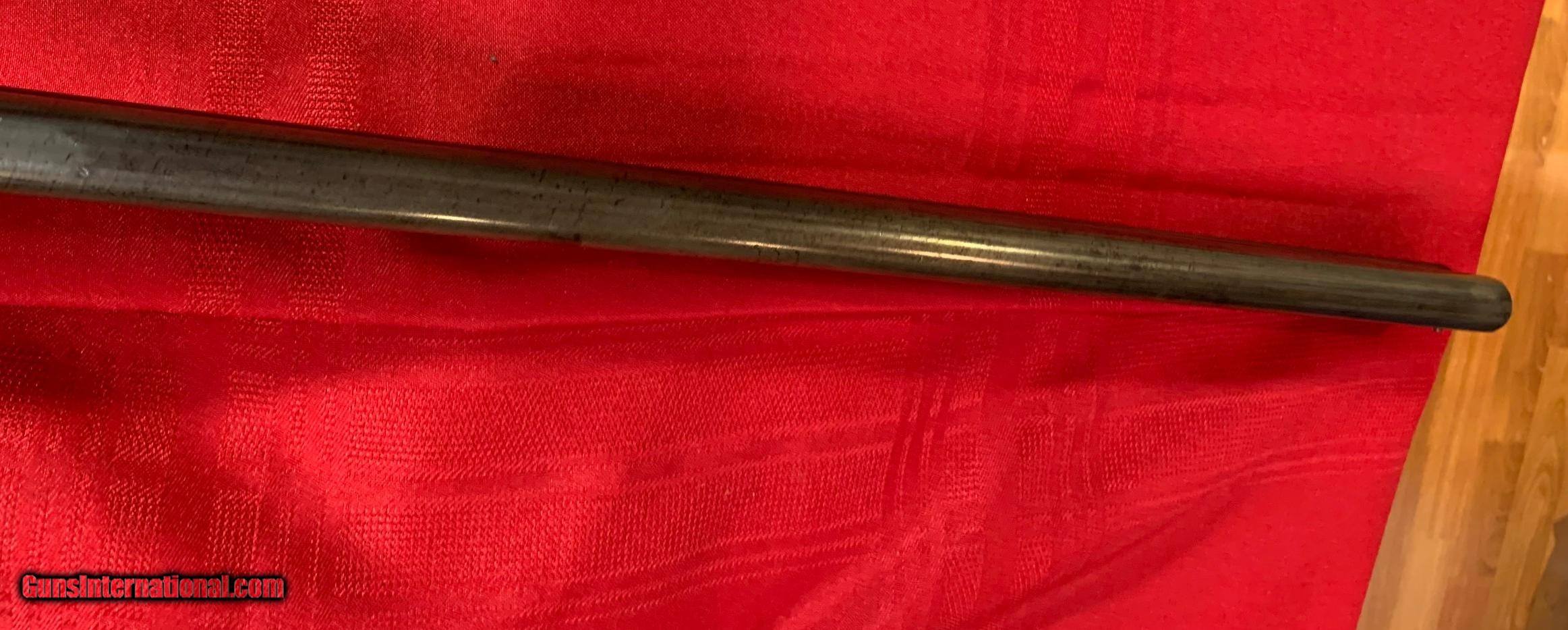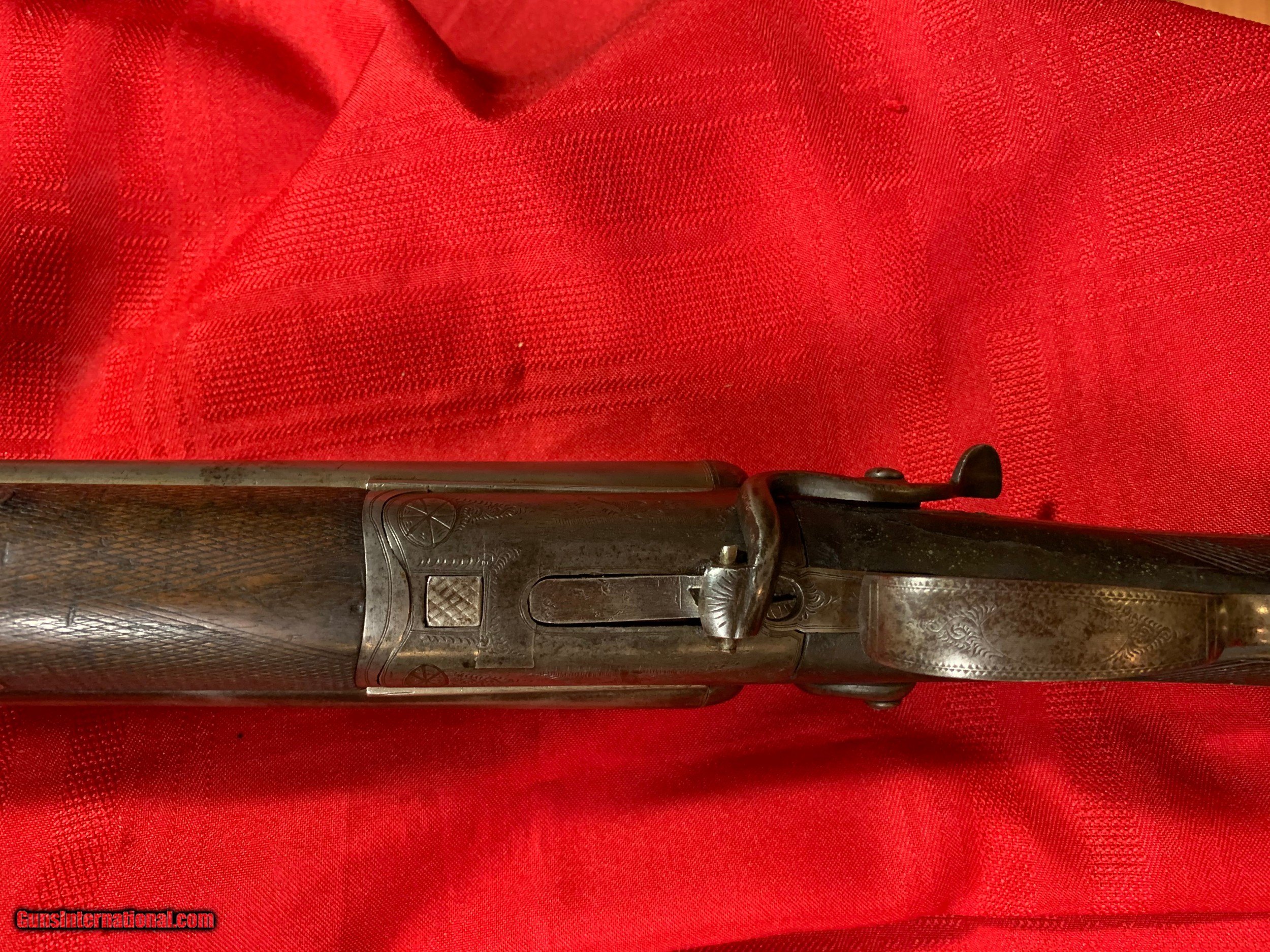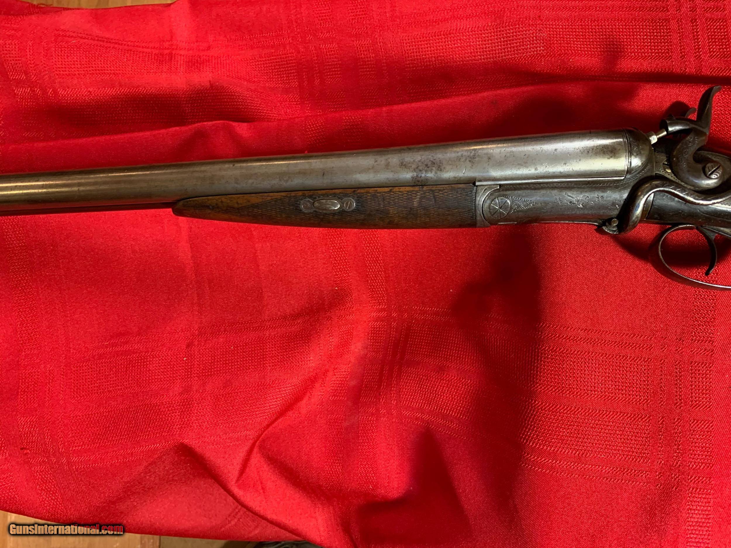 Description: Project 12 gauge British double. 32" barrels marked 14 gauge with dark bores that can be honed. Off face. stock work needed at head (see pics). Lightly engraved. SOLD |