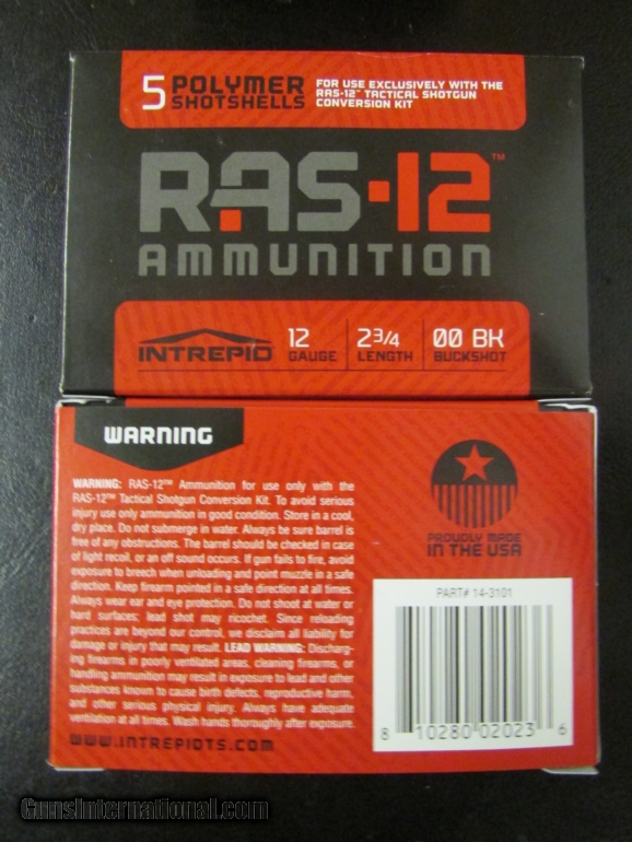 Ammunition Specs: Manufacturer: Intrepid Tactical Solutions of Columbia Falls, MT Caliber: RAS-12 12 gauge Load: 9 Pellet 00 BK Muzzle Velocity: 1200 fps Quantity: 200 Rounds (20 Boxes of 10) Description: Designed exclusively for the RAS-12 modern sporting shotgun, RAS-12 ammunition is the first polymer shot shell designed to stack vertically and work flawlessly. Features additional payload capabilities as a result of cutting-edge design. Shipping to Lower 48 Only, Shipping $35.00, KNOW YOUR LOCAL AND STATE LAWS!! SOLD |