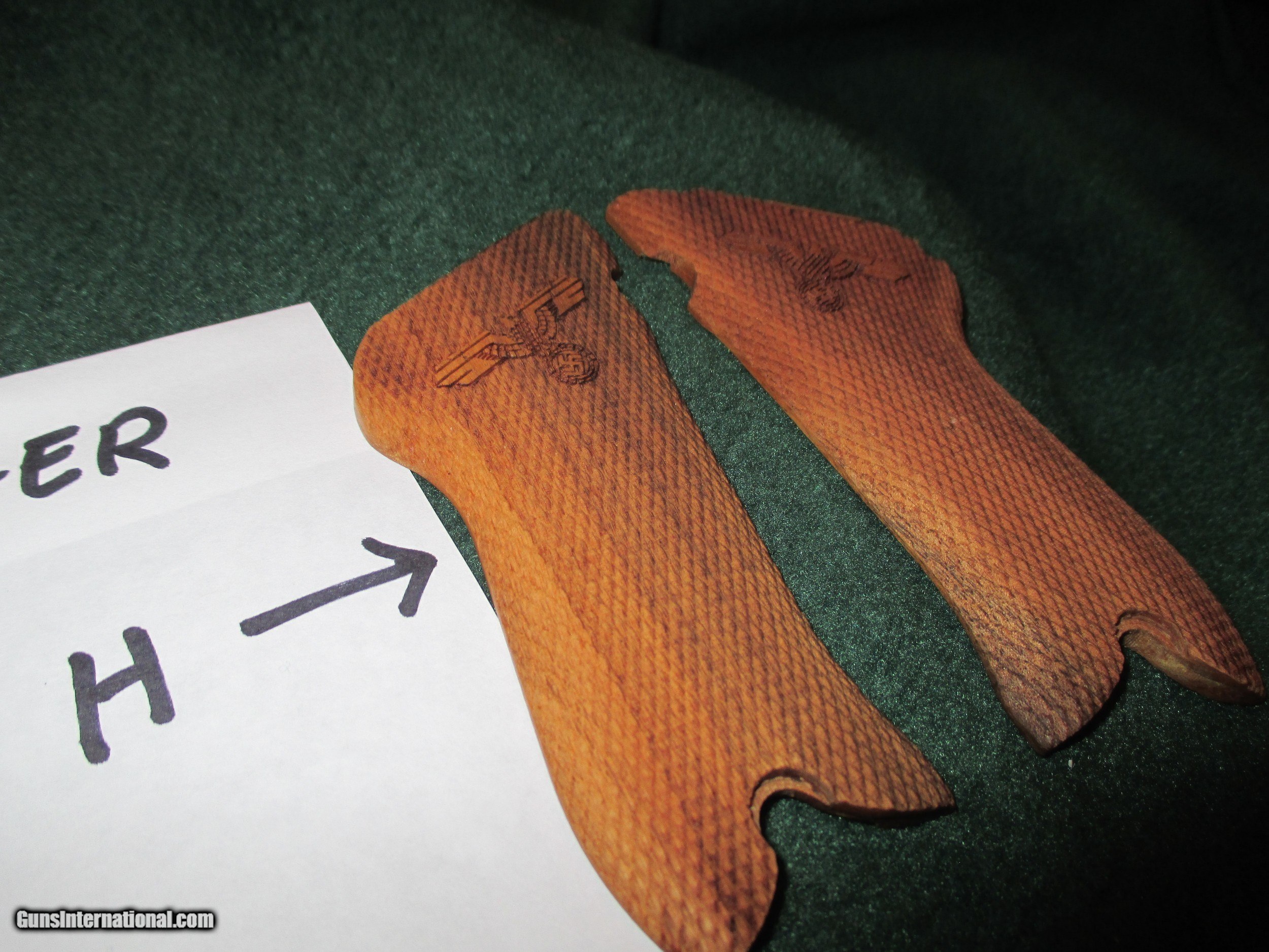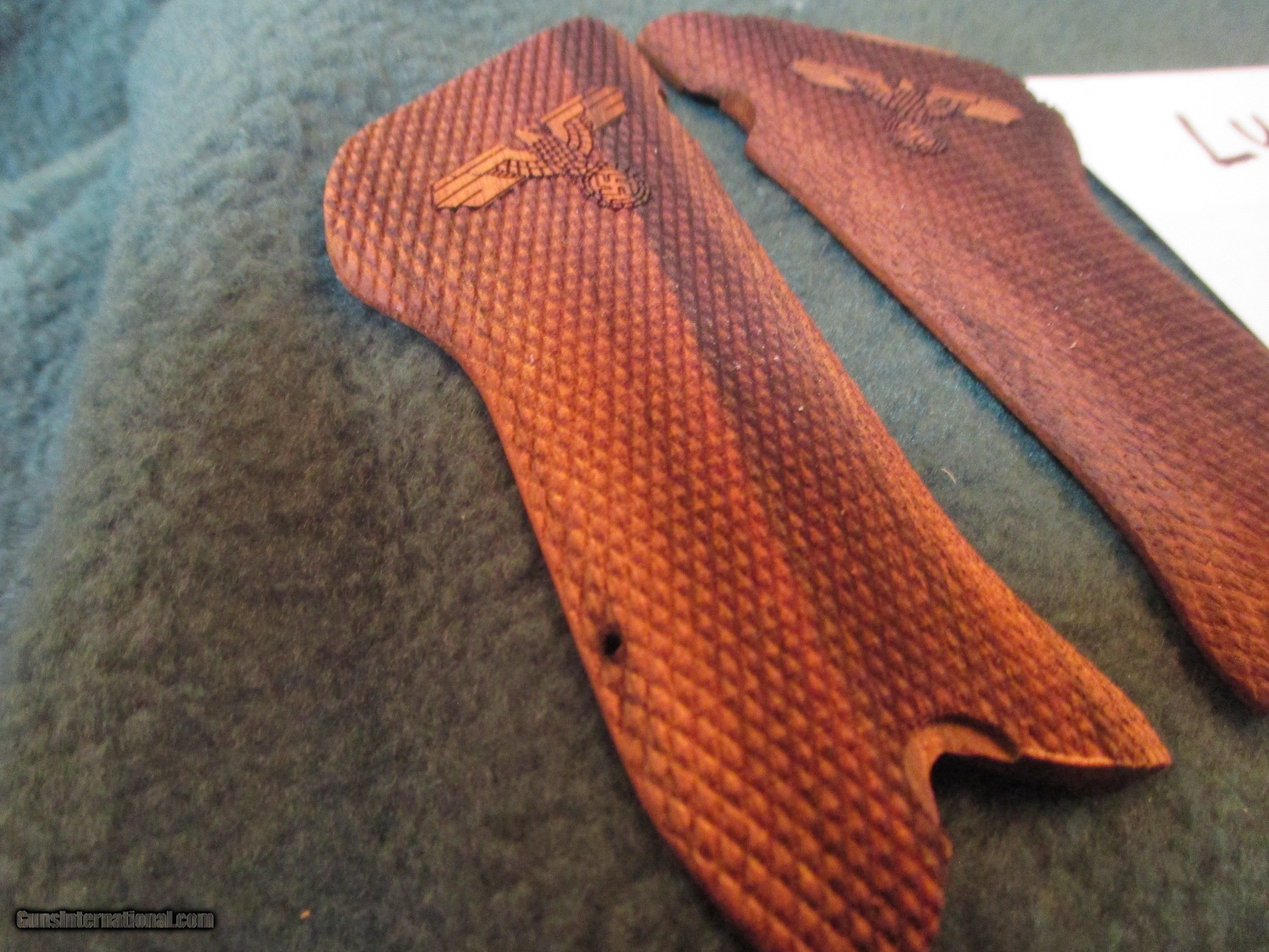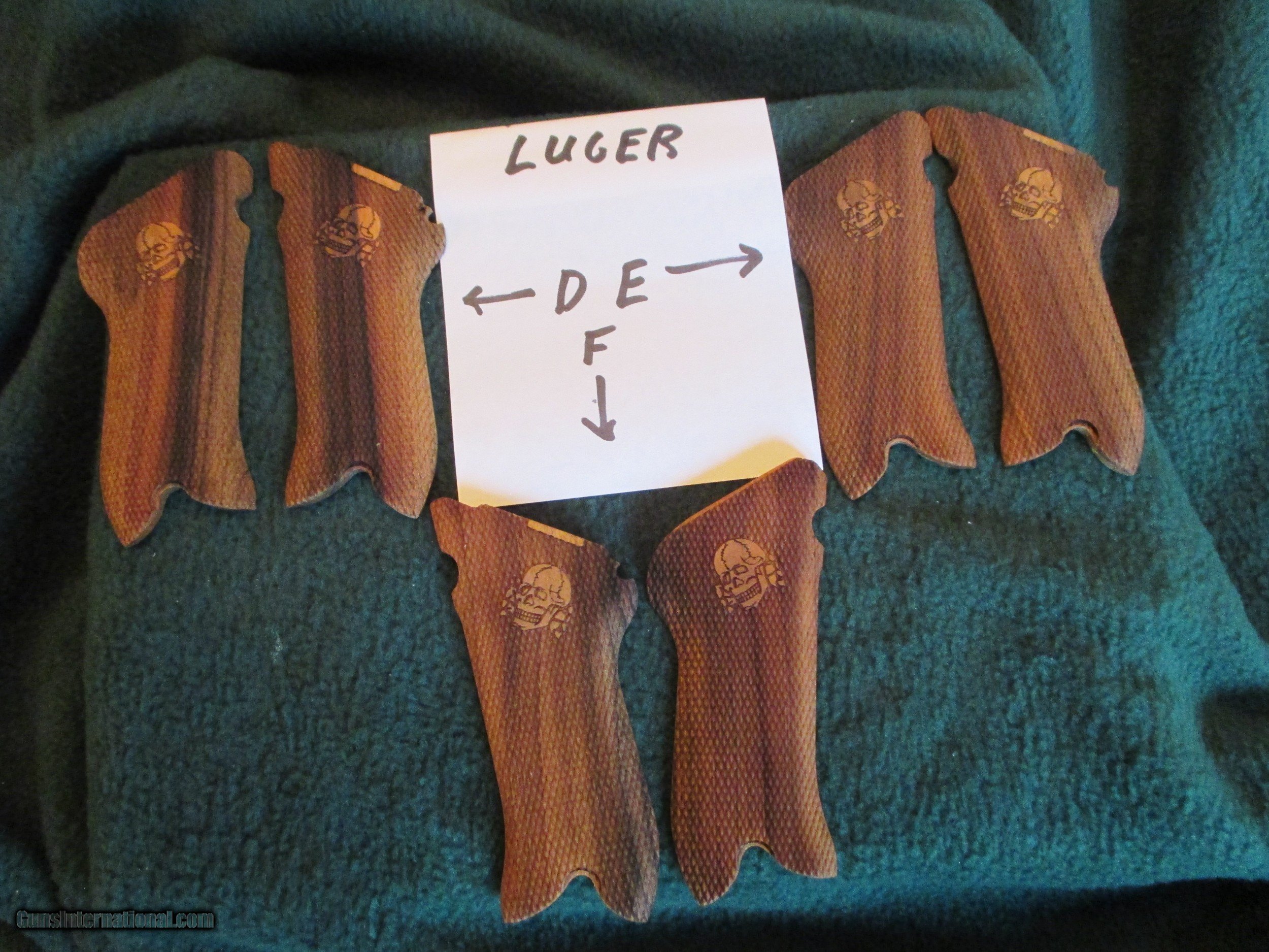 Description: Luger pistol grips pictures D E F and G H. Stallionfirearmsgmail Personal Check or Postal MO. Price includes shipping. Tiny pin hole in G. SOLD |