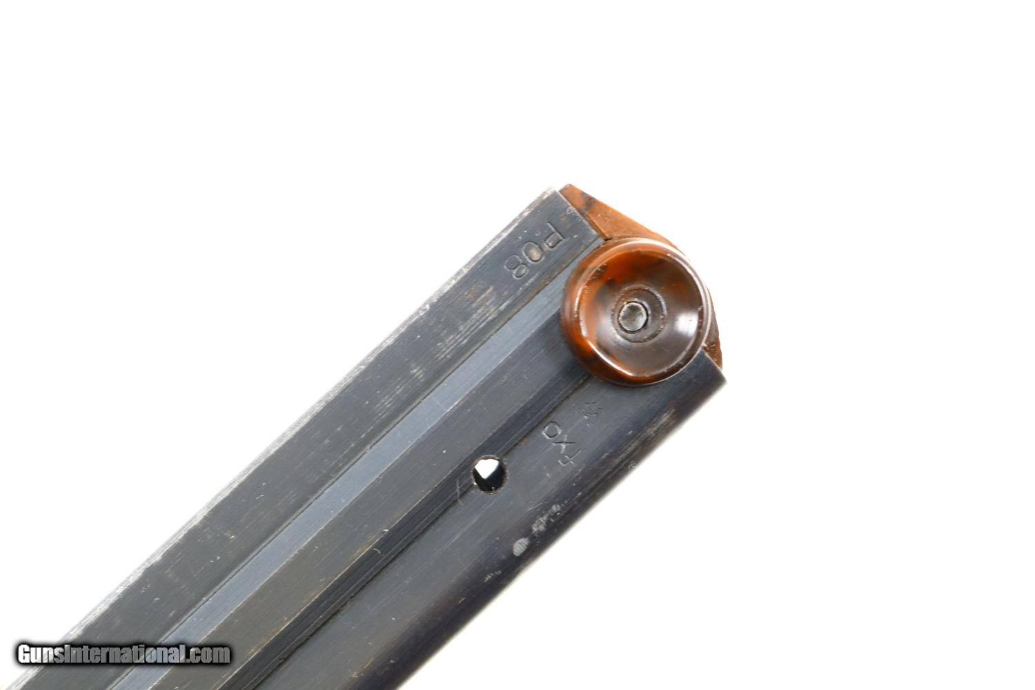 Description: Luger magazine, late extruded WWII, replacement base. Synopsis: Luger Magazine, Late WWII, Replacement Base, X-238 Condition: VG+ with replacement base. ~~Insured shipping fee of $35; most packages shipped using FedEx 2nd Day.~~ SOLD Manufacturer: Mauser Caliber Info: 9mmP |