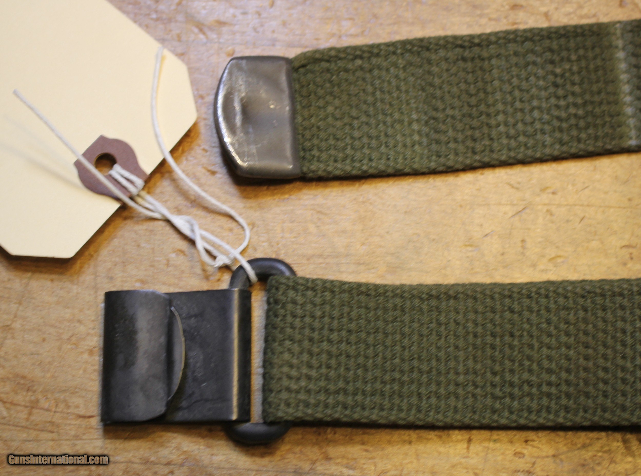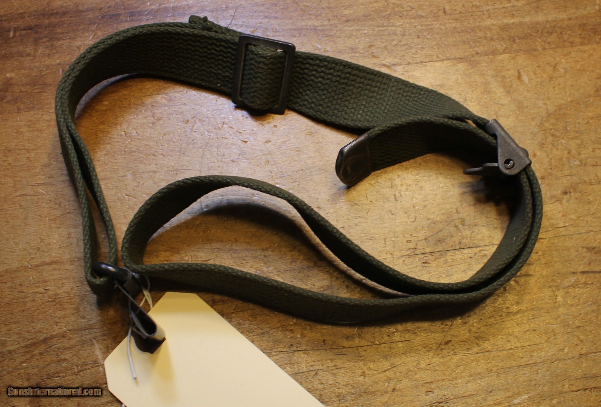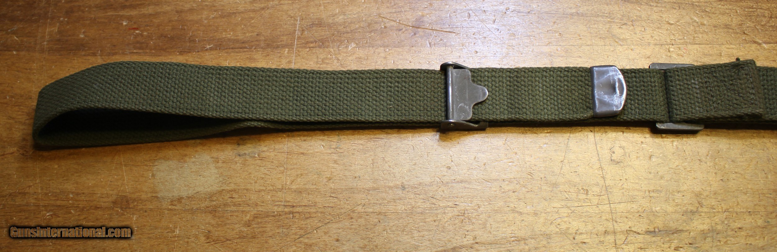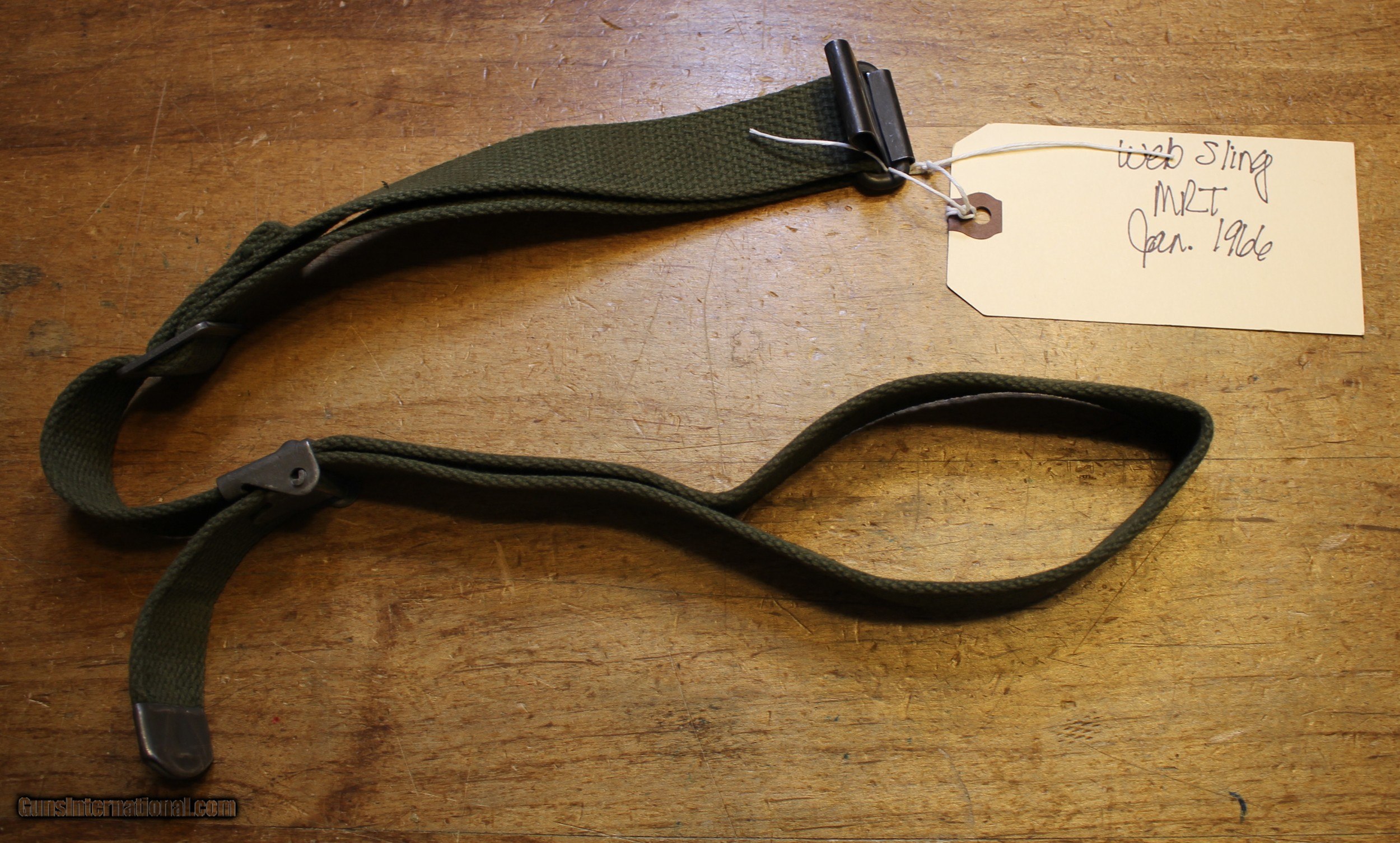 Description: Original USGI Cotton MRT (Mildew Resistance Treatment) January 1965 dated M1 Garand \ Springfield Rifle Sling. This sling would have also been appropriate for the 1903 , 1903A3, and 1903A4 series of rifles also. The pictures are of the actual rifle sling you will receive. We do NOT use "representations" This is USGI and as you can see in the pictures. I have no idea whatever those letters and numbers mean. My military "Stuff" and "Wartime" gear knowledge is "zilch" and am using the estate where this came from as the authority. NOTE: Look close at the pictures as the item you see is the one you get. We have hundreds more World War II (WWII) and military firearms components we will be listing so please keep checking our other listings. This came from the estate of one of 5 (five) FFL/SOT Gun Smith, Gun Store. The particular estate was an avid collector of Garands and components. This is from the collection or was inventory. There will be countless other listings from this inventory over the next 4 to 5 years. We are selling for the each of the estate/stores. This is NOT a liquidation. There are no lists and will be no lists. Please check our other listings for more items Please also check our Webpage and or Facebook page at P&T Partners Shipping is $8.50 for Priority Mail Personal checks accepted, we do not hold until clear for parts. Postal Money orders also accepted, Credit card by PHONE only and there is 3.5% for use of the credit card. SOLD |