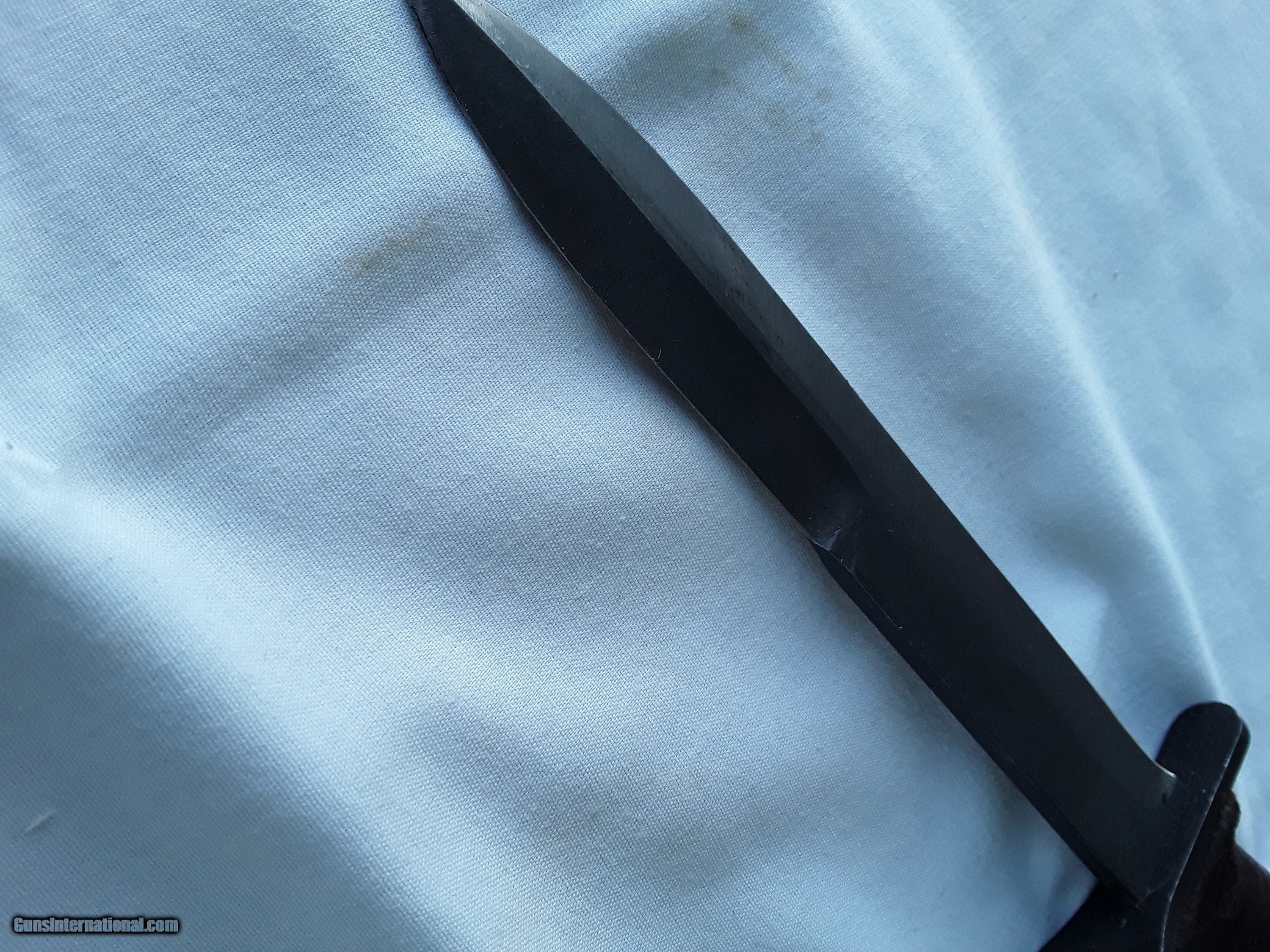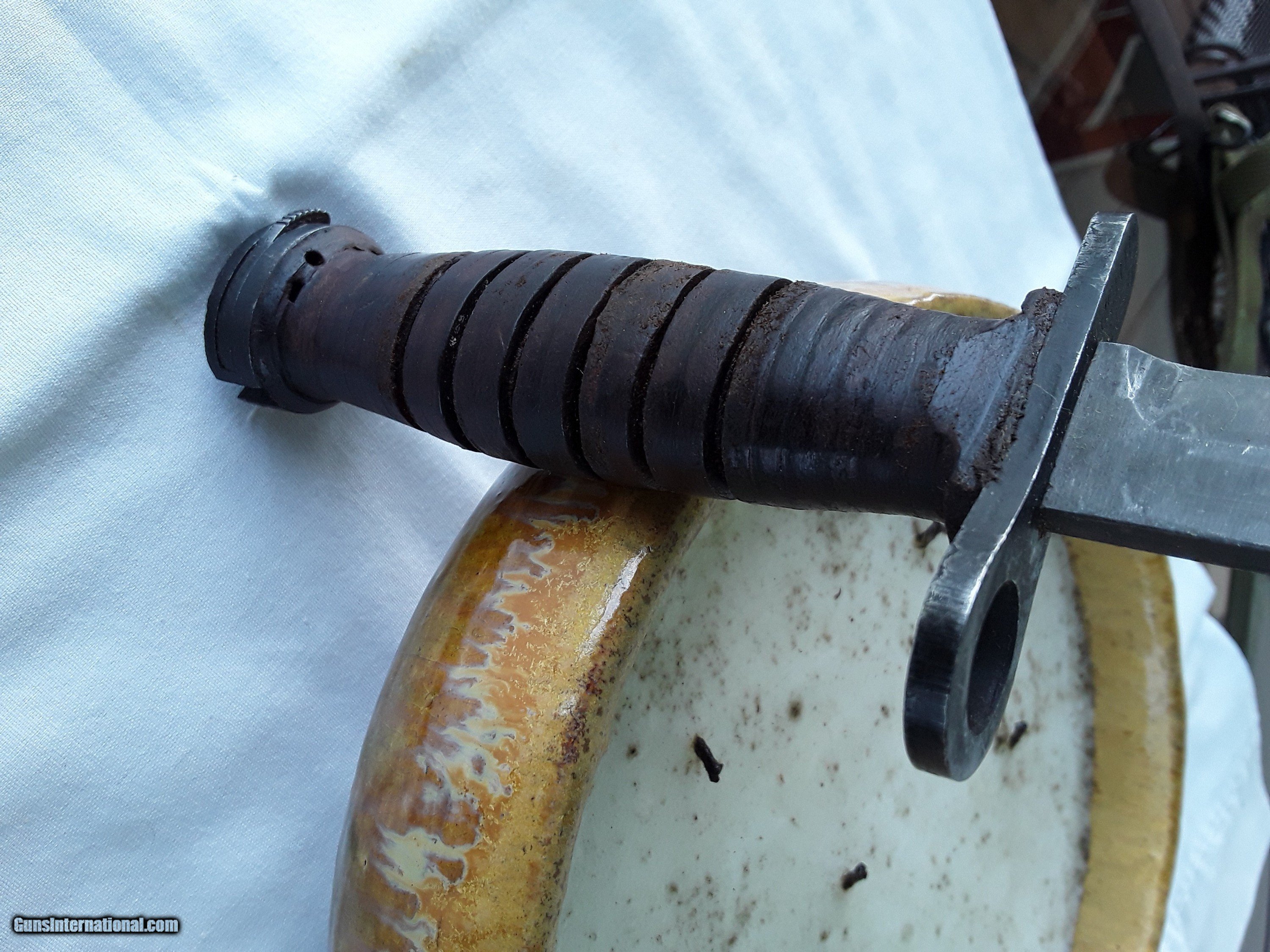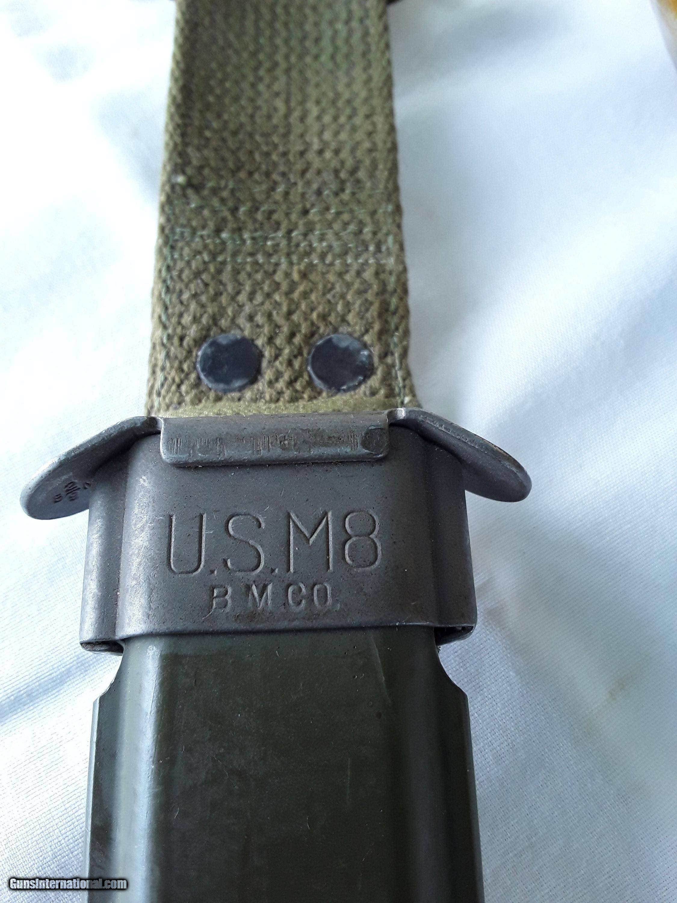 Description: This is a WWII M4 Utica carbine bayonet with a US M8 scabbard marked BM CO. Both are in excellent condition. The price includes shipping. If you have questions, call me at 228-216-4102 or email at uncleronnie43gmail SOLD |