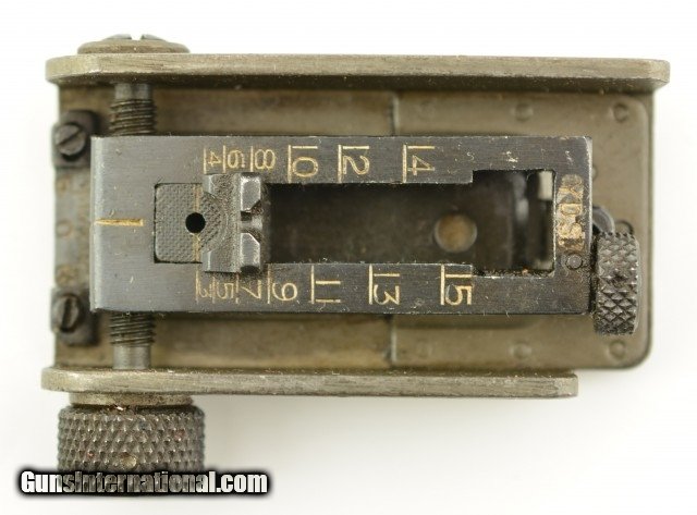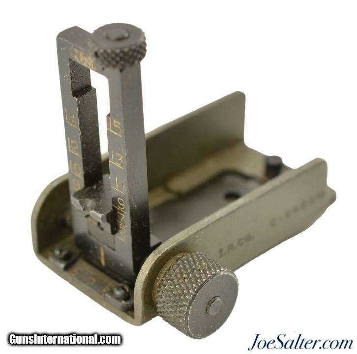 Description: This is an original Browning Automatic Rifle 1918A2 rifle rear sight in excellent condition with very little signs of use, most of the lettering is still clear and readable. This sight was also used on the Browning M191A4 machine gun. The windage and elevation adjustments work smooth and free (300 to 1500 yards). All the major components are marked I.R.Co. for the International Register Company. The sight ladder is stamped C64208 and CAL. 30 M2, the side is stamped C-64231A. Again this sight is fully functional is in excellent condition. SOLD |