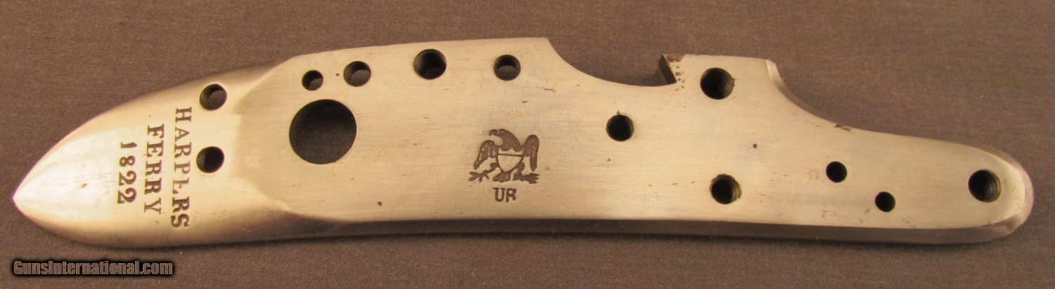 Description: This is an 1822 dated, original lock plate that has been nicely polished to armory bright and has crisp edges and markings including: “(eagle)/US” and “HARPERS/FERRY/1822”. The reverse of the plate has some light tool marks surrounding the curved pan cut and is extensively marked: “JV(or W)”, “S”, and “1”. The plate is in fine condition and would make a very nice decorative accent. SOLD Manufacturer: Harpers Ferry Model: 1816 |