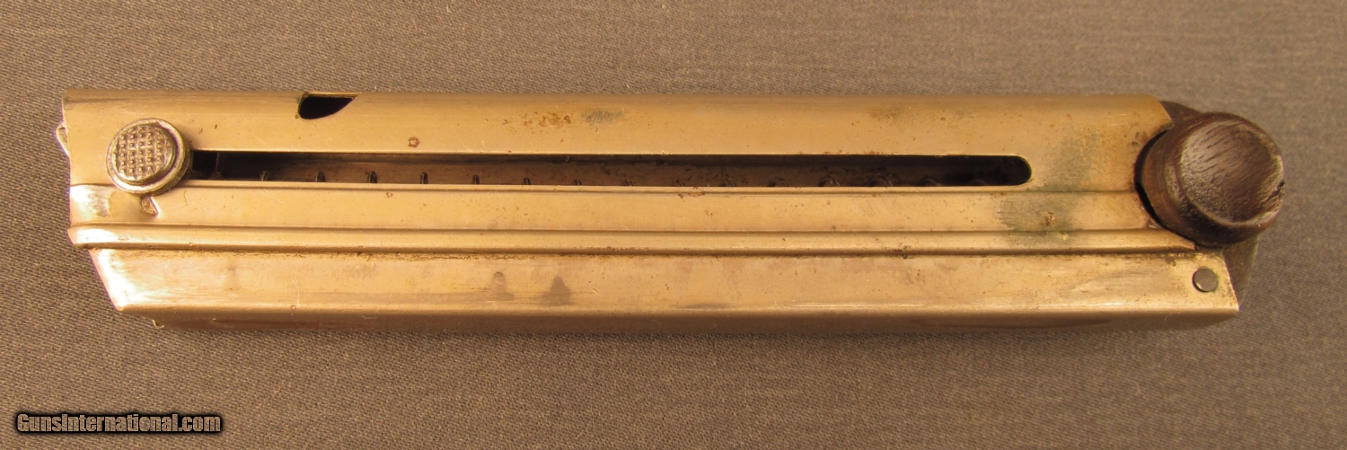 Description: This magazine is numbered 7190 over M over + and remains in very good condition with a couple small chips in base. Spring remains strong. SOLD Manufacturer: German Model: Luger Caliber Info: 9mm Gauge Info: 9mm |