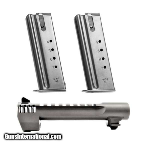 Description: BRAND NEW IN THE BOX AND READY TO SHIP! BUY IT NOW!! Manufacturer: Magnum Research Item: Desert Eagle Caliber Conversion Kit (.44 Magnum to .50 AE) SKU: BMCP506TUIMB Caliber: .50 AE (Action Express) Magazines: (2) 7 Round Barrel Length: 6" w/ Integral Muzzle Brake Picatinny Optics Rail Finish: Tungsten Cerakote Convert your Mark XIX Desert Eagle .44 Magnum to .50 AE with this conversion kit! Conversion kit includes one Desert Eagle .50 AE Barrel and (2) 7 round Magazines. This barrel is designed to work in conjunction with Desert Eagle Mark XIX's. It can be used either as a factory replacement part or as a caliber conversion package. Over the past 29 years MRI has been responsible for the design and development of the Desert Eagle pistol. The design was refined and the actual pistols were manufactured by Israel Military Industries (IMI), subsequently shifted to Israeli Weapons Industries (IWI) until 1995, when MRI moved the manufacturing contract to Saco Defense in Saco, Maine. In 1998, MRI moved manufacturing back to IWI. Both Saco and IMI/IWI were strictly contractors: all of the intellectual property, including patents, copyrights and trademarks are the property of Magnum Research. Since 2009 the Desert Eagle Pistol has been produced in the USA at MRI's Pillager, MN facility. KNOW YOUR LOCAL AND STATE LAWS!! ORDERS WILL ONLY BE ACCEPTED FROM US RESIDENTS OF THE LOWER 48 STATES, ALASKA AND HAWAII. OUR FFL CLASS DOES NOT ALLOW FOR THE EXPORT OF FIREARMS, THEREFORE WE CANNOT SHIP OUT OF THE US. IF YOU ARE INTERESTED IN PURCHASING THIS ITEM, PLEASE COMPLETE YOUR ORDER BY REFERRING TO THE "SELLER'S INFORMATION" ABOVE. SOLD |