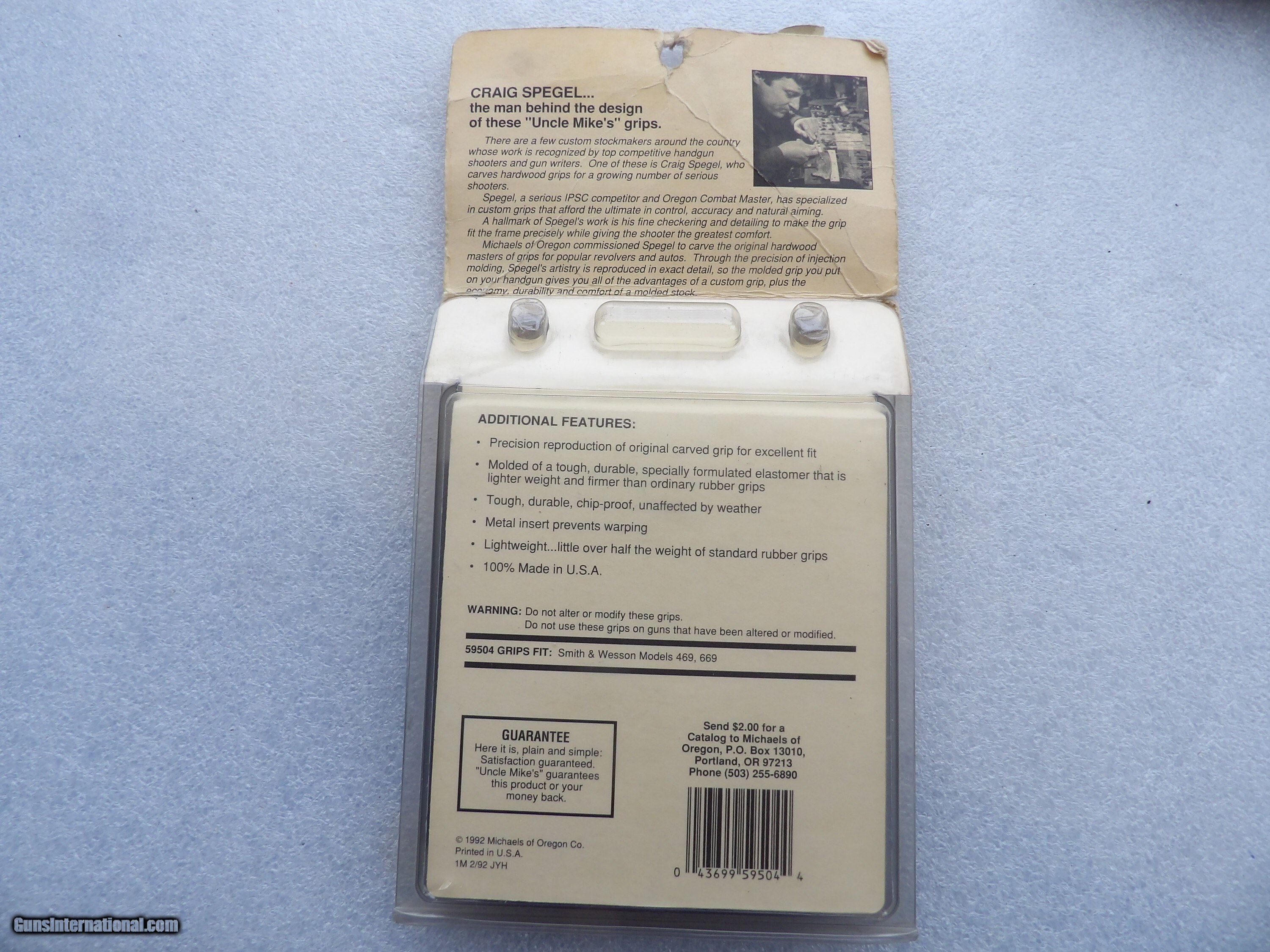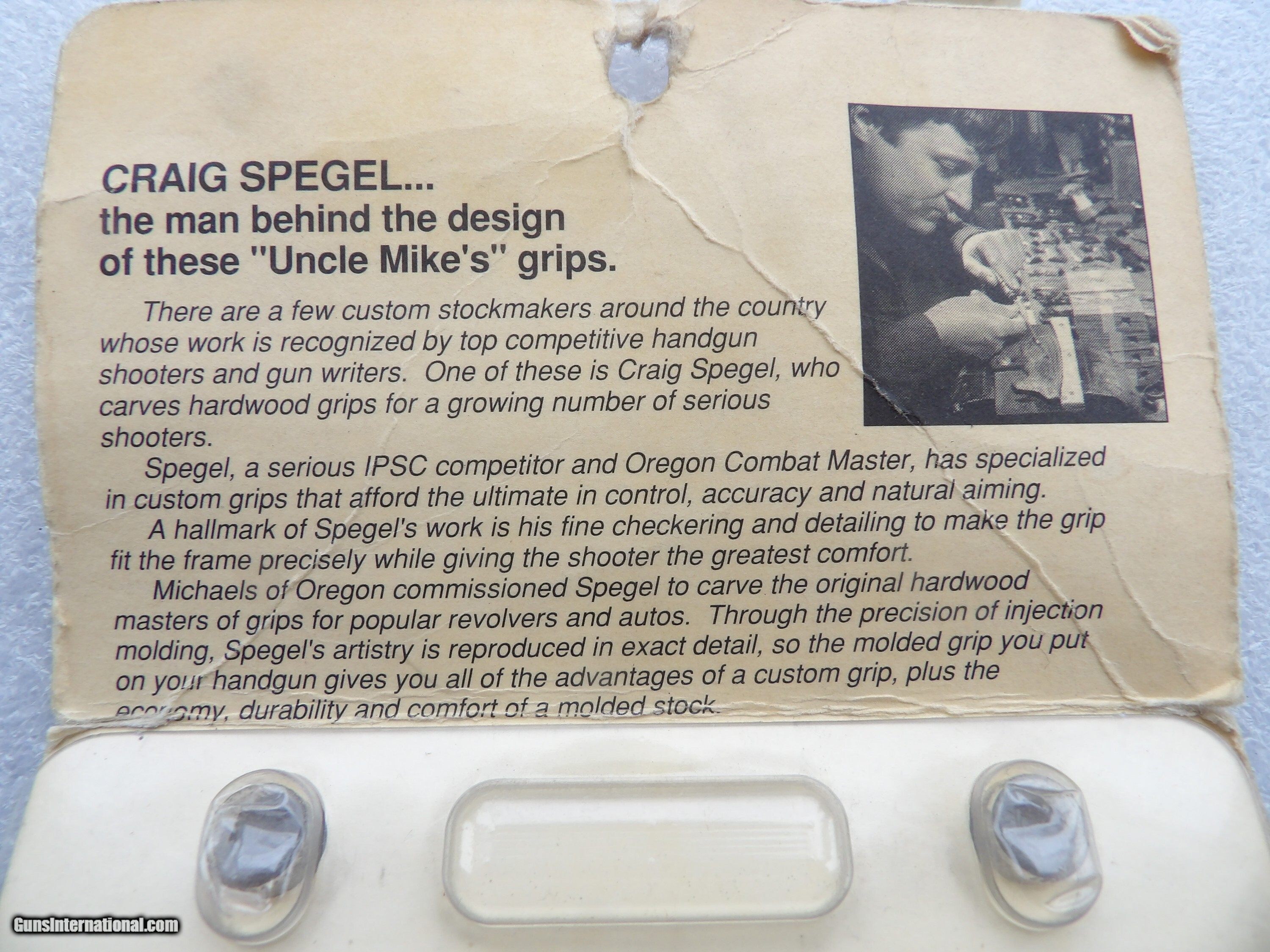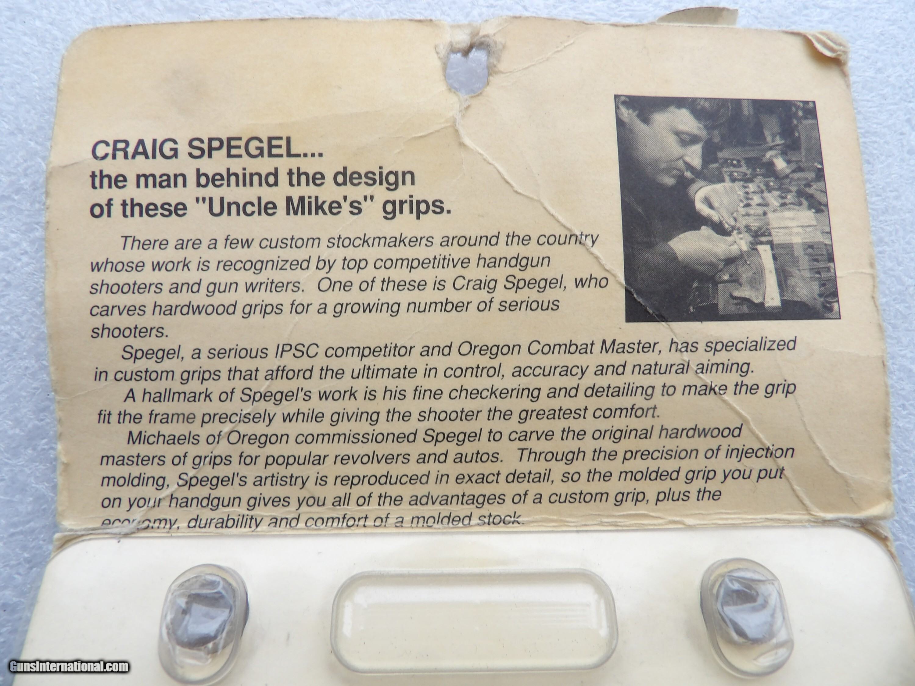 Description: See the pictures of: The image displays the packaging for "Uncle Mike's" handgun grips, designed by Craig Spegel. The text describes the product's features, fit, guarantee, and company information.