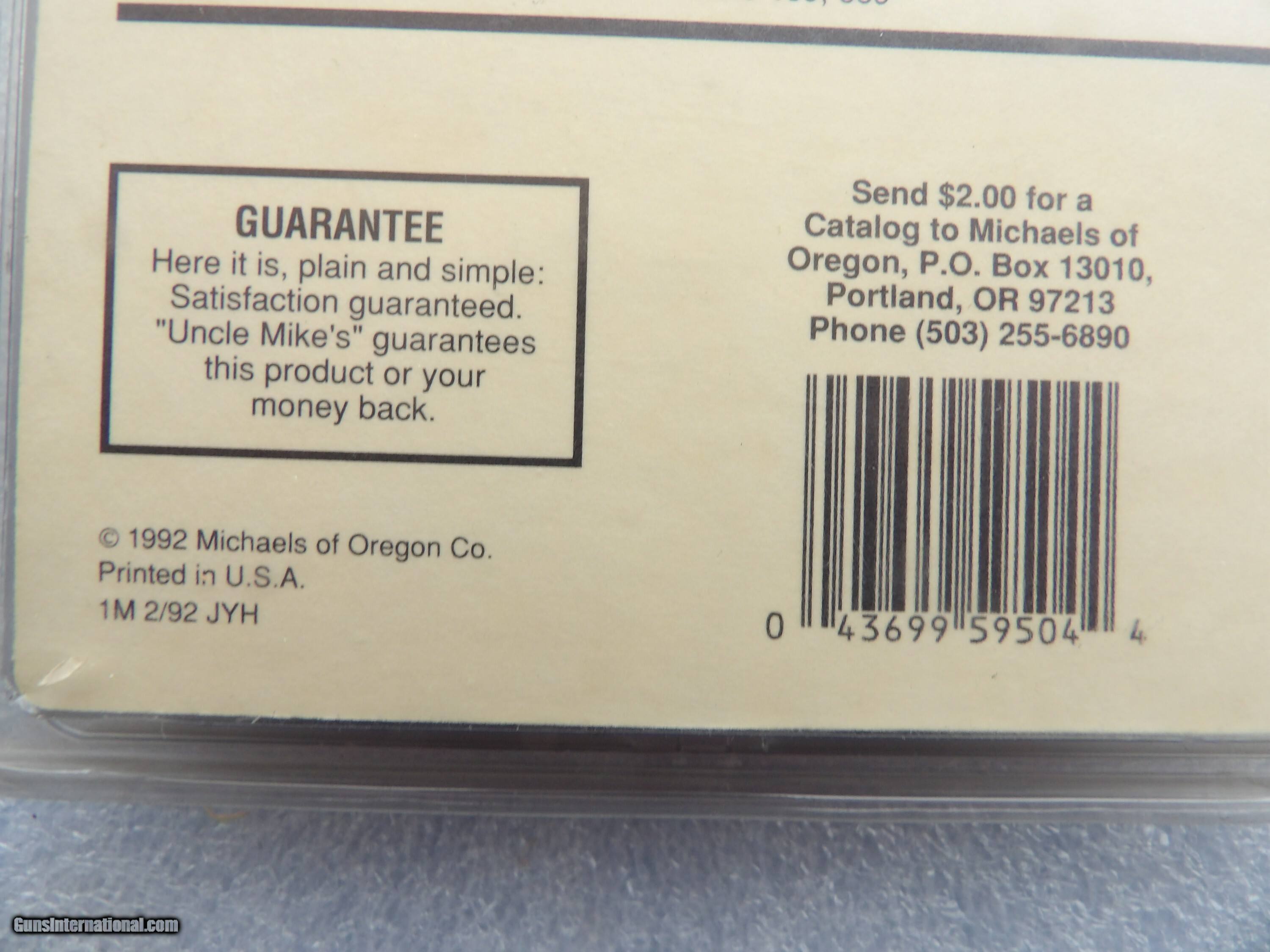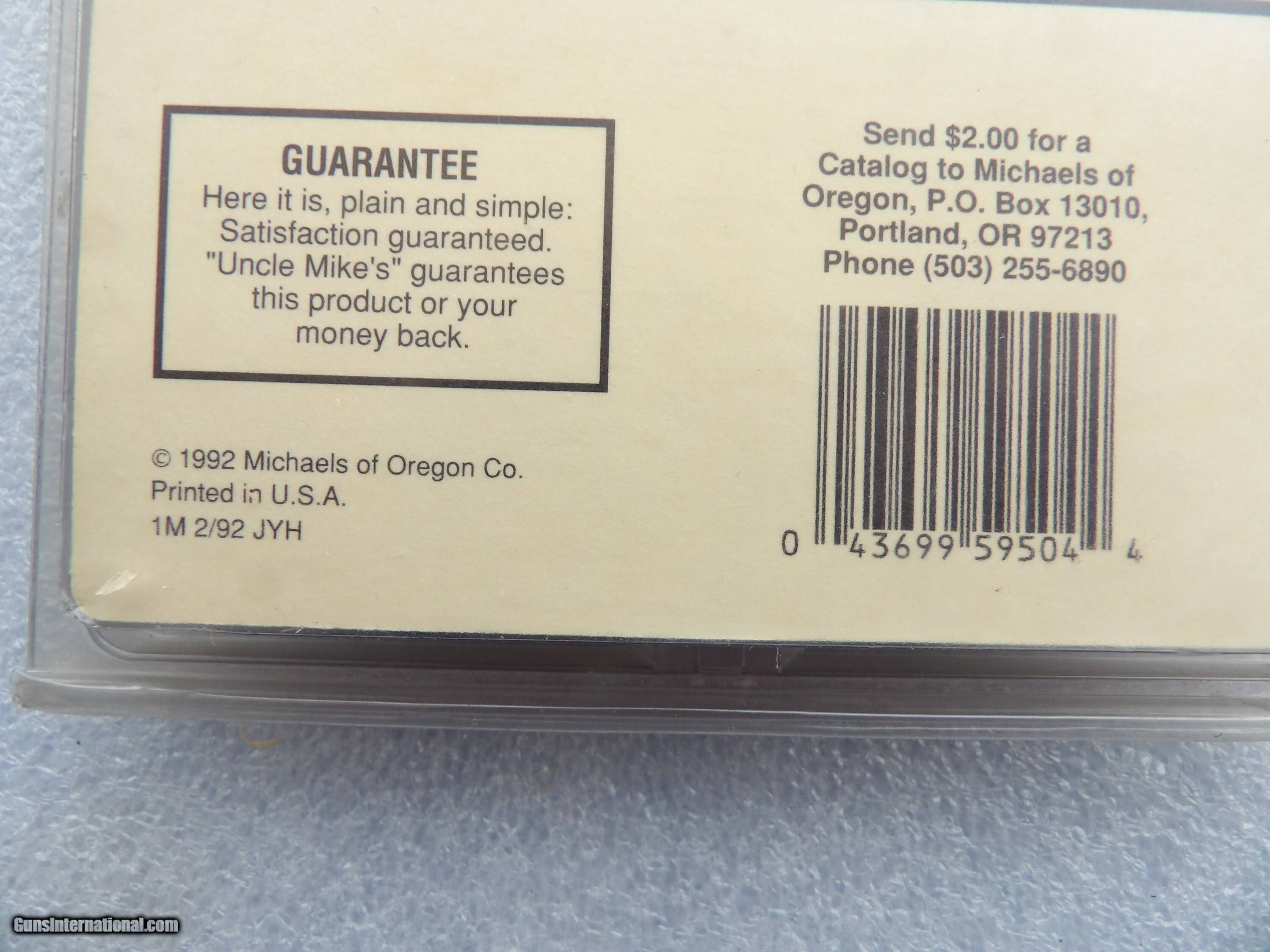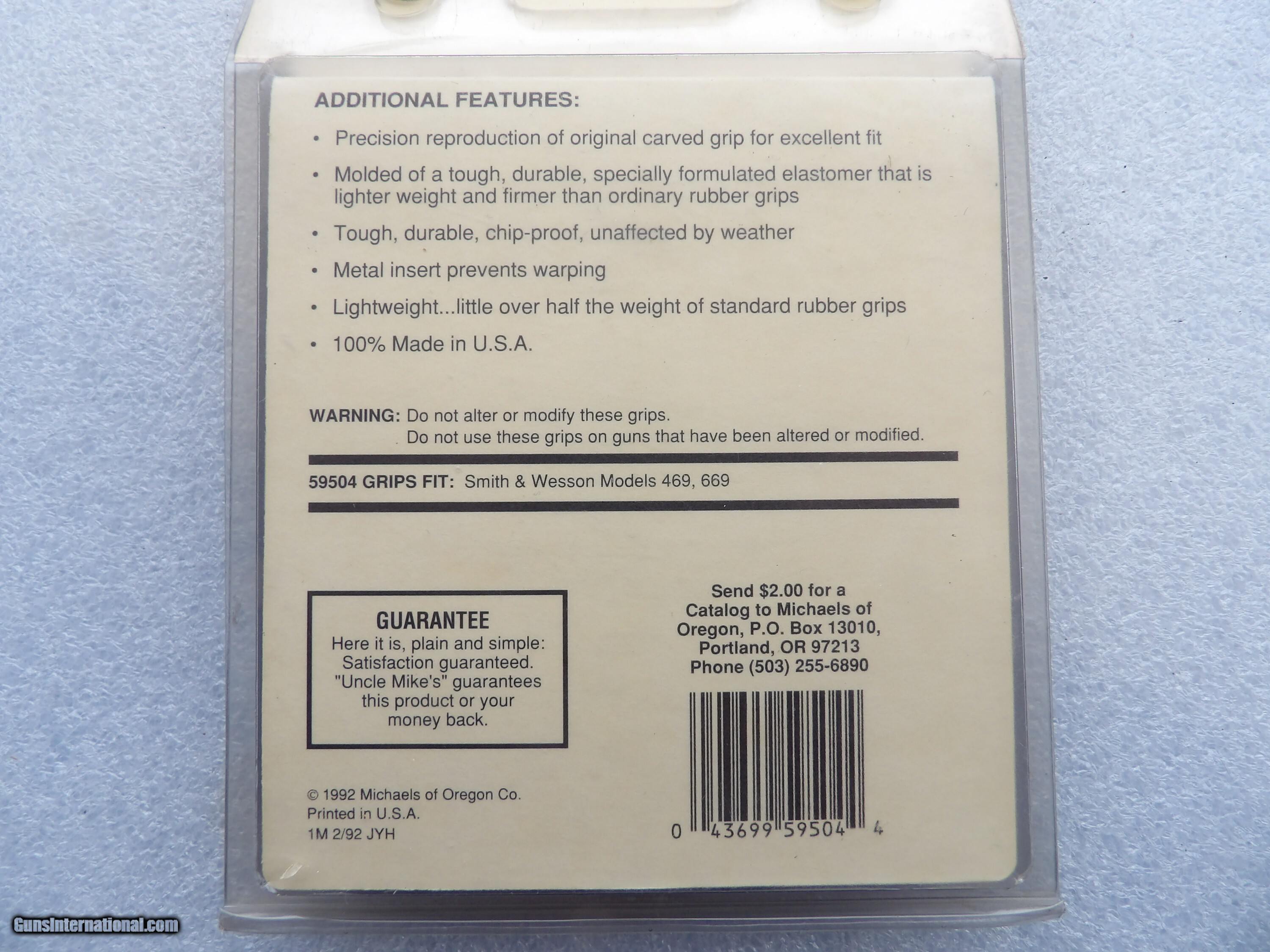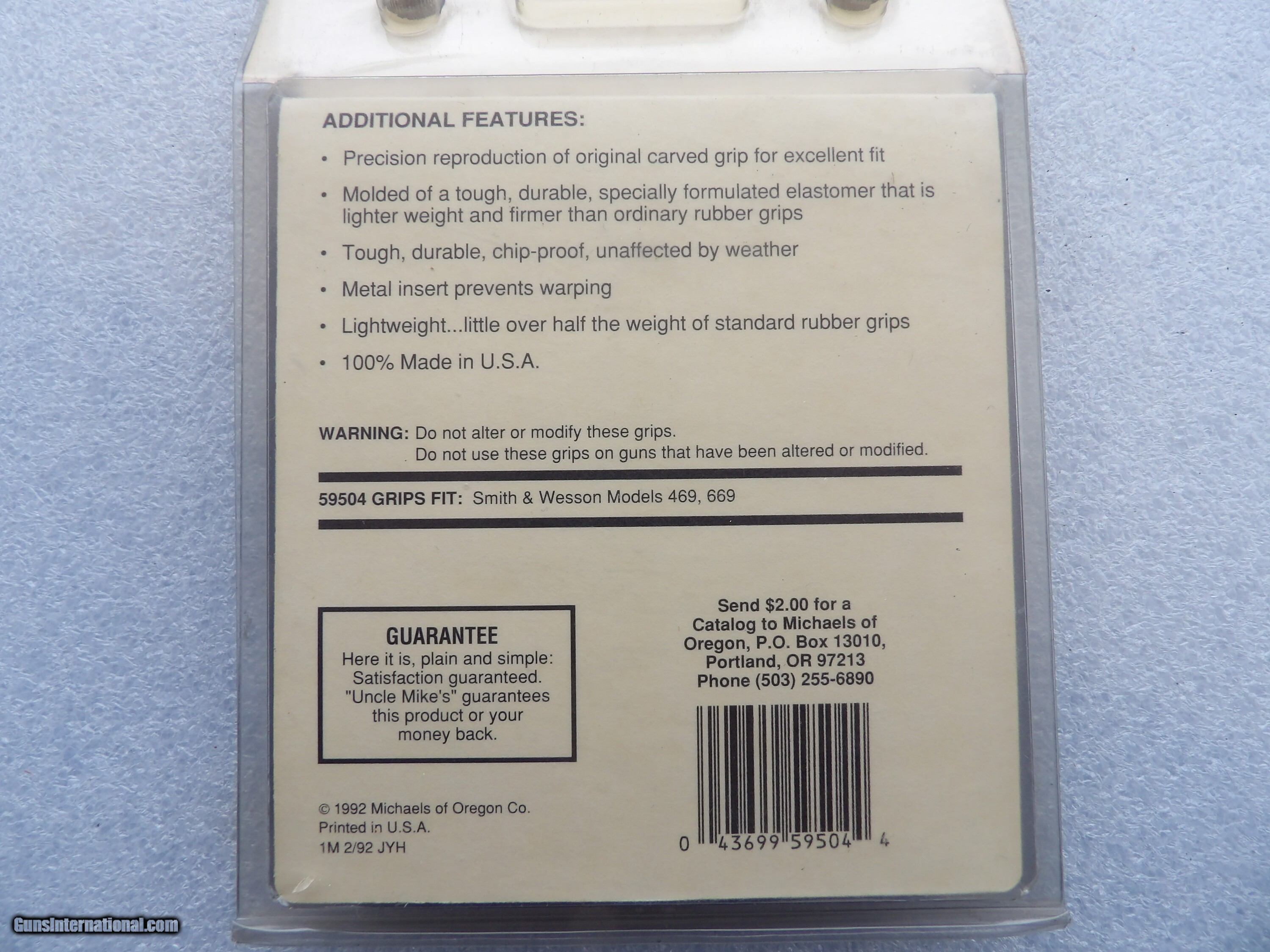 Description: See the pictures of: The image displays the packaging for "Uncle Mike's" handgun grips, designed by Craig Spegel. The text describes the product's features, fit, guarantee, and company information.