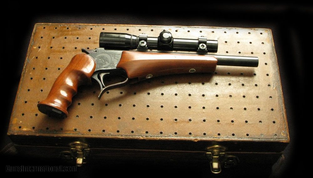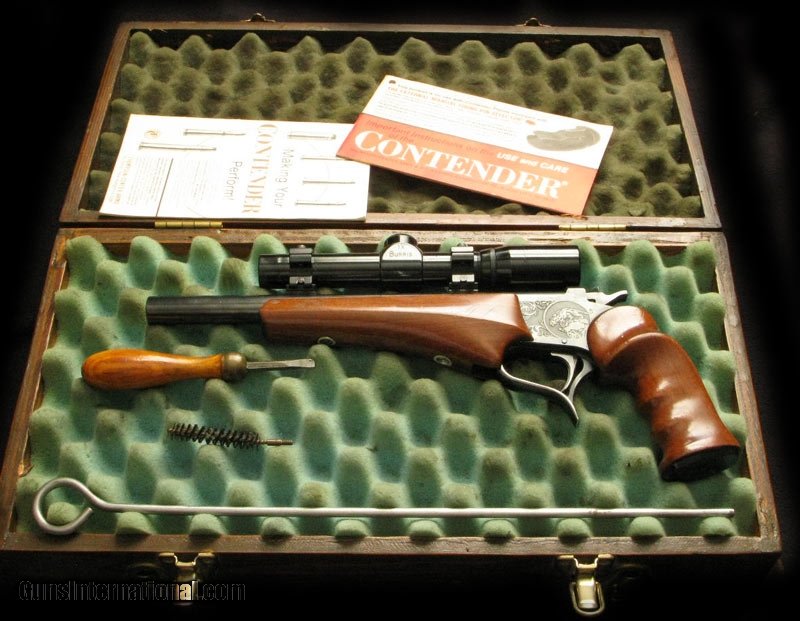 Description: Custom sightless 11.5" barrel (not factory) w. excellent bore, Burris 1x dot reticle LER scope in Weaver-type rings on separate Weaver bases, mounted forwards so as not to interfere with the breech and hammer. Two hole forend may also be custom. Grip cap has a hole drilled into it to allow easy access to grip screw. Includes turnscrew and cleaning rod with brush, TC literature that appears to be period. Wood case pictured is not included but listed separately. SOLD |